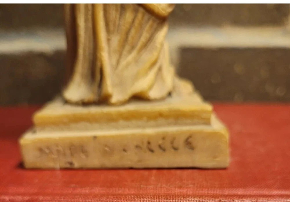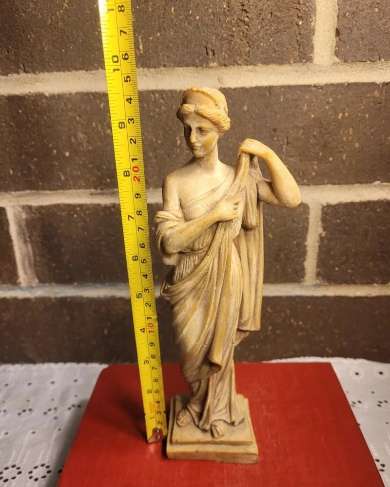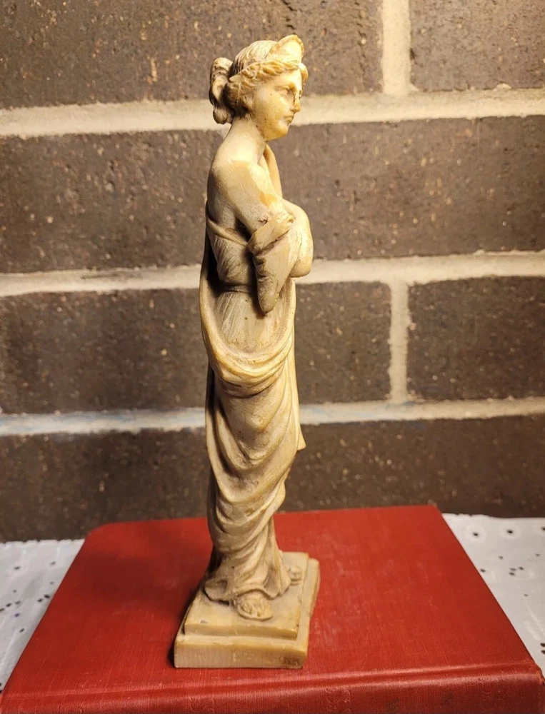 The product is a Vintage Resin Greek Goddess Sculpture, measuring 9.5 inches. It is a sculpture made of resin material, depicting a Greek goddess.