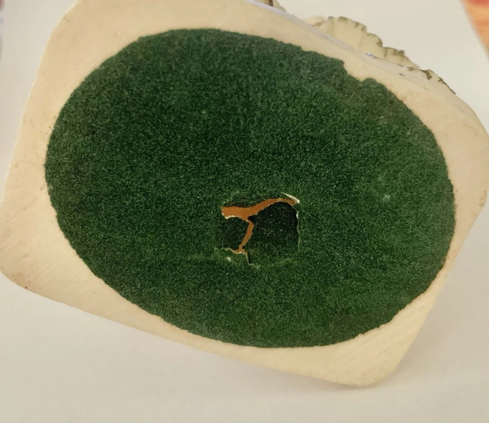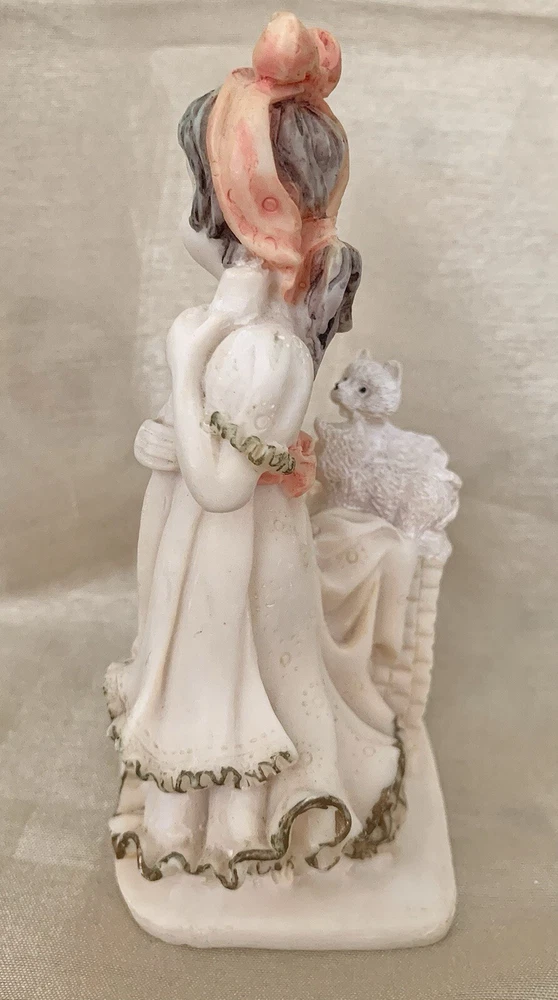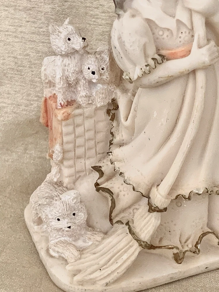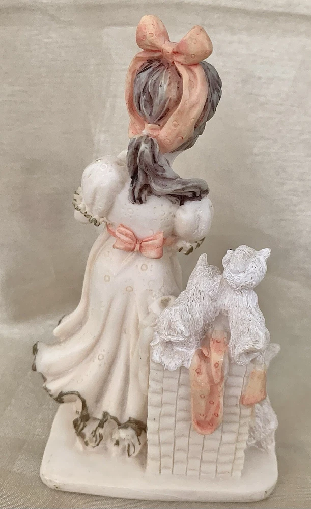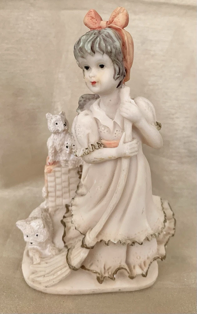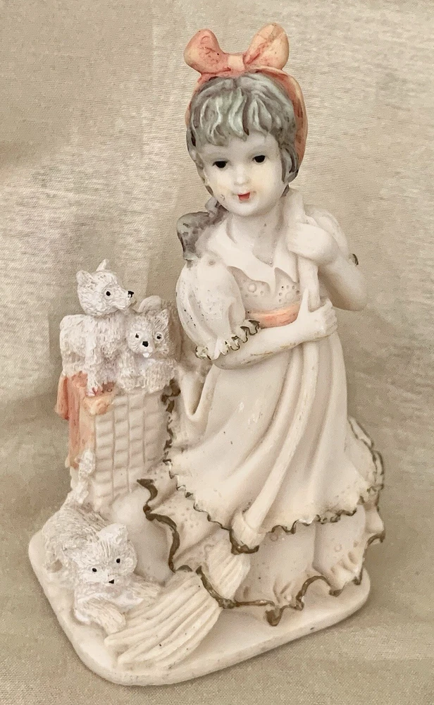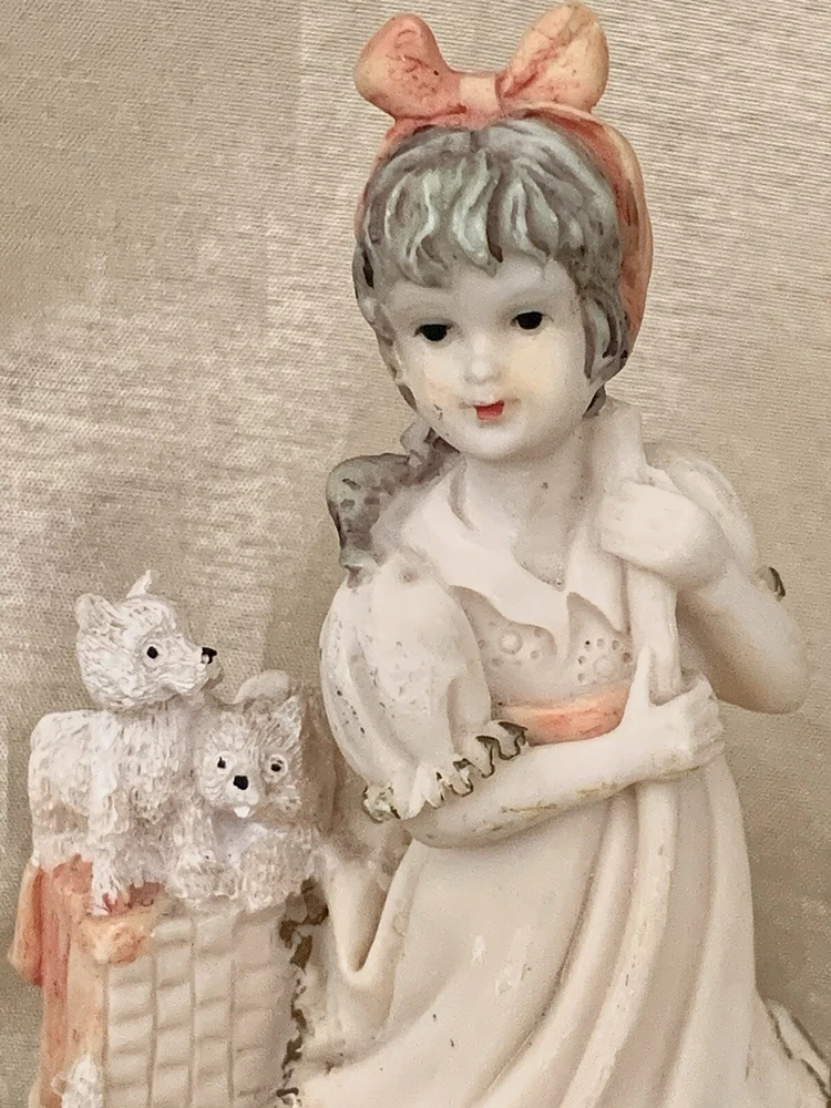 Sweet little girl is sweeping and has 3 pups looking after her. This is an ivory color, resin figurine. She has antique gold trim on her dress with pinkish accents. Her dress also has an eyelet appearance. Green felt on the bottom. Minor vintage wear. Measures approx 5”H and 3” W. Cute.