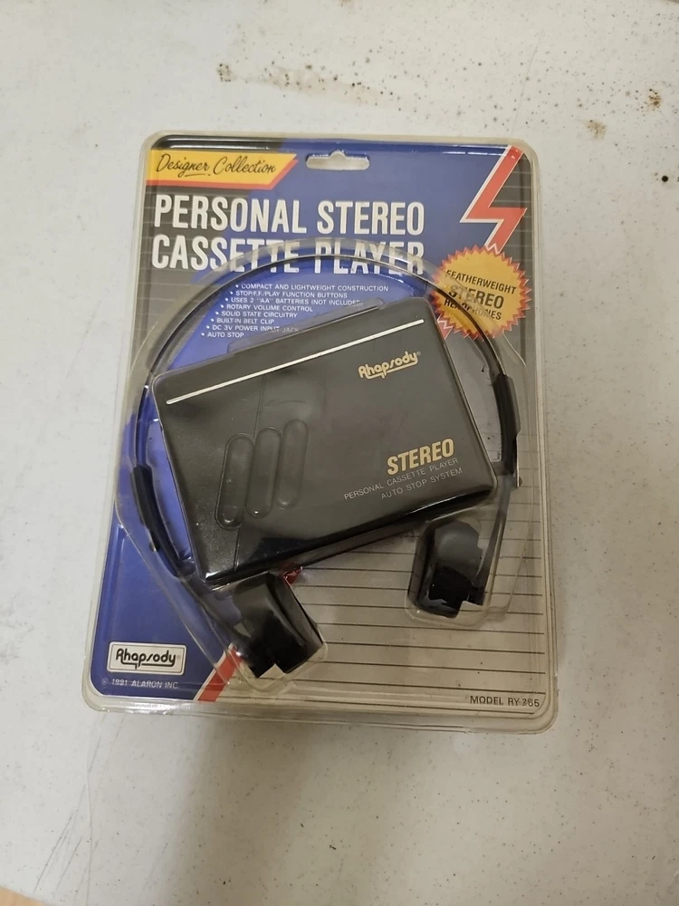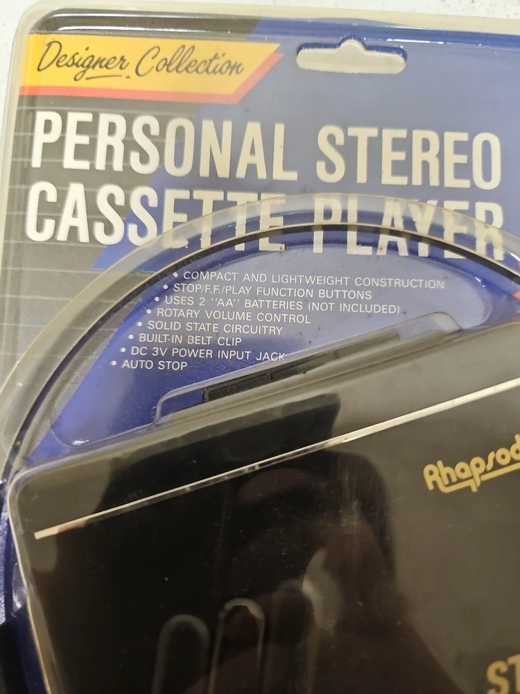 This vintage Rhapsody portable cassette player is perfect for those who love the classic sound of cassette tapes. It features an AM/FM band and a headphone jack for easy listening on the go. The unit is in great shape and ready to use. With its sleek black color and compact design, this cassette player is perfect for any music lover. It comes with an auto stop system and a DC 3V power input jack for easy operation. This unit is a must-have for any collector or music enthusiast who wants to experience the nostalgia of classic music.