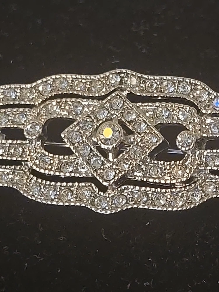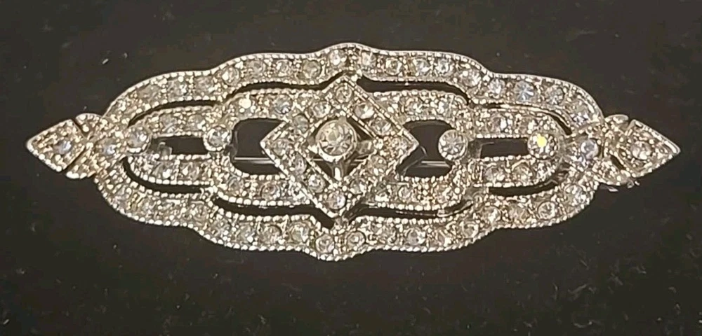 This Vintage Rhinestone Brooch Pin is a stunning piece of jewelry featuring a rectangular shape with a round white crystal as the main stone. The brooch has a Victorian and Art Deco design, measuring 2.5 inches in length. It is rhodium plated and showcases retro beauty, making it ideal for various occasions like engagements, anniversaries, birthdays, and more. This vintage piece is a lovely addition to any fashion collection.