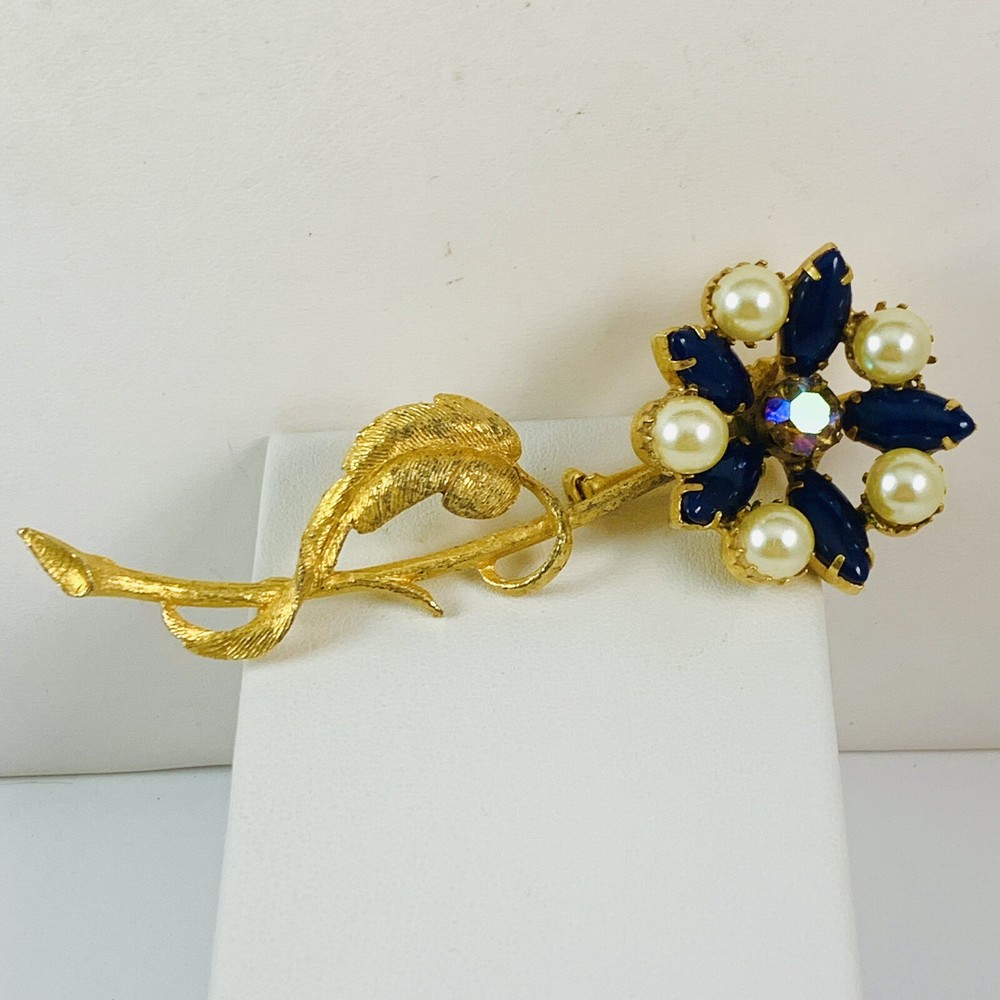 Gorgeous Vintage Long Stem Faux Pearl Navy Blue Glass Cabochons with a Aurora Borealis Rhinestone Center Gold Tone Flower Brooch. Pre-Owned Estate Jewelry in Very Good Condition. Ready to wear, give as gift or add to a collection. Our Vintage items are mostly from estate sales and vary in age from 100+ years old to more modern pieces. Please use your judgement. Items are photographed on a measuring matte with one-inch squares to give you an idea of size. Any photography props / holders you see are not included.