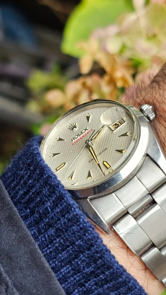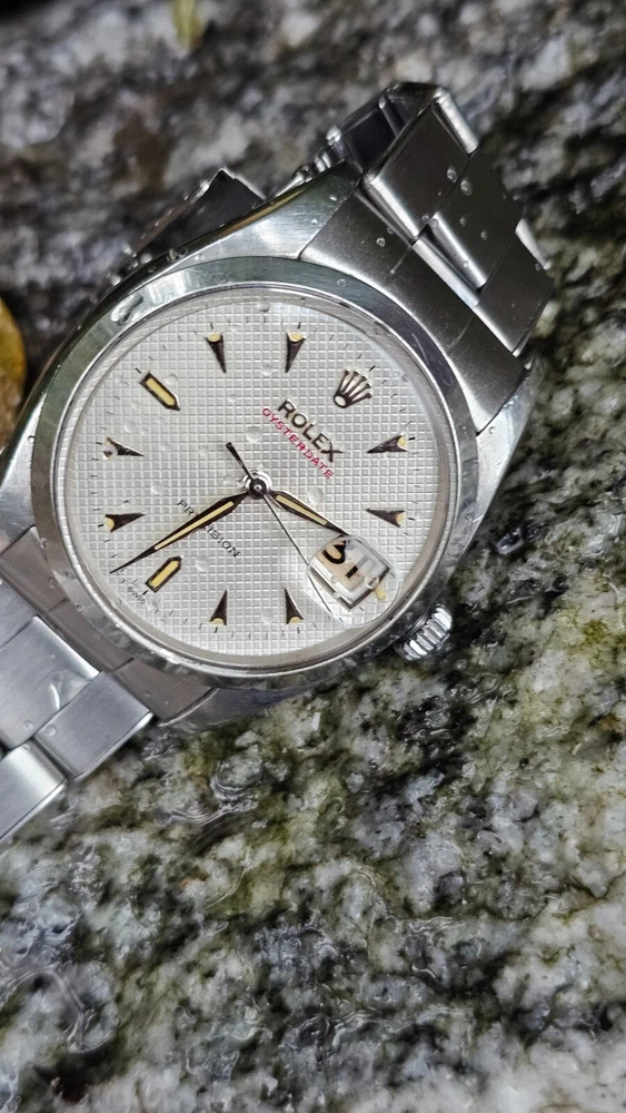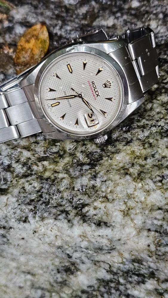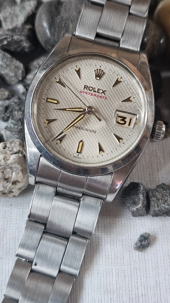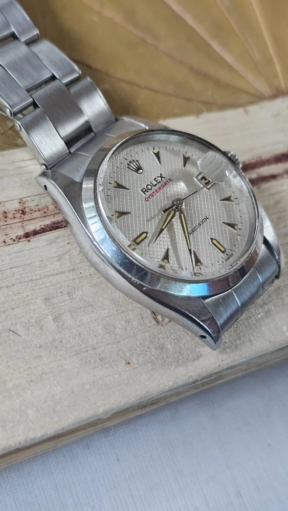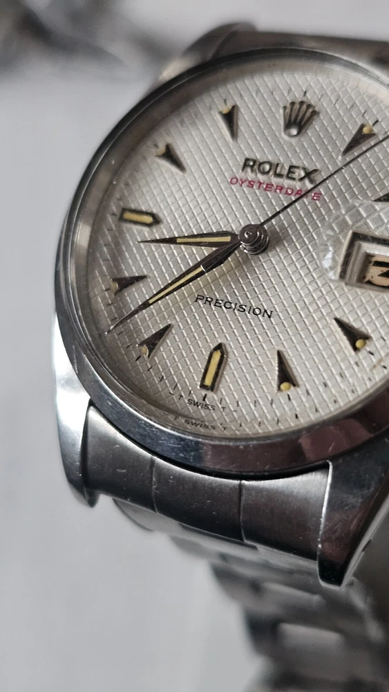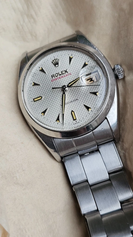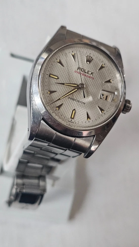 This vintage Rolex Oysterdate men's wristwatch features a classic round shape with a silver stainless steel case and smooth silver bezel. The dial pattern is a stylish honeycomb design with arrow markers and a date indicator. The watch has a mechanical (manual) movement with 17 jewels. The watch is from the 1950s and has a screwback caseback. It comes with a Rolex Oyster band/strap with a lug width of 19 mm and a maximum wrist size of 7.26-7.5 inches. This Swiss-made timepiece is a true vintage gem and would make a great addition to any watch collection. I am so proud of being able to offer you a gorgeous vintage Rolex Oysterdate Precision Ref.6494 men's hand-winding watch. With Honeycomb silver dial which has been refurbished / repainted professionally and looks so handsome and smart. Refurbished on original Rolex dial The stainless steel Oyster case, screw down caseback, smooth stainless steel bezel and crystal are all in good condition for its age. The dial is fitted with silver hands and a date window at 3 o'clock position which is a great asset to this vintage. The robust 34mm stainless steel Oyster case with a screw down Rolex crown and Rolex Oyster bracelet have remained in good condition with general wear but no significant damage. In fully working order- runs strong and tells good time, powered by a reliable Rolex manual movement with 17 jewels. Reference and serial numbers are both present and visible. The original Rolex bracelet will fit up to 7.5 inches wrist. You will get exactly what you see. The pictures say it all. Please check all my pictures for more details as they are the best description of the watch much better than I could. I will ship the watch to your door using FedEx International Priority. Expected to arrive in 3~5 days of shipping. No box or papers are included. I do accept PayPal, Sir..... Please note, the buyers are responsible for import and duty fees. I am so grateful you have visited my E-house. Thanks for your attention !!