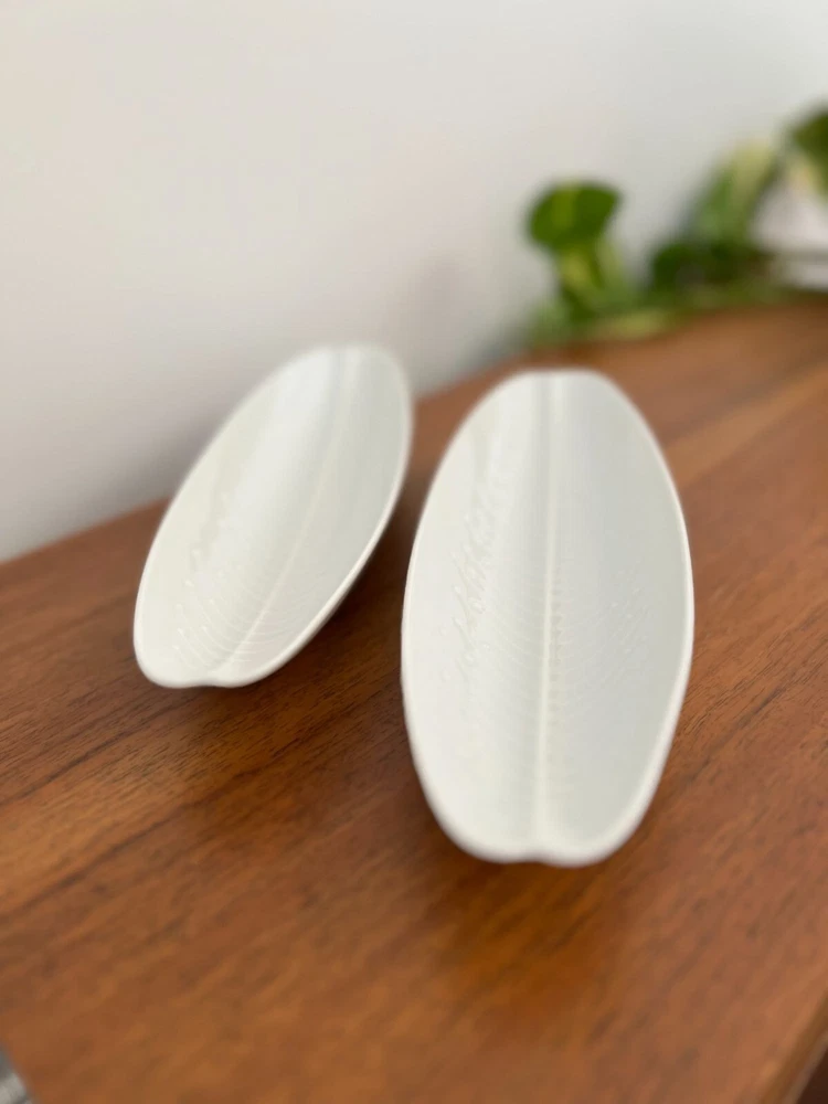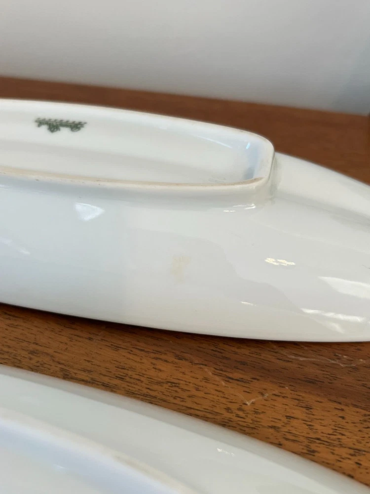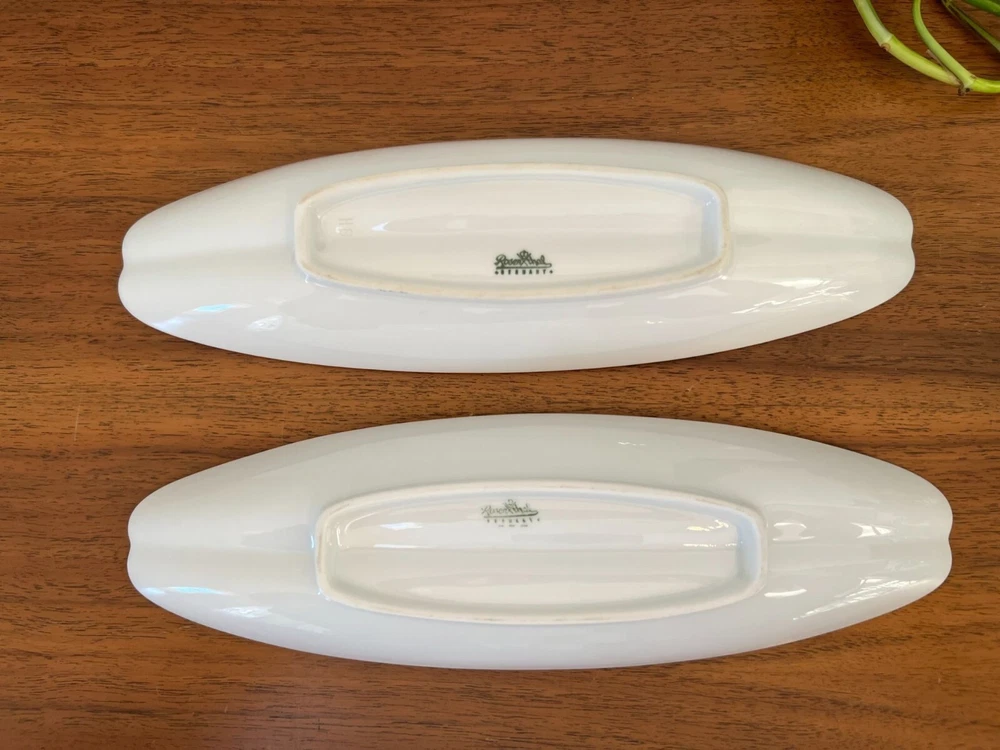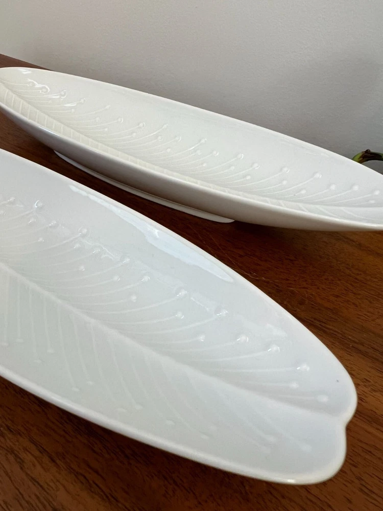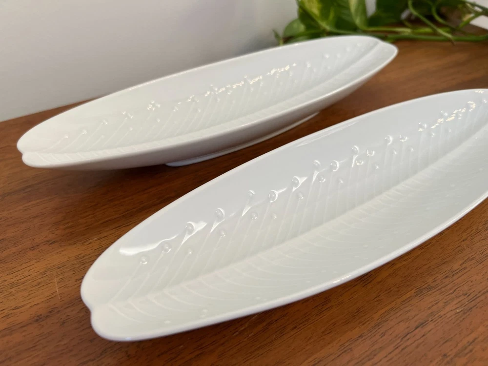 This listing is for a set of two (2) Karelia plates designed by Finnish designer Tapio Wirkkala for Rosenthal. A modern interpretation of a leaf, these plates are perfect in any decor. In great condition. One has a small stain on the underside, shown in photos. Sold as is. See photos. Approximate dimensions are: 11" x 3.5" Returns 30 days. Buyer is responsible for return shipping costs and any loss in value if an item isn't returned in original condition.