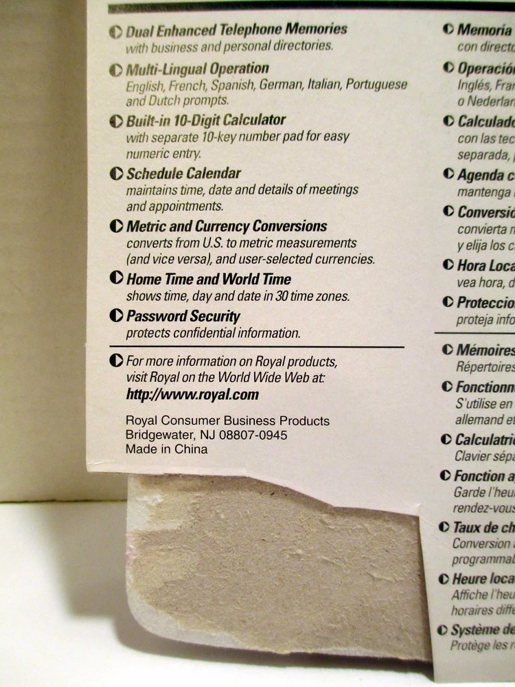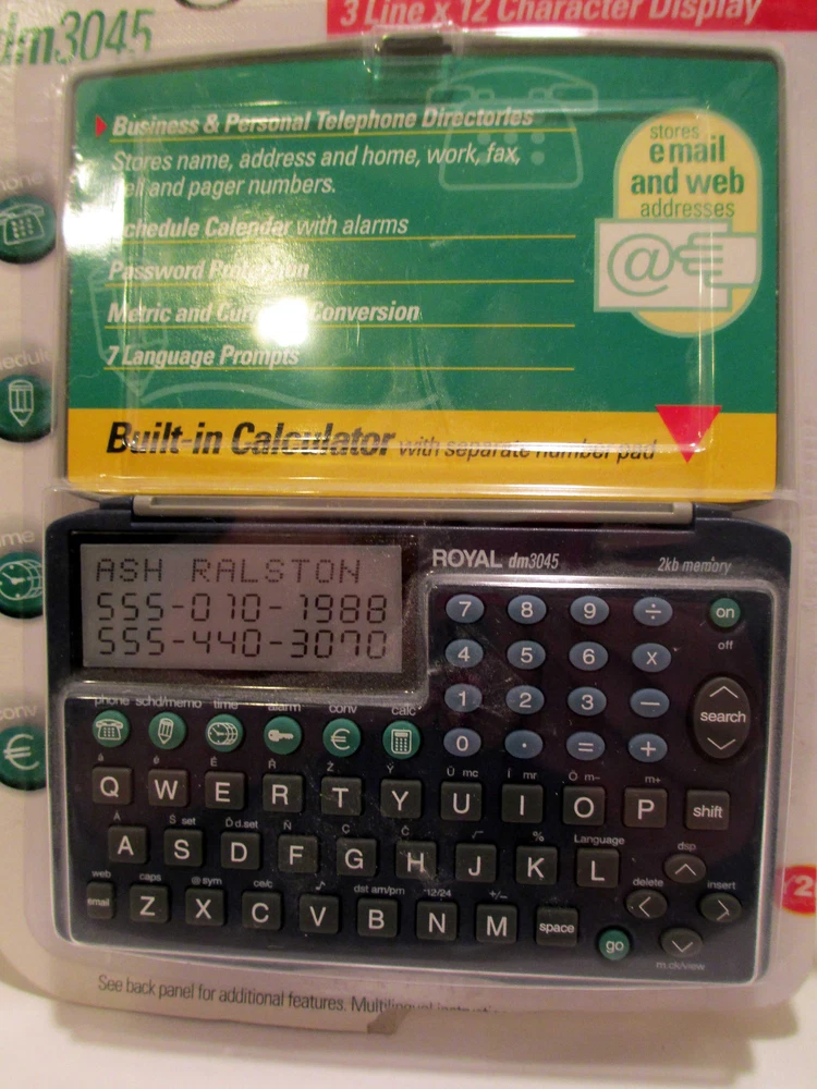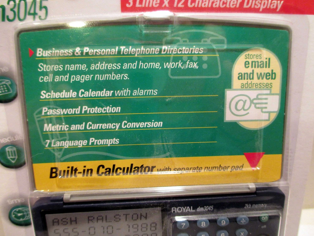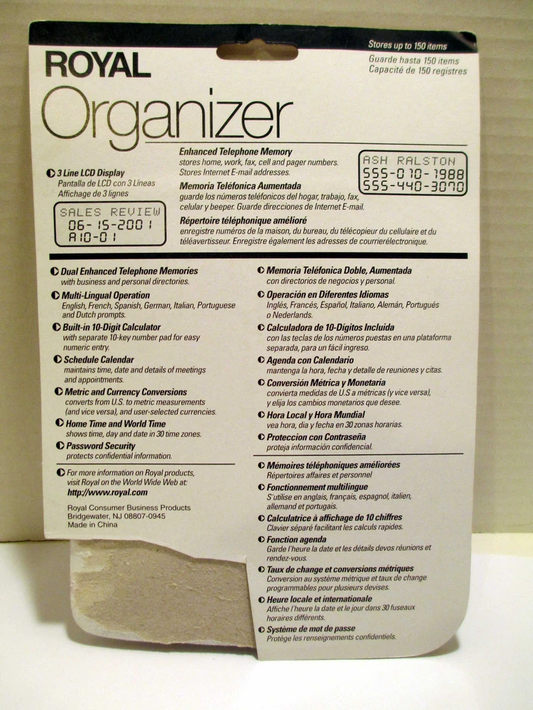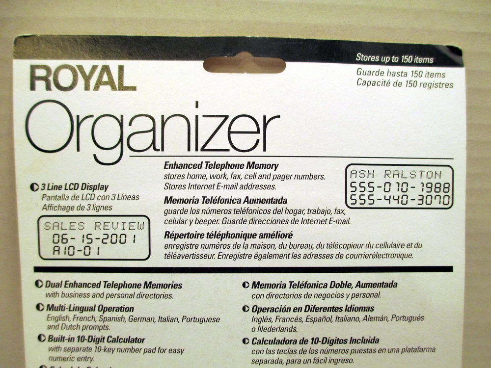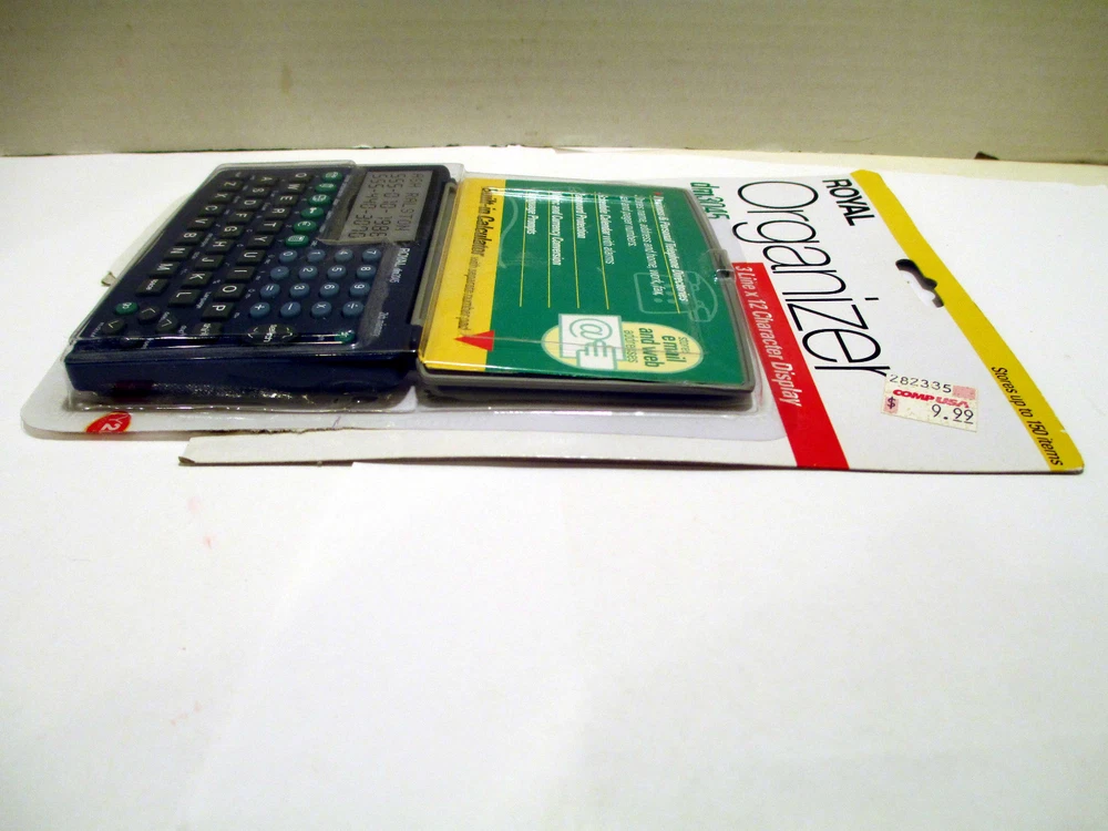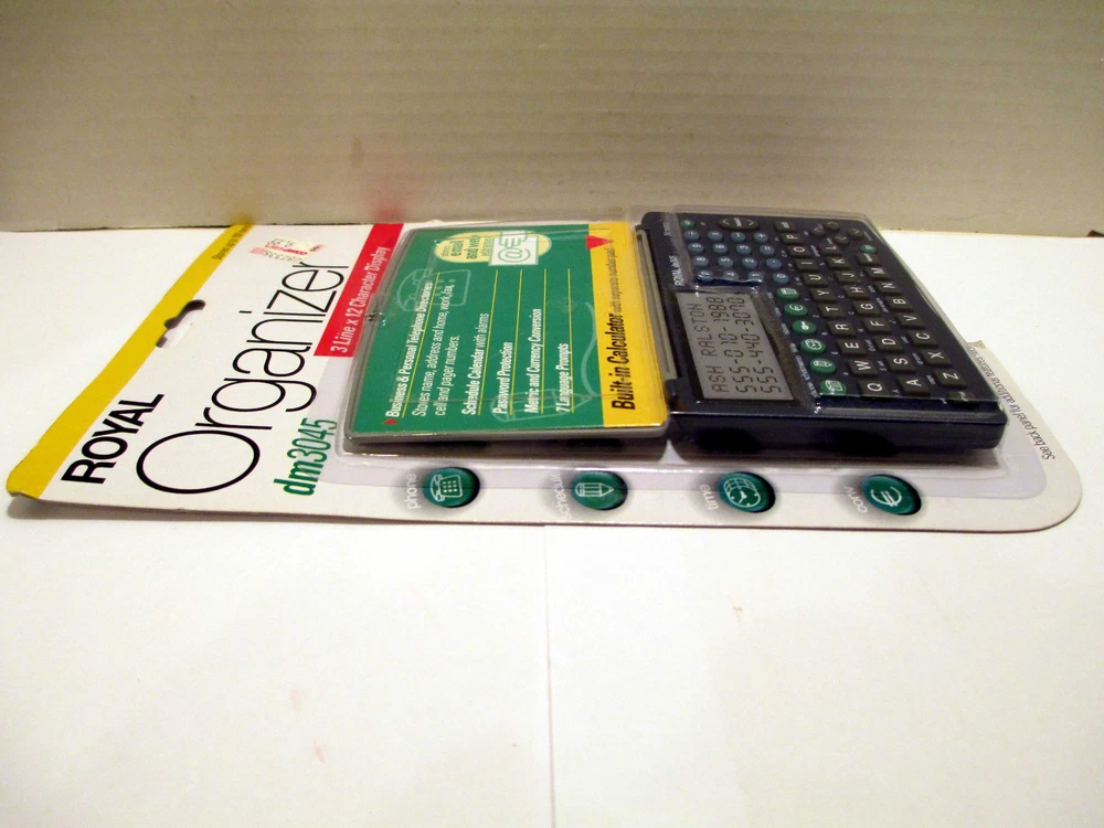 This is a Rare Vintage Royal Organizer dm3045. Business & Personal Telephone Directories, Schedule Calendar with Alarm, Password Protection, Metric and Currency Conversion, 7 Language Prompts and Calculator. 3 Line x 12 Character Display and 2kb of Memory. By Royal Consumer Business Products. Made in China. Circa late 1990's. Unit in factory sealed blister pack. Has a Y2K Compliance mark on the bottom right corner of package. The organizer measures 4 5/8" long, 3" wide and about 3/8" thick. Disclaimer: No mention of batteries on the package, if batteries are included, they are probably dead by now and need replacing. They may have also leaked, no way of knowing without opening the package. The packaging is in very good condition except that the UPC code has been cut off - probably for a mail-in rebate. Original CompUSA price tag on front. P lease look closely at all the photos for the condition details and judge for yourself. Please ask questions if something is not clear. Reserve Bid Price = $19.99 - FREE SHIPPING! ATTENTION ALL BUYERS Please NOTE the following sales conditions: 1. No International shipping. I Ship in the United States ONLY to a U.S. Verified Address. 2. Sales Tax is Charged by eBay to buyers based on the applicable tax laws of their state. 3. Payment is due within 4 days of sale. If you need more time to pay, please contact me. Unpaid orders will be canceled after 4 days. Please review the photos and descriptions carefully. If something is not clear to you, please ask questions BEFORE bidding or buying. Upon receipt, please examine your item carefully. If there is an issue with the item, please Contact Me immediately. I will work with you to resolve any problem. Please don't just leave negative or neutral feedback because you are unhappy with what you received, Contact Me first. I strive to deliver 100% satisfaction to all my customers. Thank You.
