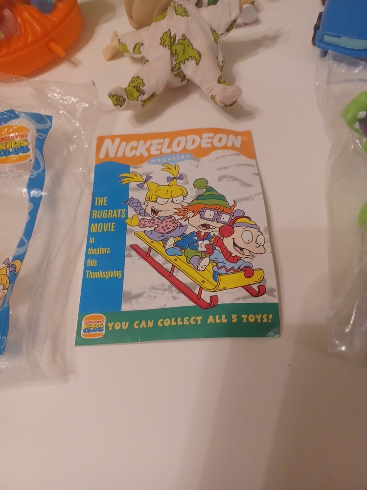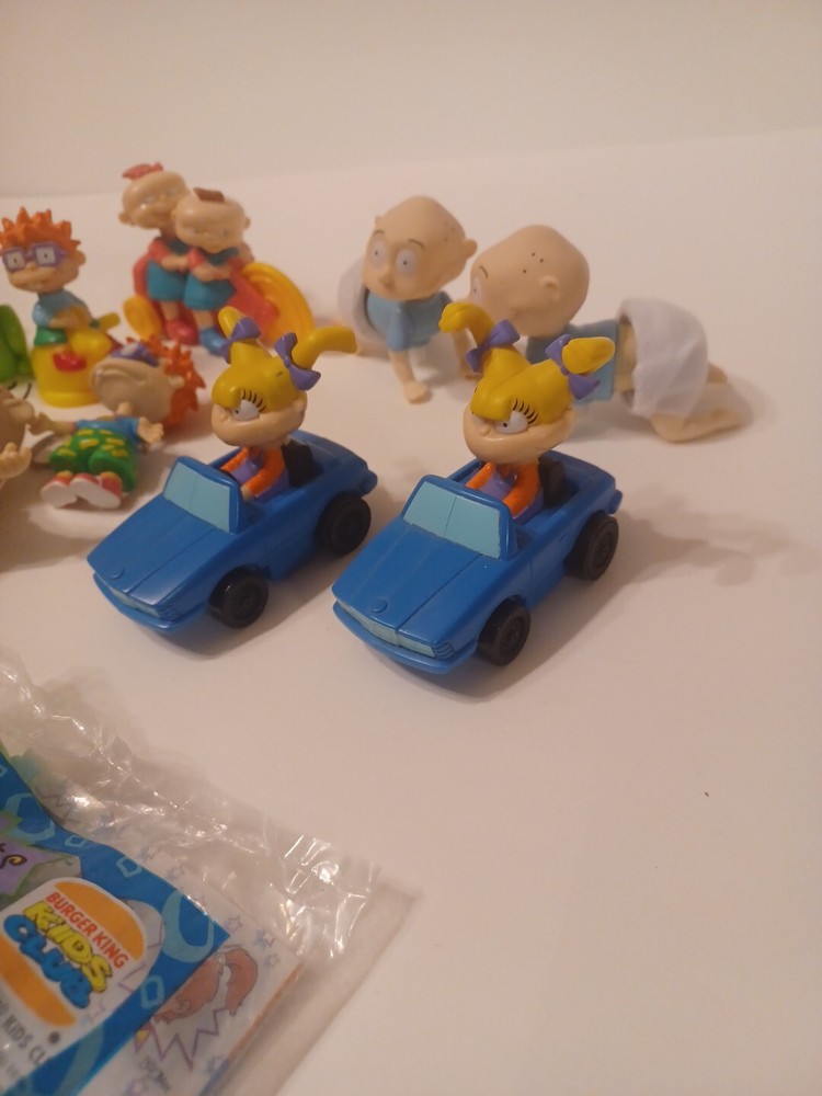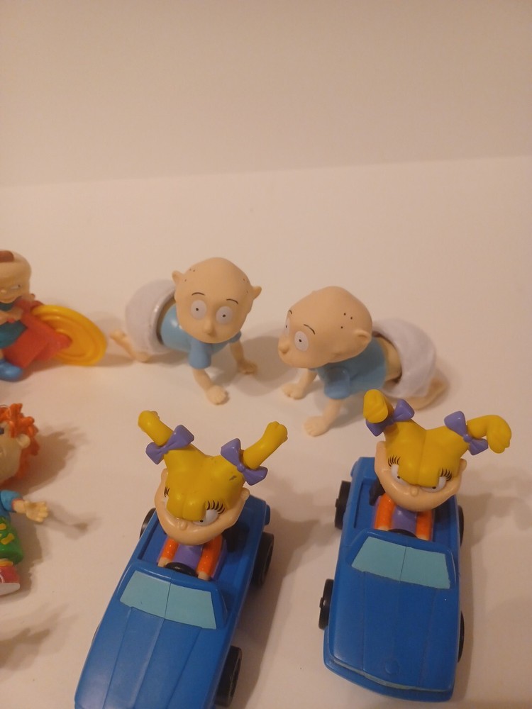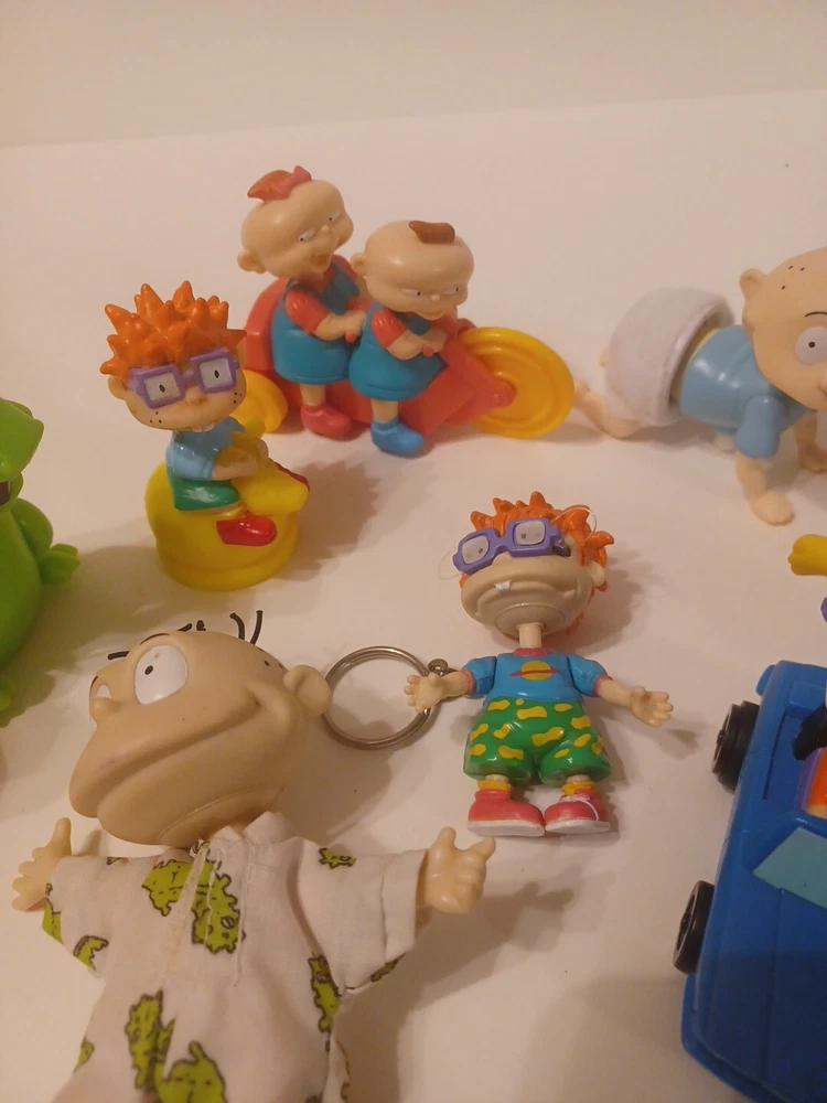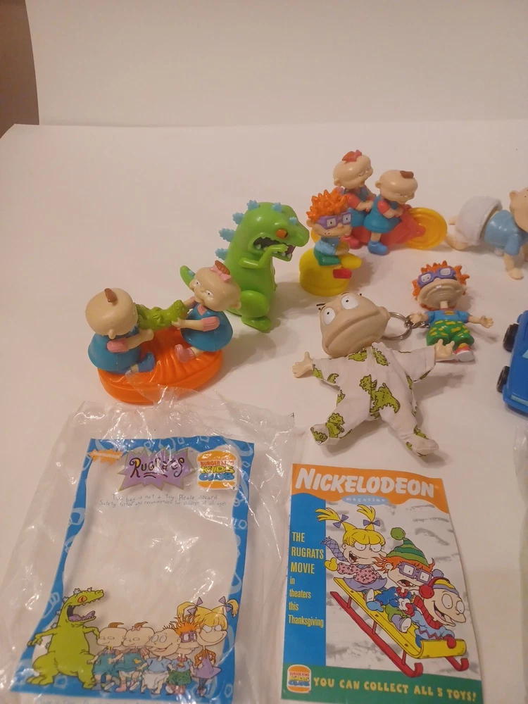 Lot of 11 rugrats burger king toys from the late 90s. They wind up but are very weak. Would make a good edition to a shelf or for a collection. There is a chuckie keychain I'm not sure where he's from but don't believe he was a bk toy.