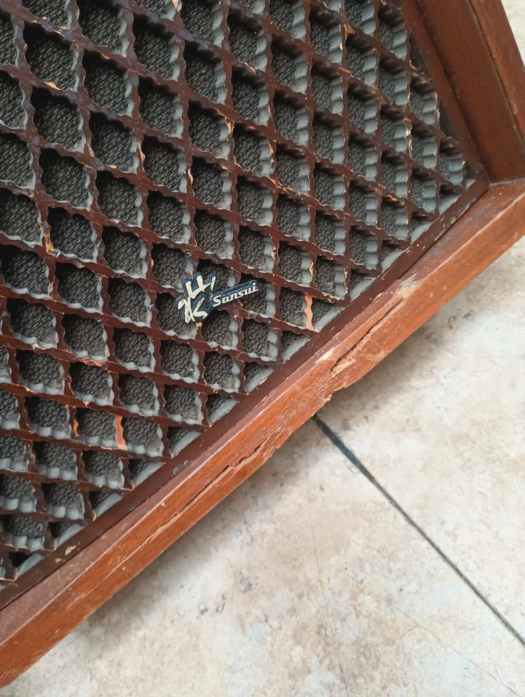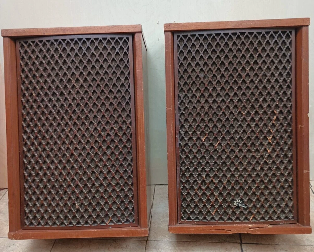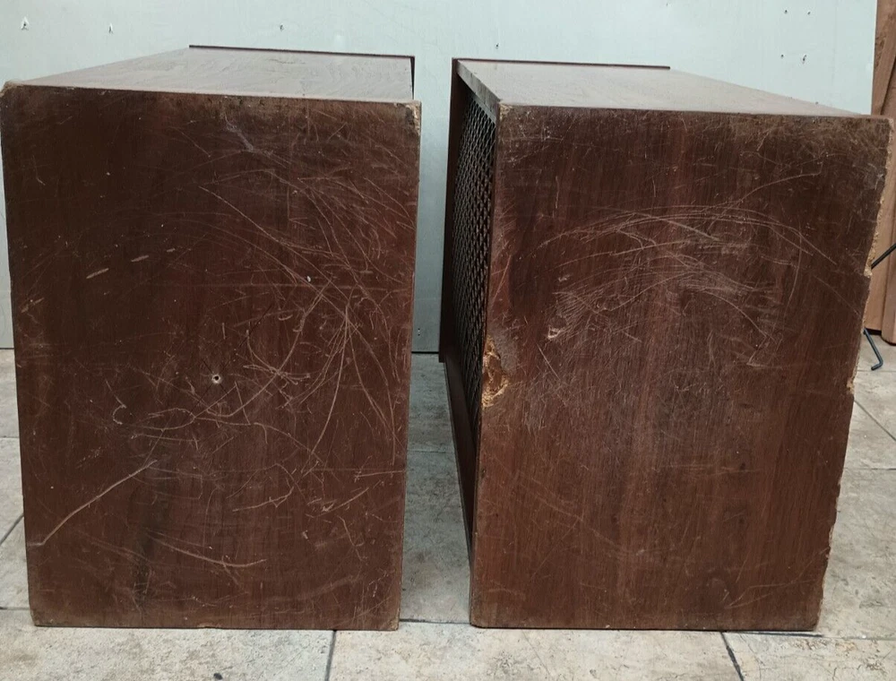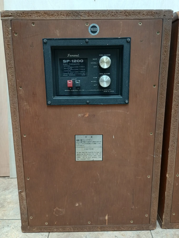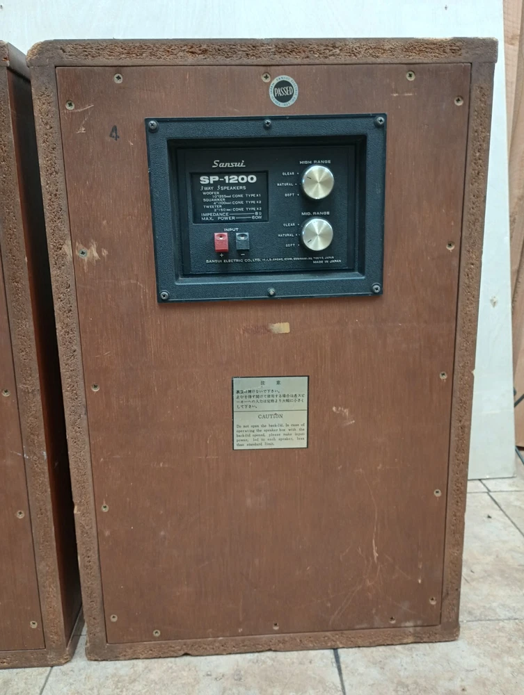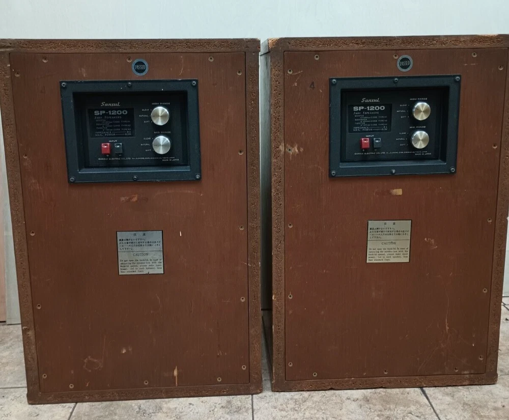 Vintage Pair of Sansui SP-1200 Speakers Cabinets in bad shape missing one badge on of the cabinet has major damage as seen on picture s one for the grills is missing all the screws one tweeter is torn(see pics) otherwise they still sound good Sold As Is as pictured the will be shipped in two separated boxes