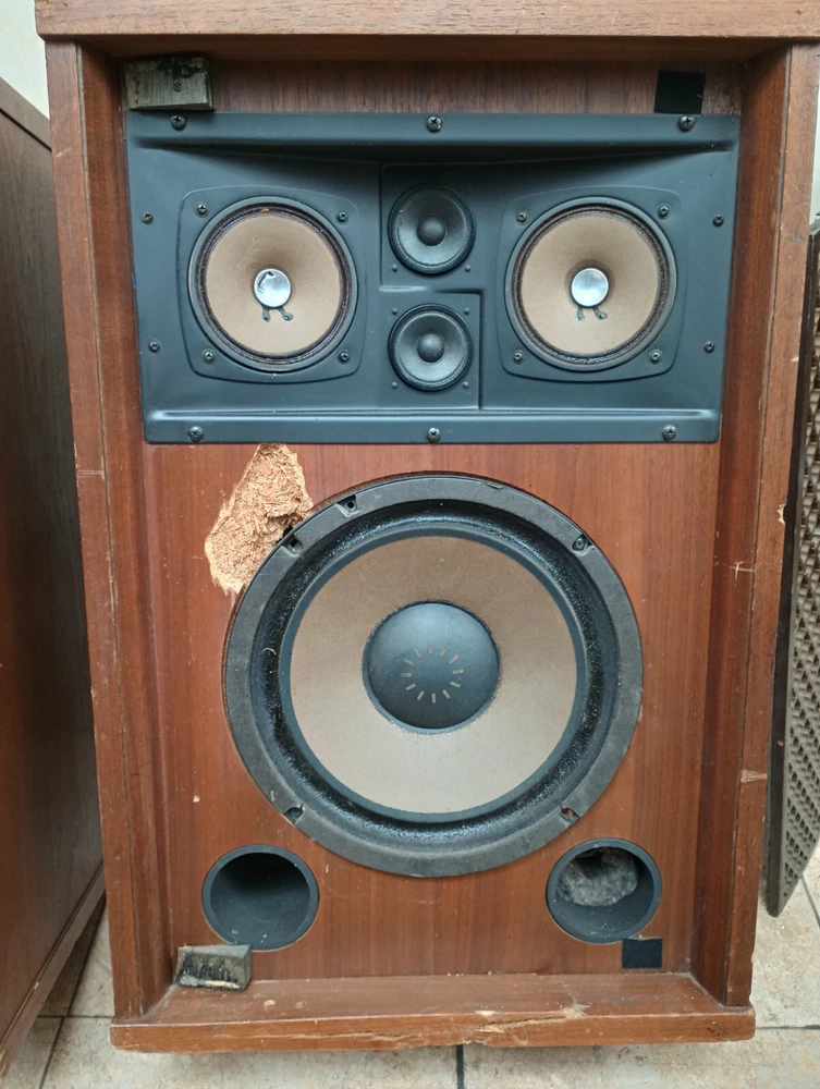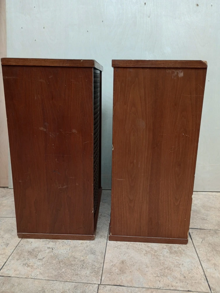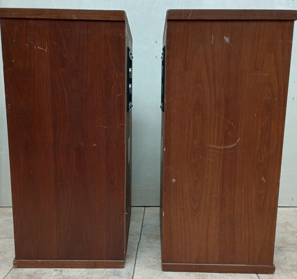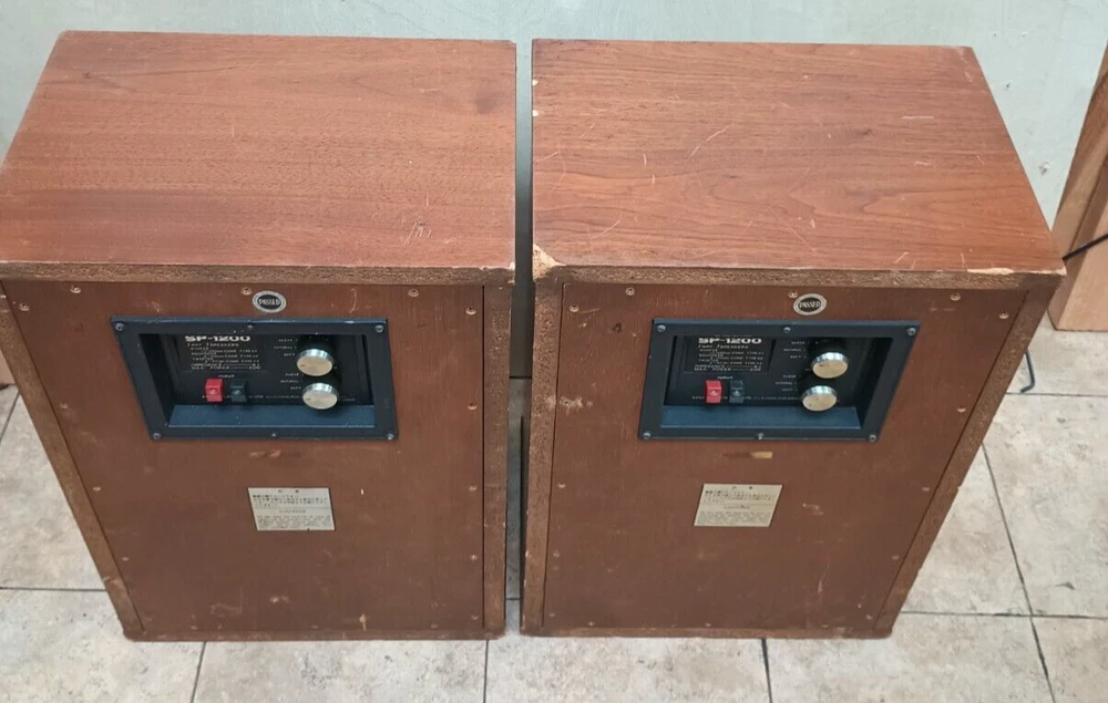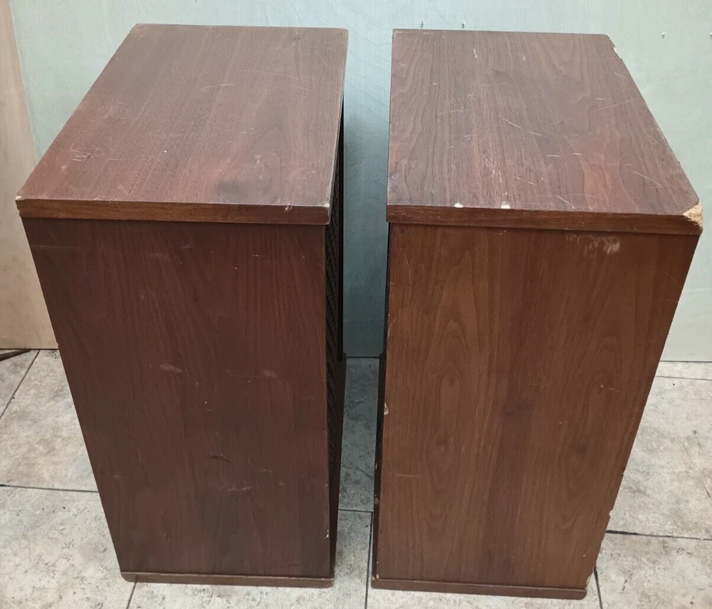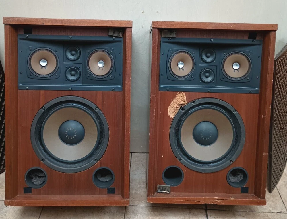 Vintage Pair of Sansui SP-1200 Speakers Cabinets in bad shape missing one badge on of the cabinet has major damage as seen on picture s one for the grills is missing all the screws one tweeter is torn(see pics) otherwise they still sound good Sold As Is as pictured the will be shipped in two separated boxes