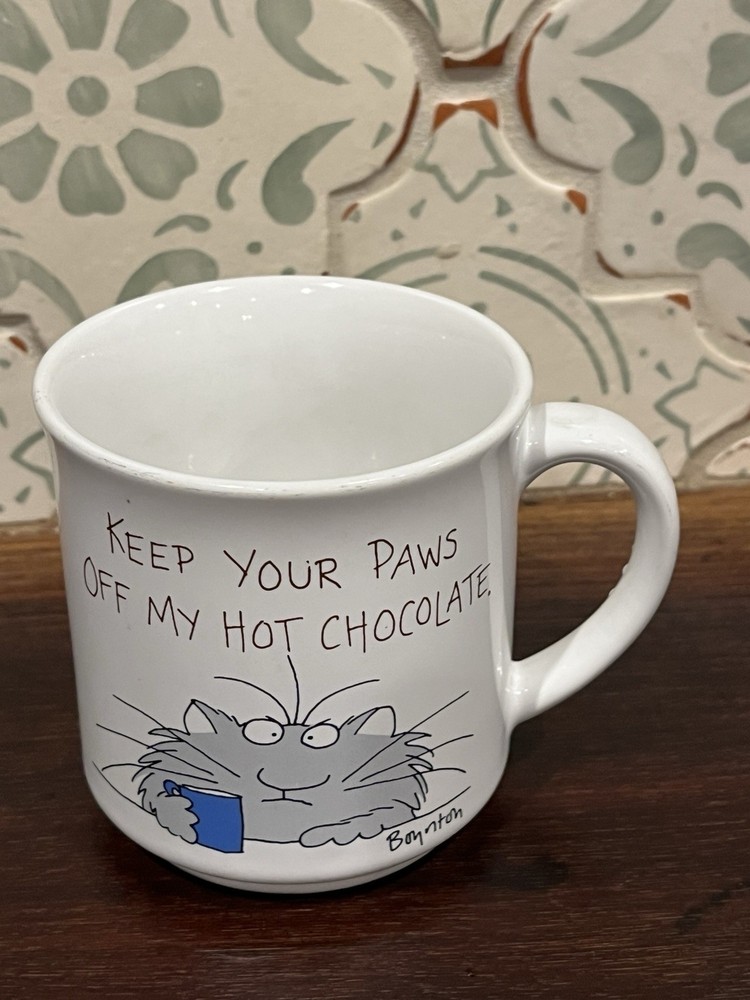 This vintage Sandra Boynton cat mug with the playful design "Keep Your Paws Off My Hot Chocolate" is a collectible piece perfect for fans of cartoons, comedy, and animal-themed decor. Ideal for all occasions and with a capacity of 12 oz, this medium-sized mug is dishwasher safe and features a handle for easy gripping. Made in the 1980s, this mug captures the humor and whimsy of Sandra Boynton's unique style from that era. Perfect for teens and unisex adults alike, this mug is a charming addition to any kitchen or home collection.