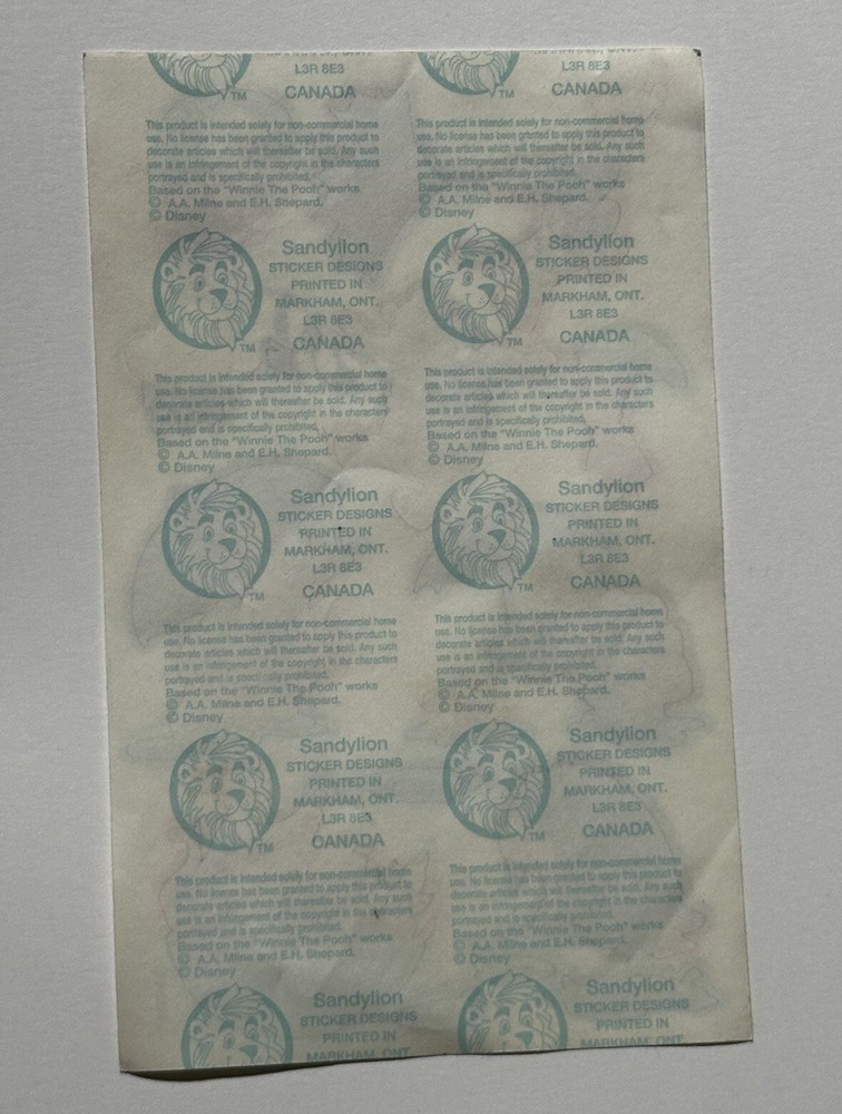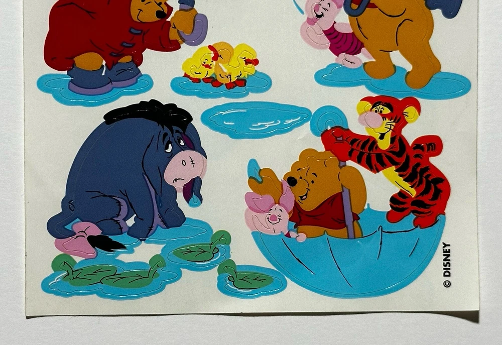 This sticker sheet from the vintage Disney and Sandylion collaboration features Winnie the Pooh and friends having fun in the rain. These adorable and vibrant stickers will make a great addition to any vintage sticker collection, Winnie the Pooh fan, and/or crafter! The sticker sheet is in great, vintage condition with normal signs of wear from handle and time. Please review all of the pictures and ask any questions as this is sold as is. Thank you for your time! :)