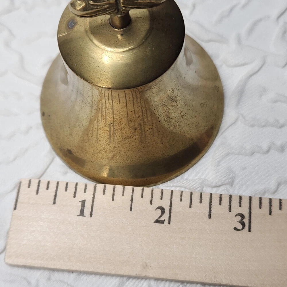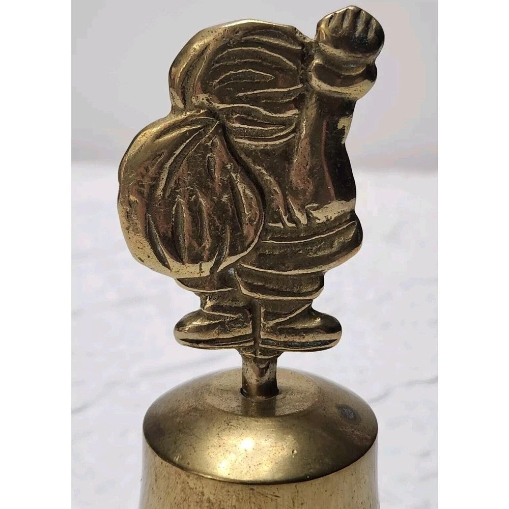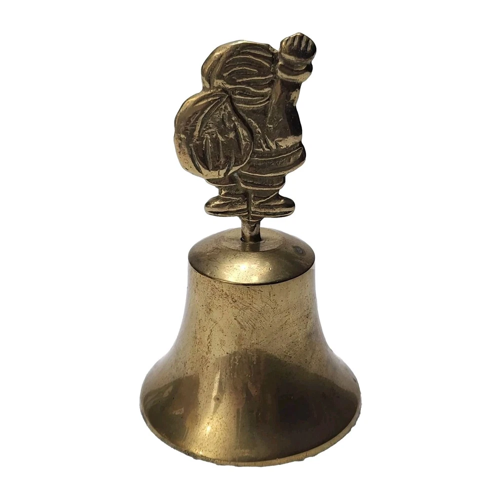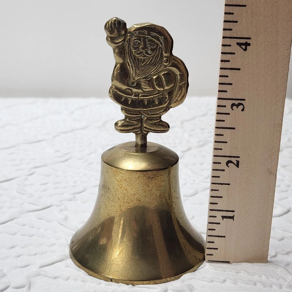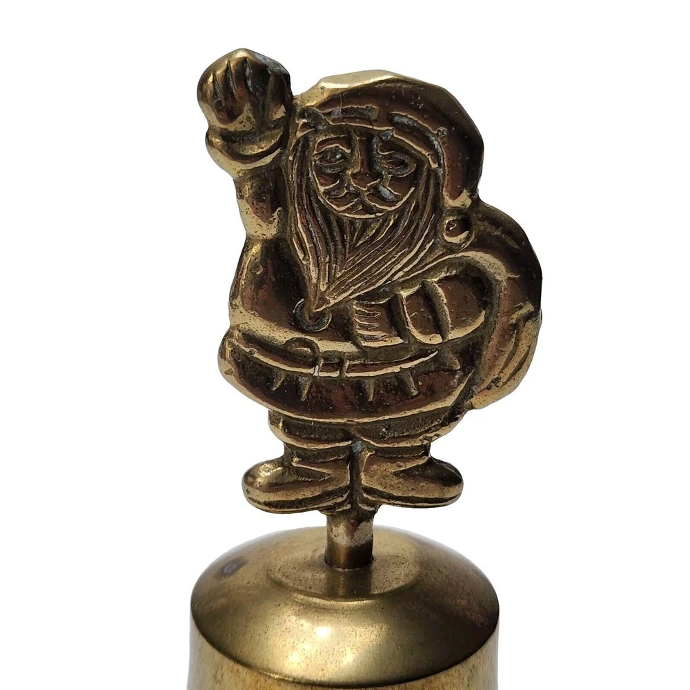 This vintage brass bell features a charming Santa handle and an etched brass tone metal design. Perfect for the Christmas season, this small bell has a metallic finish. The flower etched bell the bell is made of brass and metal. It is a great addition to any Christmas decor and a perfect gift for collectors. The bell is made in Taiwan and comes in a set of 2.