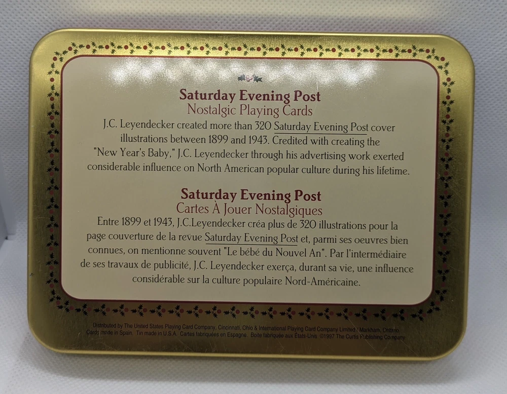 Both decks have been open but show very little signs of use. Comes in nice embossed metal tin.