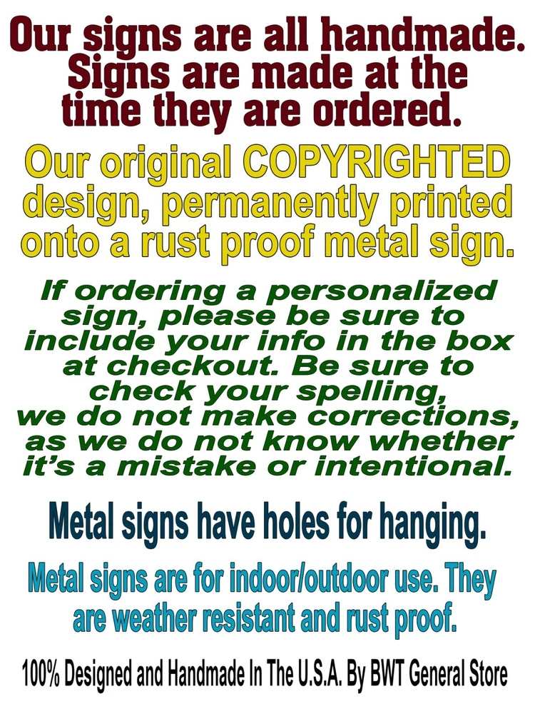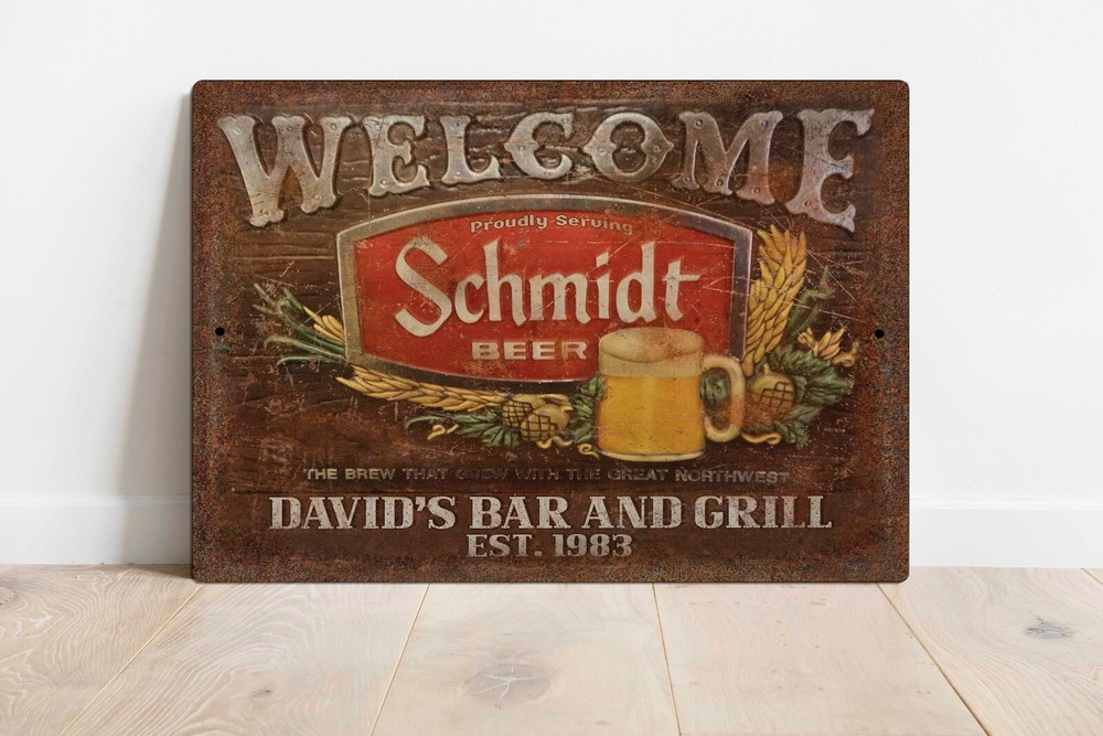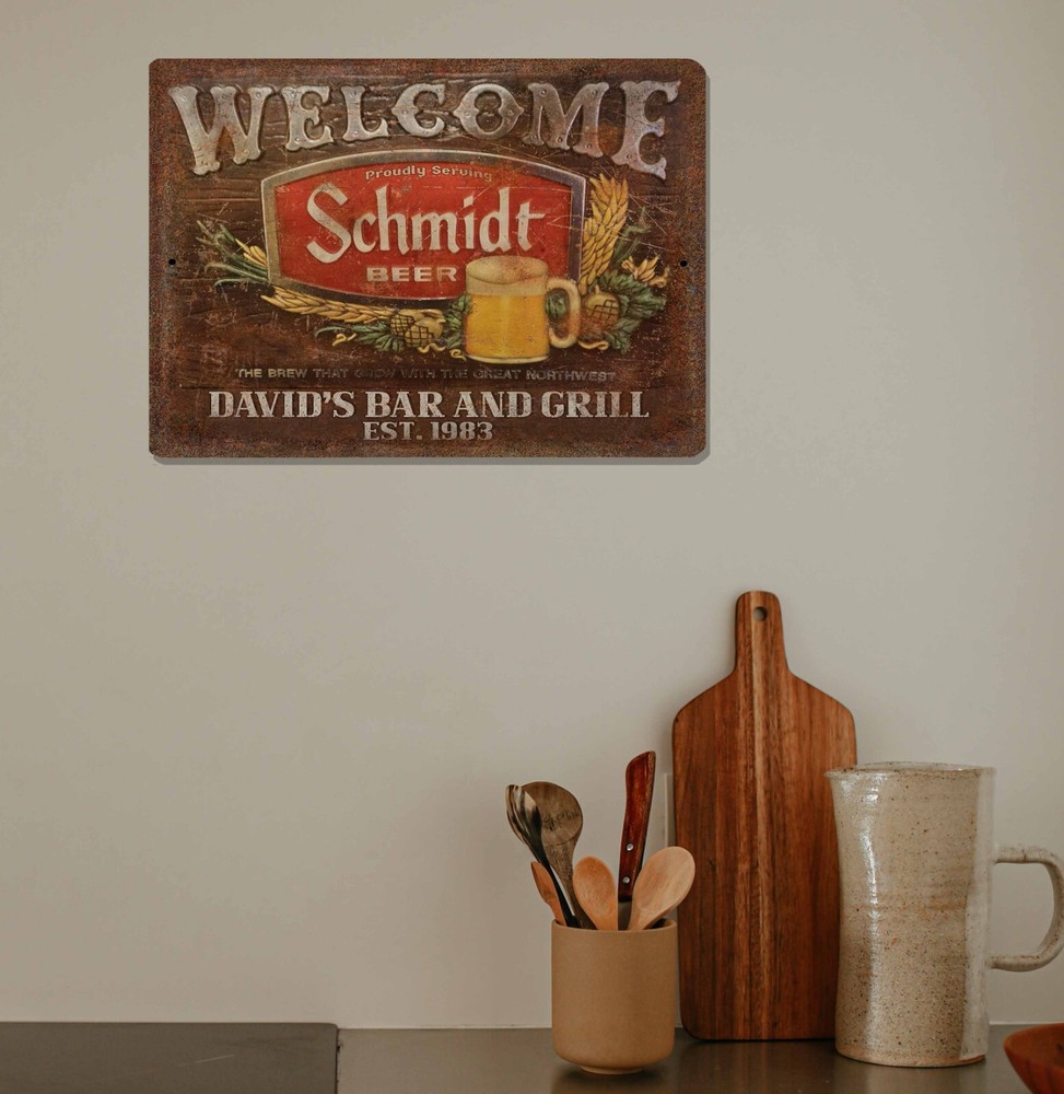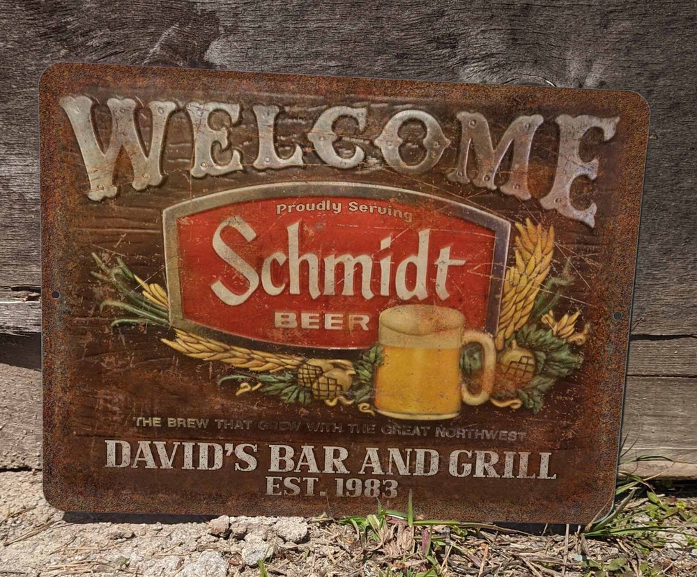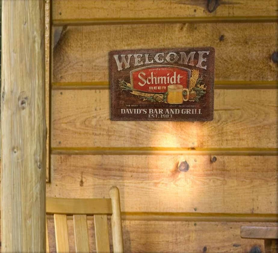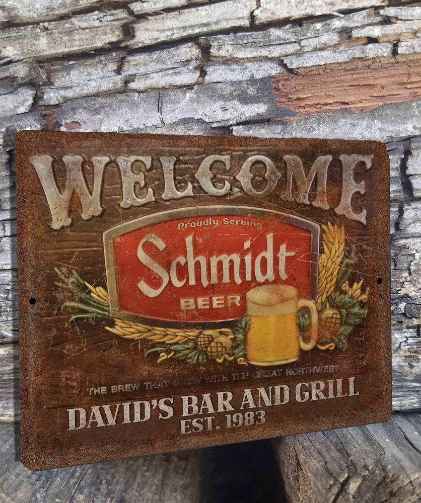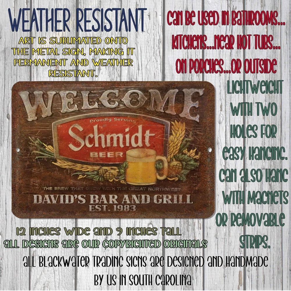 Personalized Schmidt Beer Vintage Reproduction Welcome Bar Sign. This was designed after an old Schmidt beer welcome sign, and we added a rusty, scratched, distressed look to it. Personalized with your name and the year established. This LOOKS like an old, distressed, scratched, sign, but is brand new, made to order. Made with indoor/outdoor weather resistant METAL. Please be sure to include the name you need, and the year established, at the checkout. Make sure to include an apostrophe, if desired. We can only put whatever you send us, we do not make corrections. Also, we are not responsible if you made a spelling error in your message. Your sign may come with what looks like scratches, scuffs, etc on it. That is part of our multi-layered distressed design. If you look closely at the pictures, you will see the distressing. Our signs are handmade, when ordered, in South Carolina, USA, and carefully quality checked before shipping. We do not ship out any sign that doesn't meet our standards. Design is sublimated onto the metal for a permanent finish: The high-quality sublimation process ensures that the design becomes an integral part of the metal, giving it a vibrant, long-lasting finish. Made of aluminum to be rust-resistant High gloss UV-PRO coating resists fading With mounting holes measures 9" x 12" .026 gauge rounded corners 100% made in the USA We use top of the line sublimation materials to ensure vibrant color. All designs are Copyright © Blackwater Trading. We ship most items out within 1 -3 business days after payment clears. We do not ship on holidays and weekends. Wholesale is available. Contact us, and we can list a wholesale lot for you! All of our items come from a smoke and pet free environment Please be aware that computer monitors vary, so the colors on your sign may vary slightly from what you see on the screen. Blackwater Trading signs are made in the USA