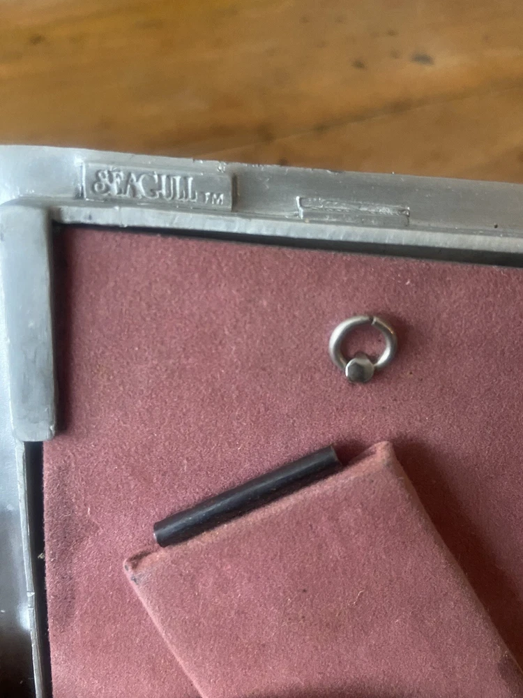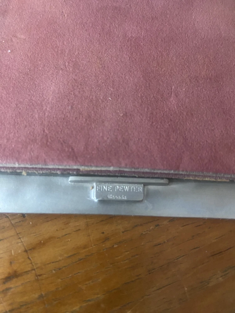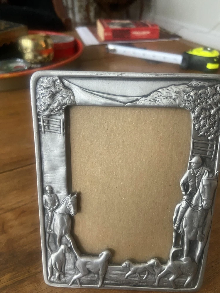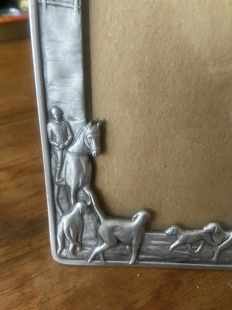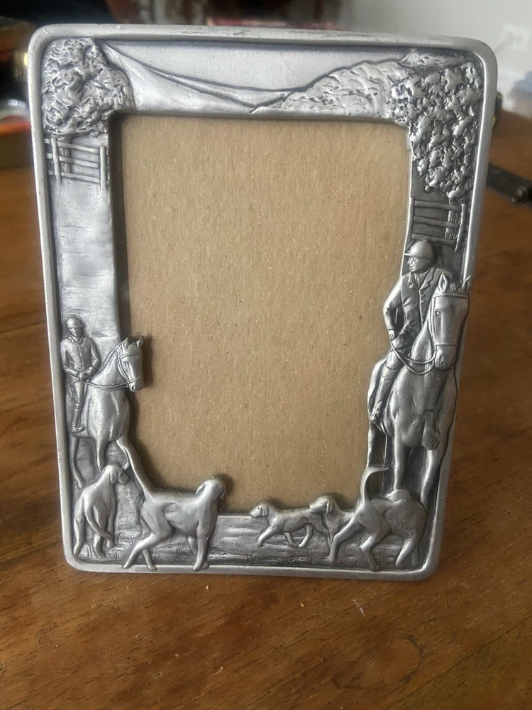 Vintage Seagull brand Pewter 3.5x5 Picture Frame- horse themed. Pink velvet reverse side. Can stand or hang with clip on back