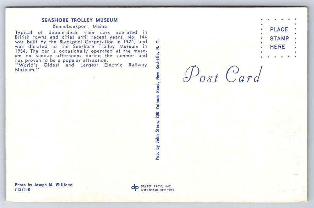 Seashore Trolley Museum Double Deck Tram Car Kennebunk ME Postcard S6 Thank you for visiting! This is a standard size postcard, 3.5" X 5.5". Packaged in a sleeve for protection. In stock, usually ships within 24 hours of your purchase. Please ask questions if you are unsure about anything. My goal is for your complete satisfaction with the postcard and your experience. I have over 10,000 selections in my store. Check it out here RETIREDWITHBOOKS Powered by SixBit's eCommerce Solution