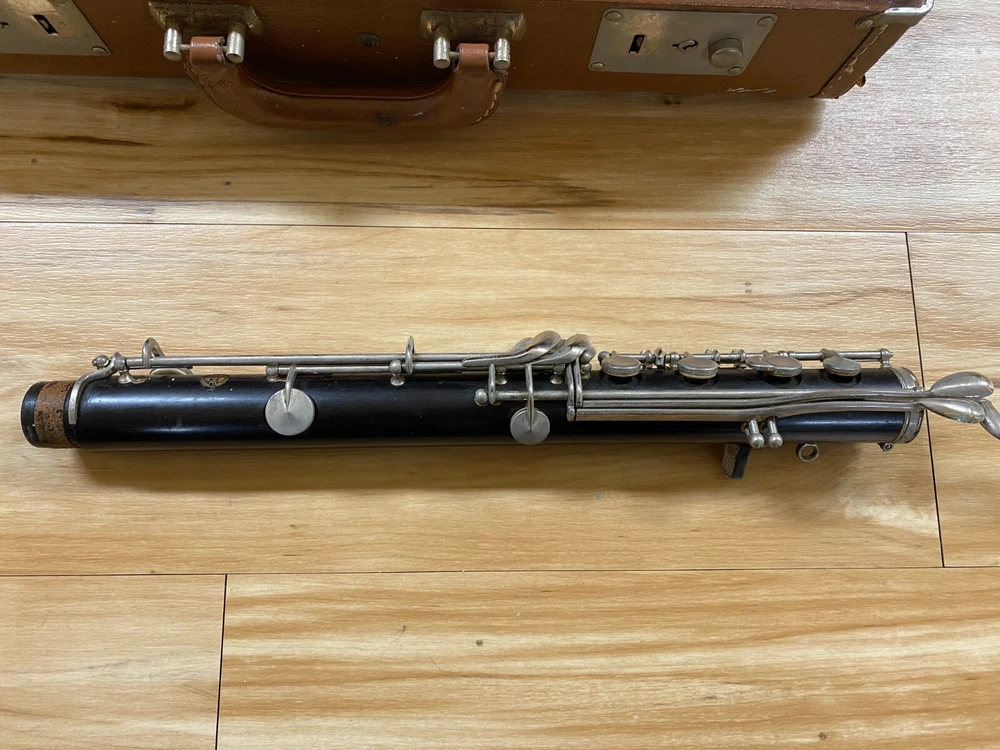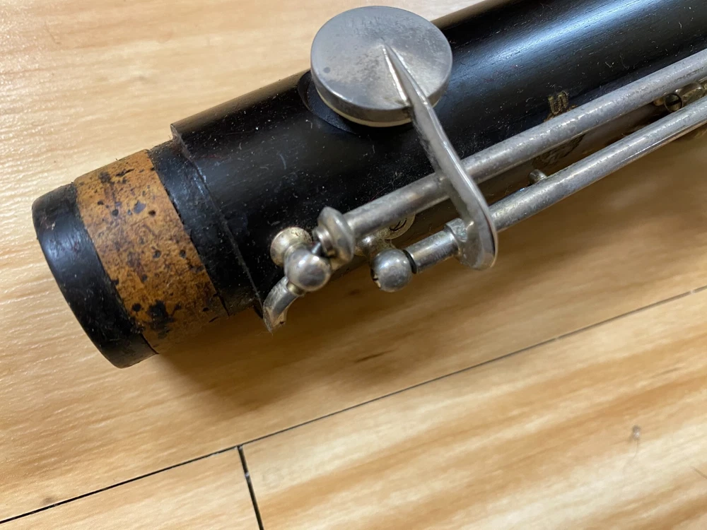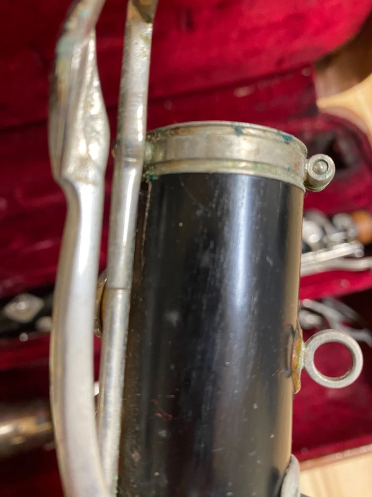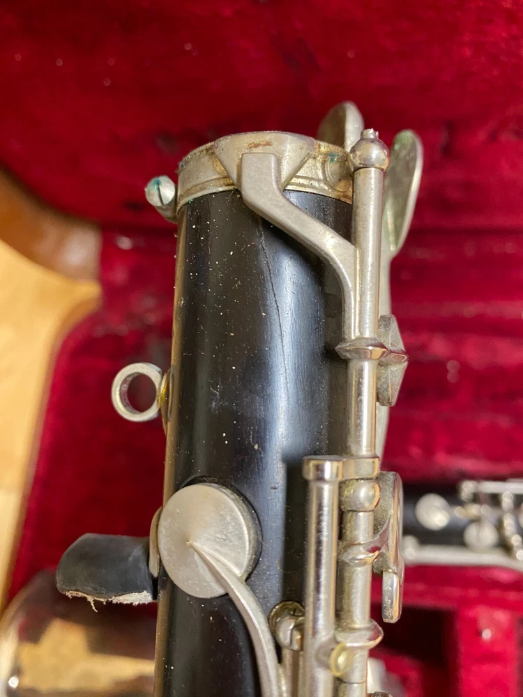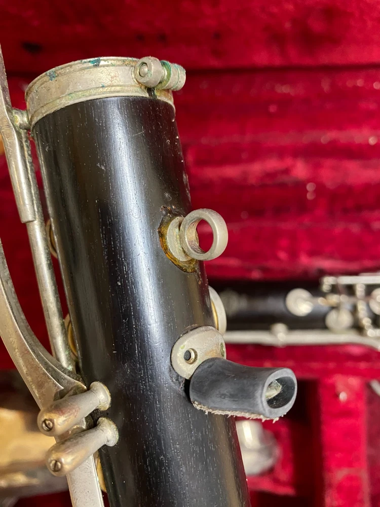 This alto clarinet seems like a good candidate for restoration if a neck can be found. There are no major keywork issues that I've noticed besides the two pictured areas (rotated Low E post, bent bell key). Lower joint has two spots that look like minor cracks (pictured). Neckstap hook has been glued on (pictured). Tenons (pictured) look like they are in good shape. No Neck I do not know if the bell is original as I've seen some with Selmer logos on them. Case can hold the instrument but isn't in amazing cosmetic condition. Latches work.