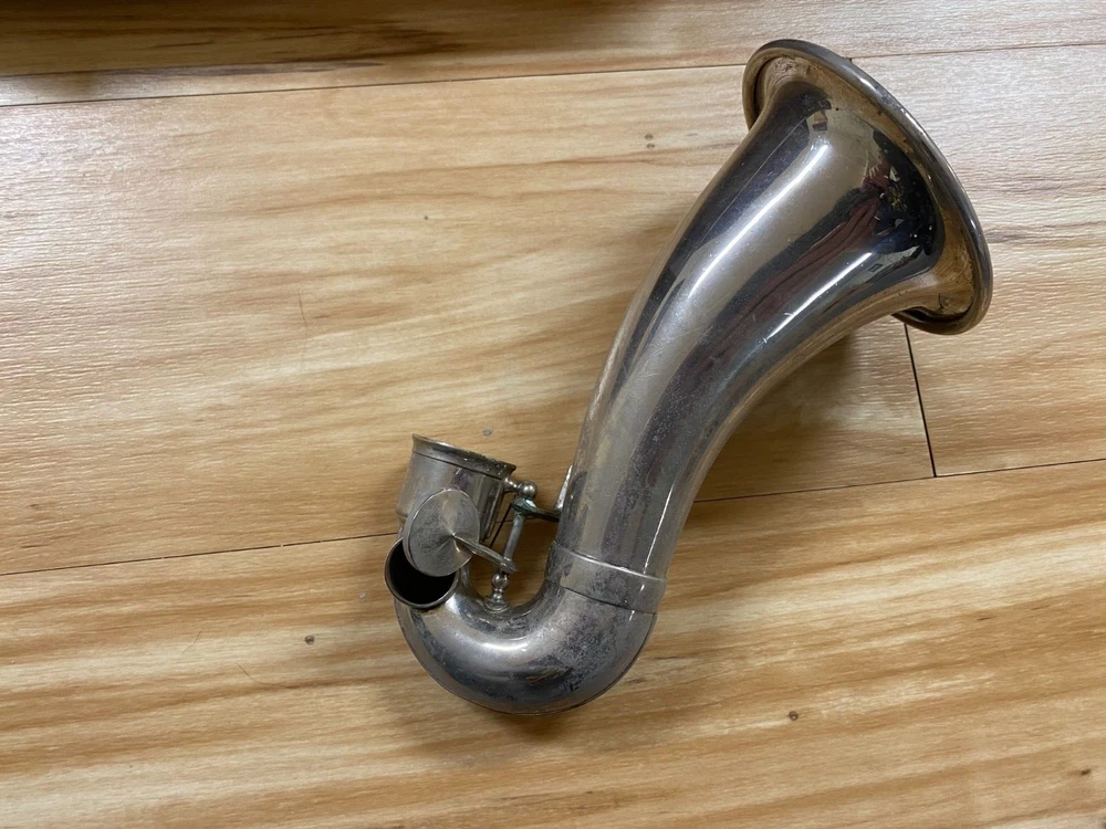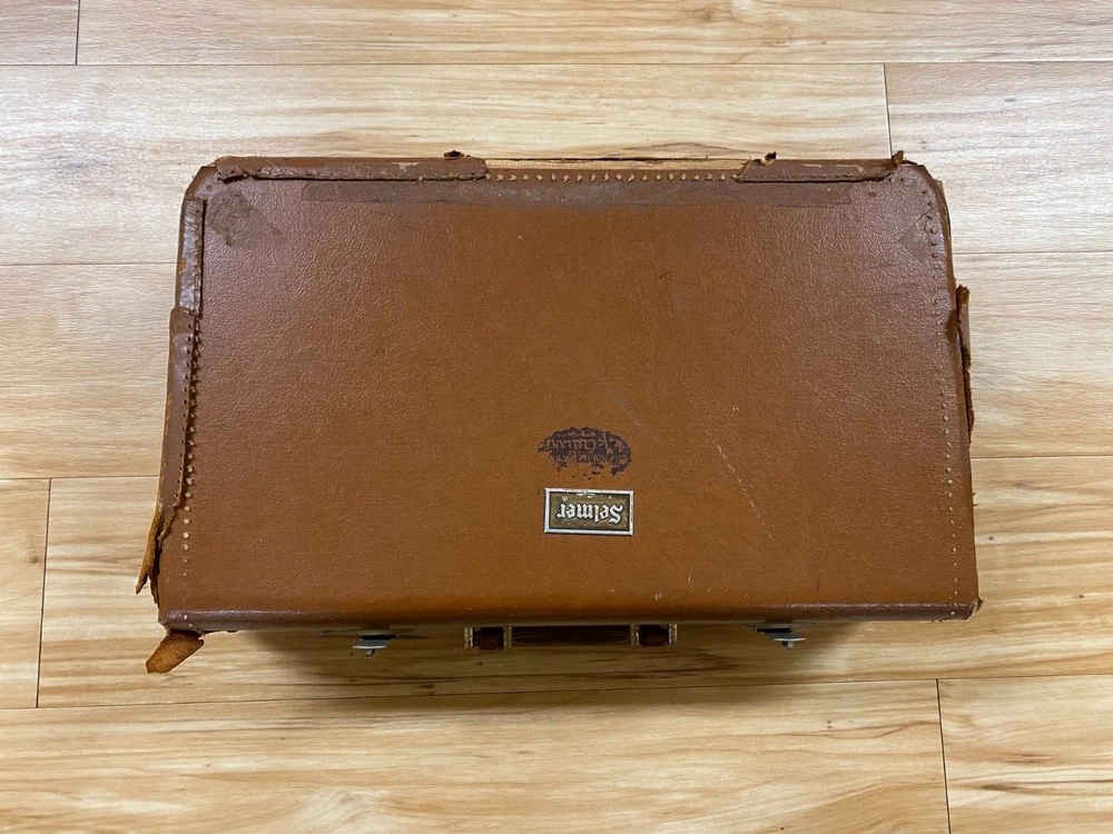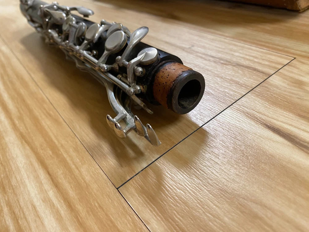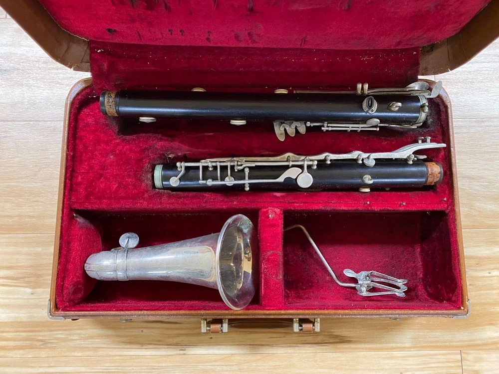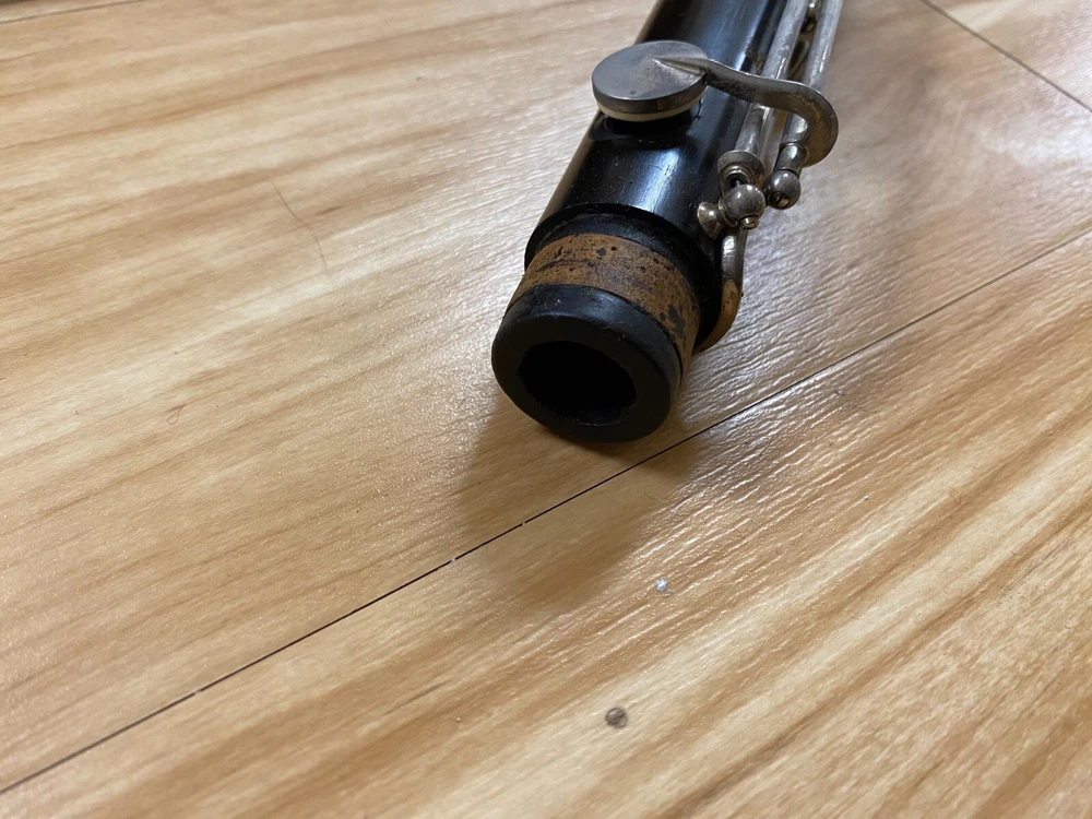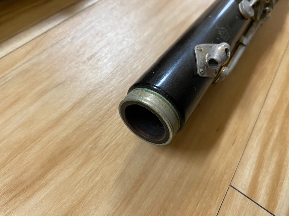 This alto clarinet seems like a good candidate for restoration if a neck can be found. There are no major keywork issues that I've noticed besides the two pictured areas (rotated Low E post, bent bell key). Lower joint has two spots that look like minor cracks (pictured). Neckstap hook has been glued on (pictured). Tenons (pictured) look like they are in good shape. No Neck I do not know if the bell is original as I've seen some with Selmer logos on them. Case can hold the instrument but isn't in amazing cosmetic condition. Latches work.