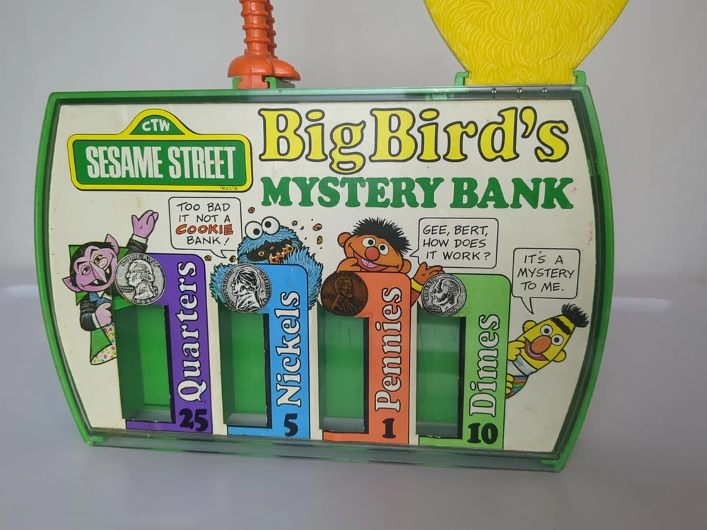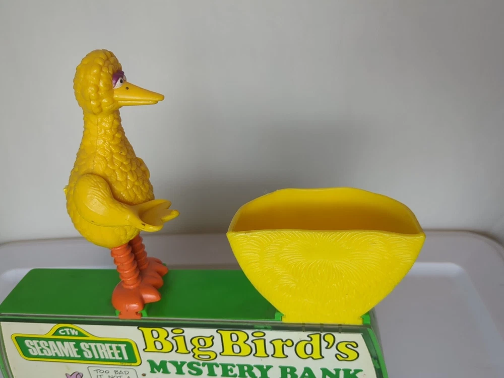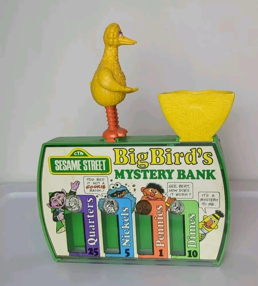 This vintage Sesame Street Big Bird's Mystery Bank Coin Sorter is a must-have for any Muppets collector! Made in 1976, this green bank measures 9x6 inches and features the beloved Sesame Street character, Big Bird. The bank is designed as a coin sort, making it perfect for storing loose change or small trinkets. With its unique design and iconic character, this bank is a great addition to any collection or display. Whether you're a fan of Sesame Street or just love vintage collectibles, this Big Bird bank is sure to bring back memories of childhood. Don't miss out on the opportunity to own a piece of nostalgia! Condition is pre-owned there is a back switch on Big Bird that is broken but arm still moves Feel free to ask questions