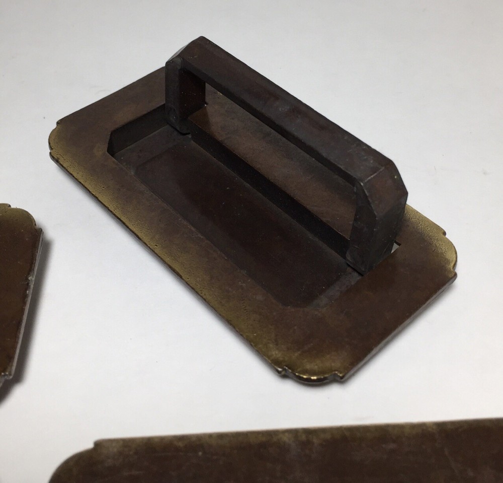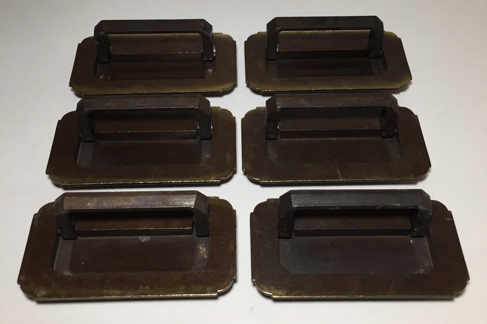 Vintage Set Of 6 Brass Drawer Cabinet Furniture Fold Out Handle Pulls. The handles are in good useable condition. The screw mounts on the back are 3” apart. All of the measurements are shown in the pictures. Please feel free to ask any questions. The lot will ship out safely and securely the same or next business day.