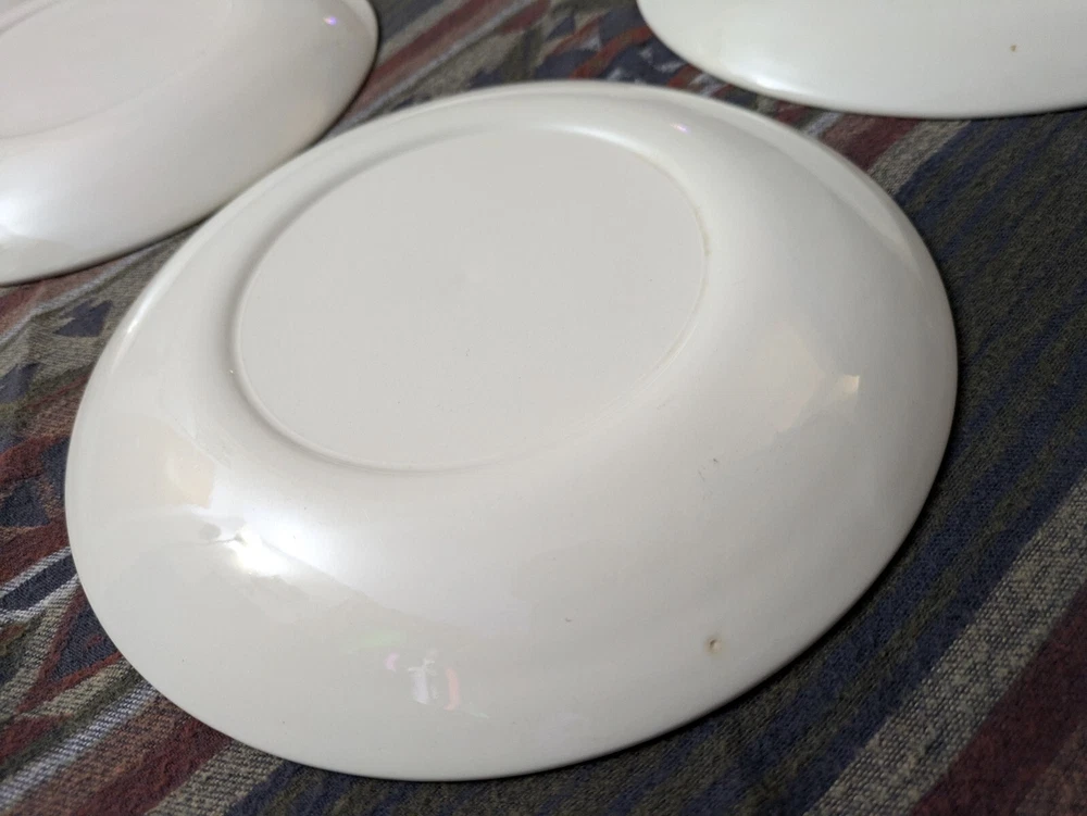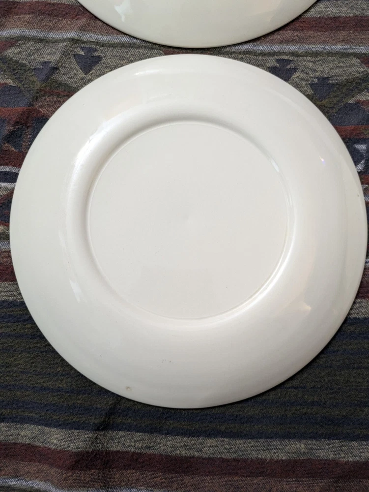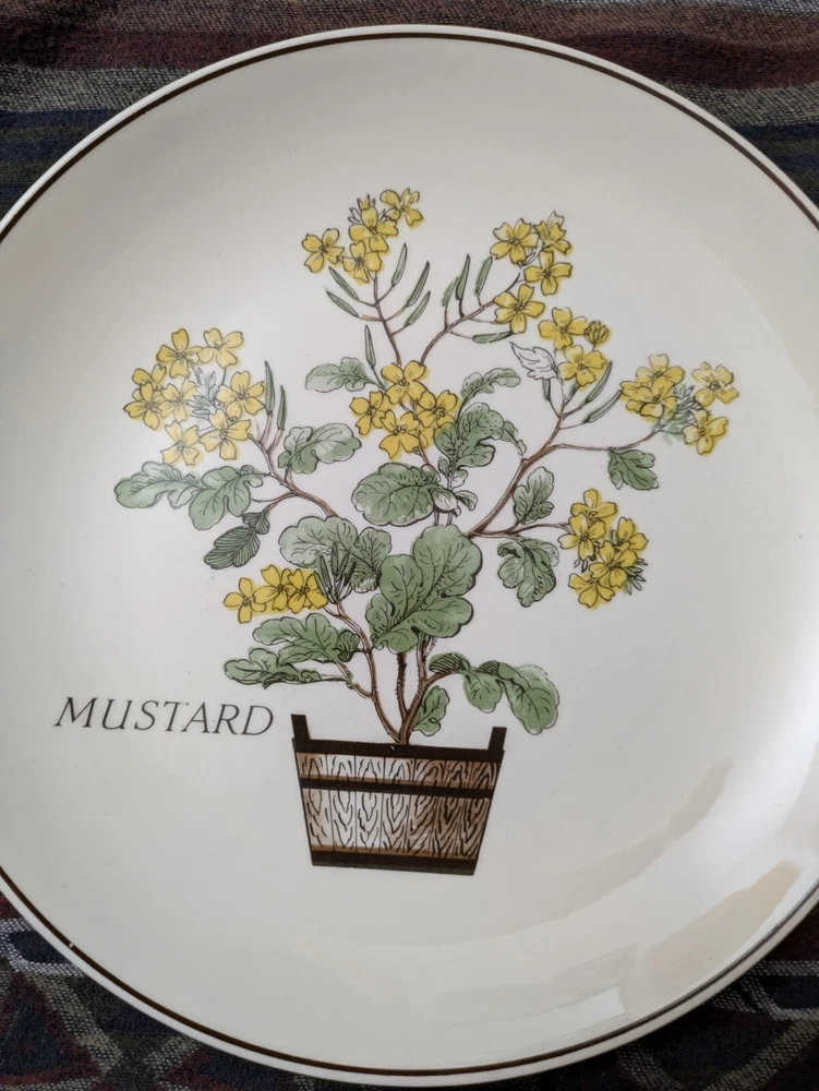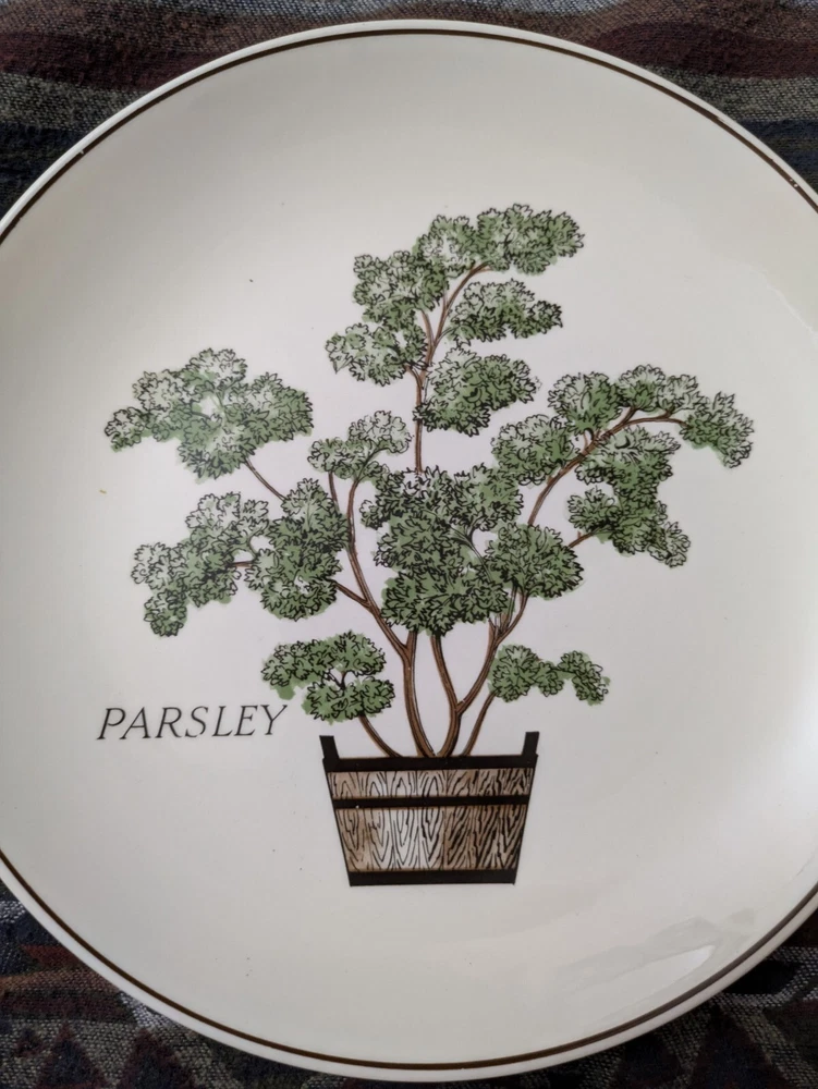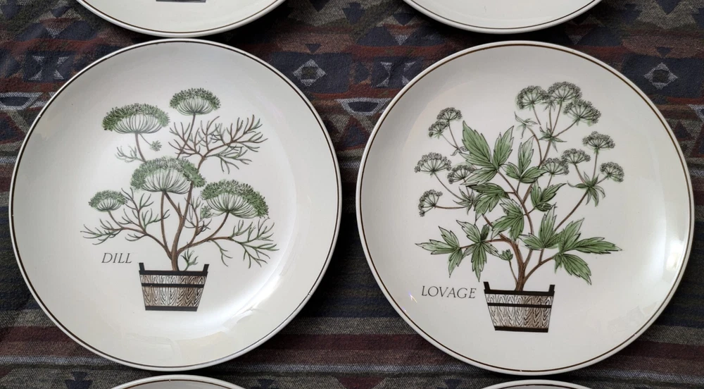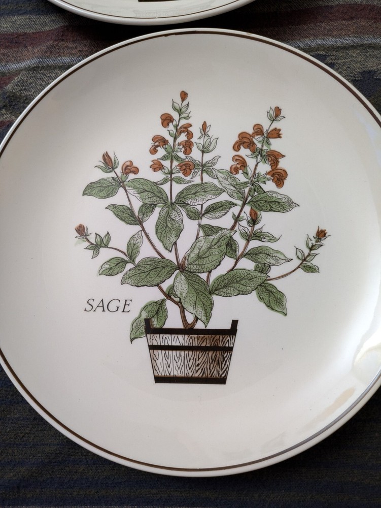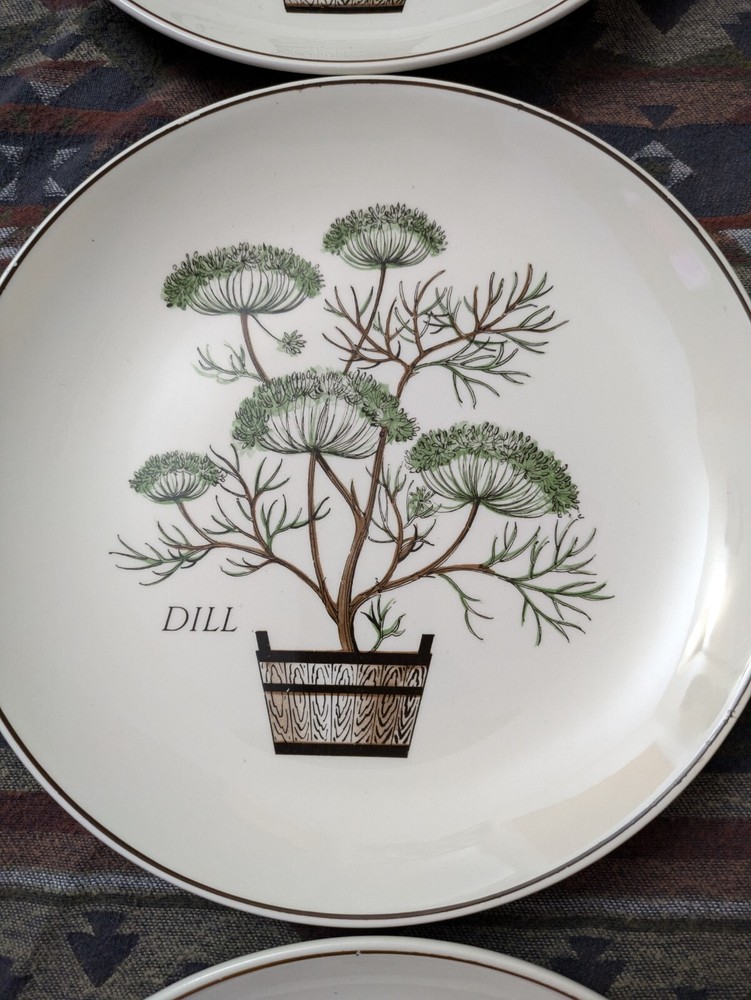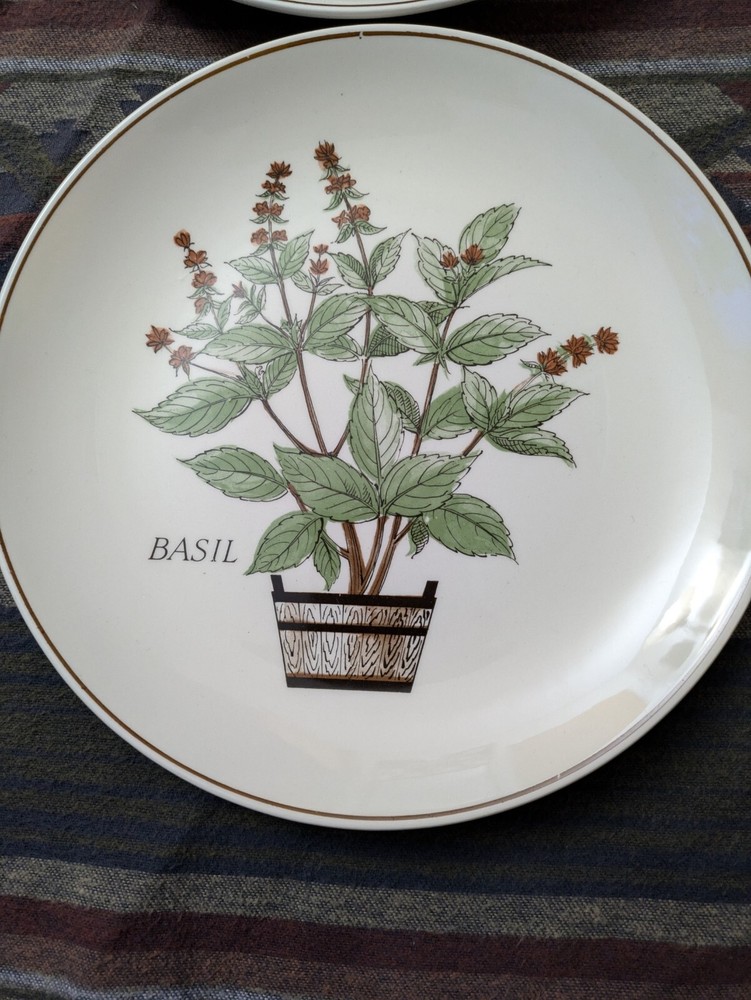 Vintage Set of 4 Herb Plates 8.5 Inch 1950s/1960s. Plates show minimal wear, some scratching from use no nicks or cracks. Each plate measures 8.25 inches across and features the name of the herb along with a colorful depiction. Plates are unmarked. Each has a small divot in the back. Each plate is a different herb. -Basil -Sage -Lovage -Dill -Chives -Borage -Paraley -Mustard