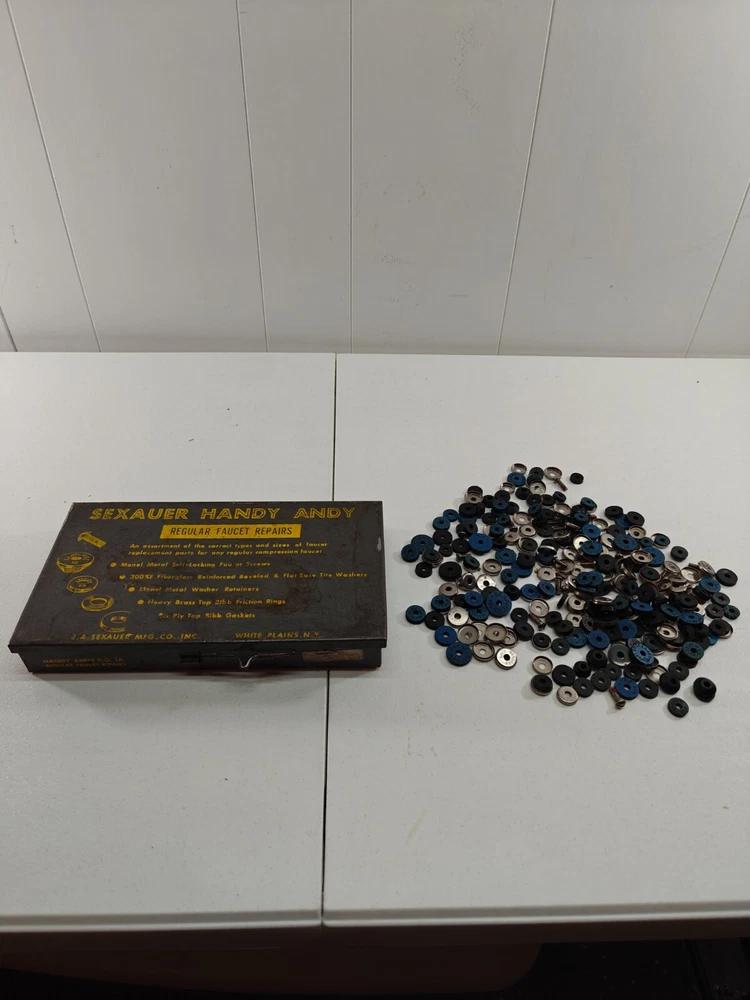 Sexauer Handyman repair kit with assorted gaskets, washers, and screws for plumbing repairs.
