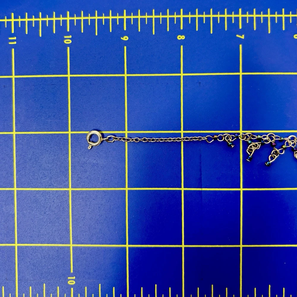 Vintage Silver Tone Iridescent Seed Bead Diamond Weave Dangle Anklet 9.5" Great condition! The silver tone finish is intact and bright, and the iridescent seed beads are shimmery. The clasp works as it should. Please see all pictures for details and message me with any questions.