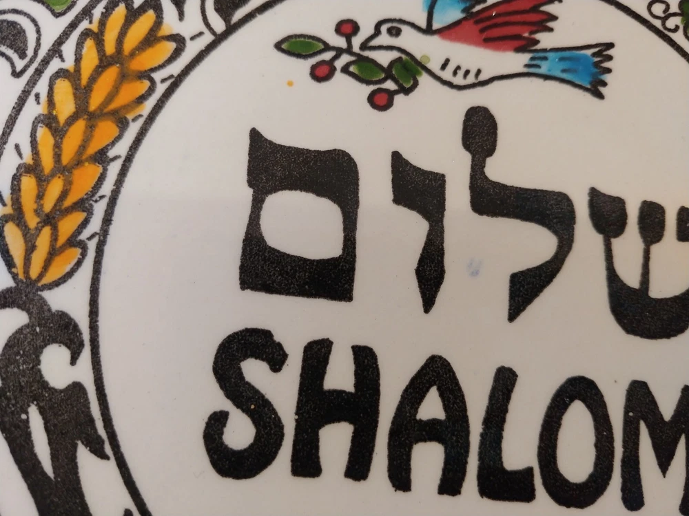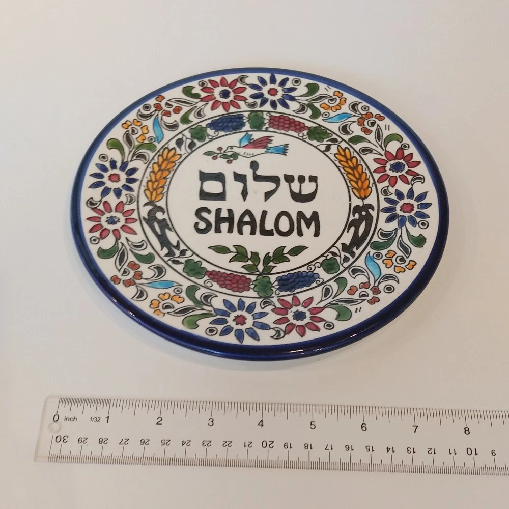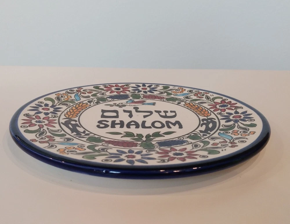 This vintage Simron Judaica SHALOM hand-painted decorative dish plate is a beautiful addition to any collection. Made in Israel, this plate features intricate details and is handmade with care. Perfect for displaying on a shelf or using for special occasions, this plate is sure to impress. The plate is crafted with the Hebrew word "Shalom" in bold letters, adding a touch of elegance to the design. The Judaism religion is featured, making it a great piece for those who want to showcase their faith. This trivet is a unique item that will make a great gift for anyone who appreciates Judaica.