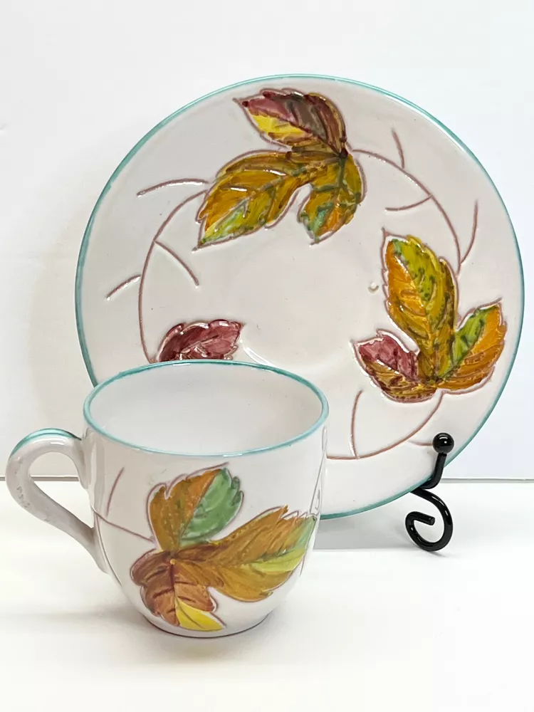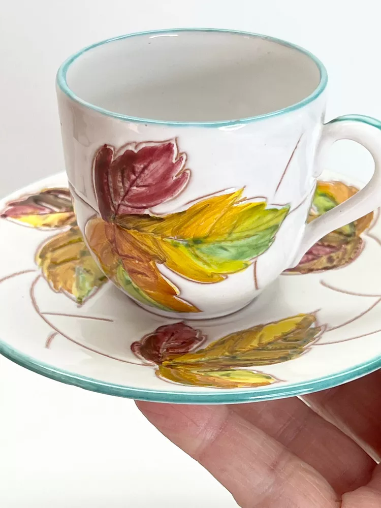 Vintage Small Teacup Hand-painted With Autumn Colors From Italy Leaf Design. A couple of spots where it is missing glaze but no chips or cracks , please check the photos . It is a beautiful little cup and saucer set