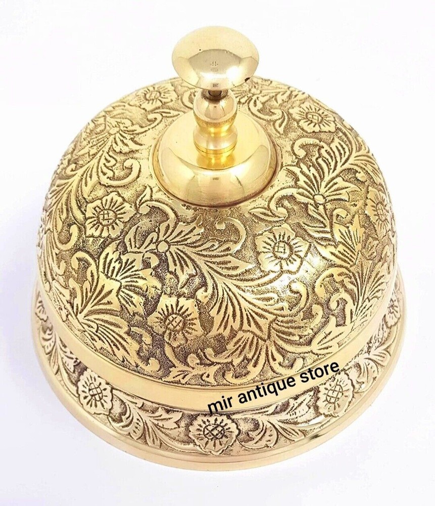 !! WELCOME TO THE MIR ANTIQUE STORE !! This beautiful solid brass desk bell is a perfect addition to any space. Handmade in India, this ornate table bell features a nautical theme with a gold color and shiny finish. Its round shape and medium size make it suitable for all occasions and perfect for reception areas or desks. The bell is a collectible item that can be used as a decorative piece and is ideal for girls' rooms. Its unique design and high-quality brass construction make it a valuable addition to any collection. Whether you're a collector of nautical-themed decor or looking for a stylish desk bell, this handmade item will surely impress. Description : Material : Brass Finish : Shiny Brass Size : 5.5 x 5.5 x 4 inch, 14 x 14 x 10 cm Approx Weight : 0.800 gm Approx Desk Bell Solid Brass Beautiful Desk Bell Office Bell Calling Bell Teacher Desk Bell Look Photos For Actual Image Of Product. All Work is Hand Made This is a Reproduction Item, Not As Antique Good Piece Of Collection Table Top Decorative Home Decorative Room Decorative !! YOUR FEEDBACK IS EXTREMELY IMPORTANT FOR US TO GROW OUR BUSINESS ON EBAY, SO PLEASE DO LEAVE POSITIVEFEEDBACK !! Return Policy: We accept 30 free return for our buyers. Payment Policy: We accept payoneer payments.. !! SPECIAL DISCOUNT FOR WHOLESALE & BULK INQUIRY !!