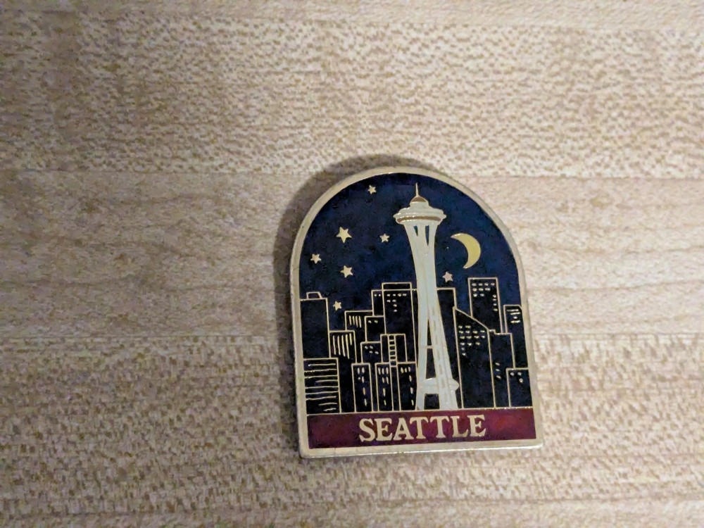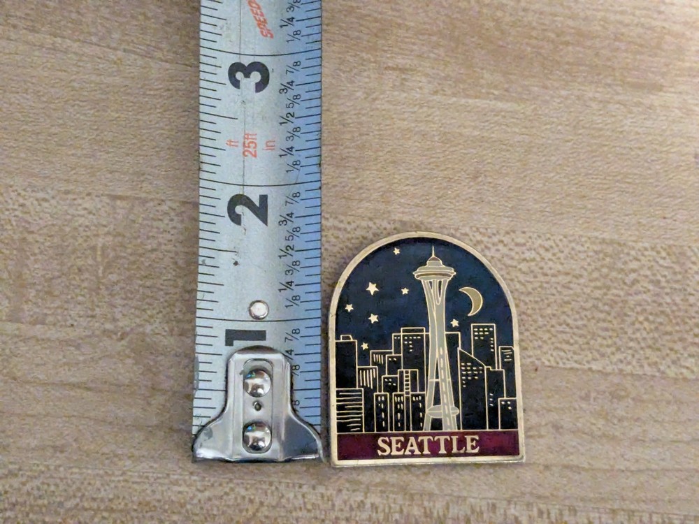 The measurements are in the photos. Please ask if you have any questions at all. The Vintage Space Needle Tower Seattle Washington Enamel Magnet is a unique and decorative piece perfect for collectors or those who appreciate vintage souvenirs. Made of durable enamel, this fridge magnet features a skyline design showcasing the iconic Space Needle tower in Seattle. It serves as a charming and nostalgic addition to any kitchen or home decor, adding a touch of retro flair to your refrigerator or any other magnetic surface.