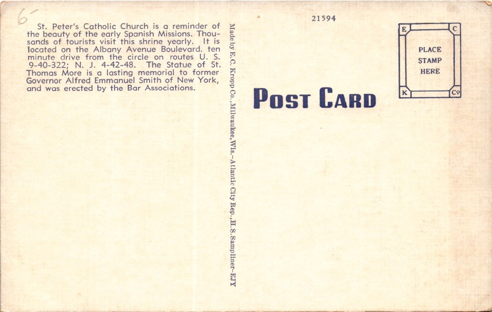 MAKE AN OFFER. THE MORE YOU BUY THE BETTER DEAL I WILL ACCEPT The postcard features a statue of St. Thomas More at St. Peter's Catholic Church in West Atlantic City, New Jersey. The church is described as a reminder of the beauty of early Spanish Missions, attracting thousands of tourists annually. The shrine is located on the Albany Avenue Boulevard, a ten-minute drive from various routes. The Statue of St.