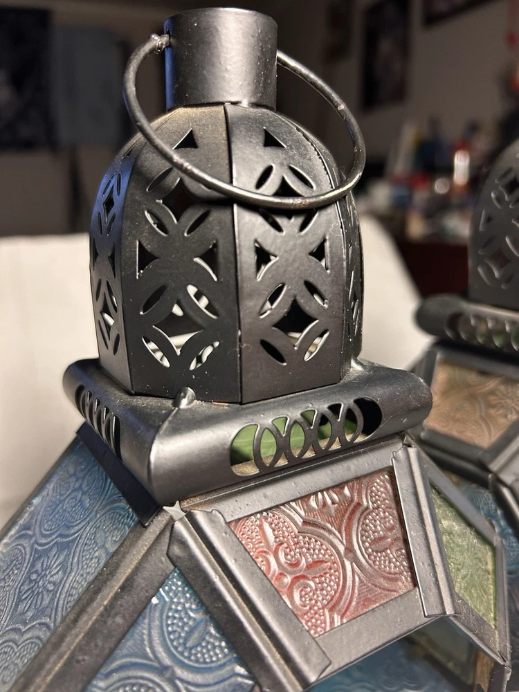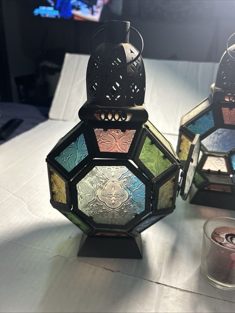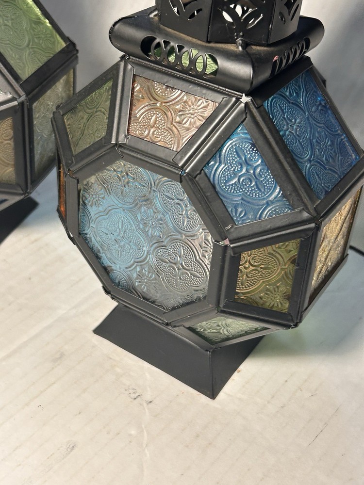 (Lot of 2) vintage stained glass candle holder. They are absolutely beautiful when lit up in the dark ! Features stained glass and swinging door with latch. The door swings outward to the left. I’ve cleaned them the best I can, but the glass could be taken out and cleaned a little better, perhaps I was being a little too careful . But They would look even better if one word to do that . There is nothing broke and the only thing missing is one chain .. They’re both in excellent condition. I do have the one chain that I will include, cannot find the other. I do not know the brand of these because there is no markings or engraving stating so. They do have a vintage rustic look, perfect for any holiday you choose, including Halloween! Ps, If one wanted to they can go to a department store, like Home Depot or Lowe’s or som ewhere similar to get matching chains, ideally black . But whatever color you prefer. Add a touch of vintage charm to your home decor with these two beautiful stained glass candle lanterns. The hexagon shape and abstract pattern make them an ideal choice for adding a mystical and festive touch to your indoor and outdoor spaces. These lanterns are perfect for holding flameless/LED lights, candles, tea lights, and mini candles. ⭐️ Will ship within 2-3 business days! ⭐️ I will only accept return shipping if you do not receive the item listed in the ad or as described !