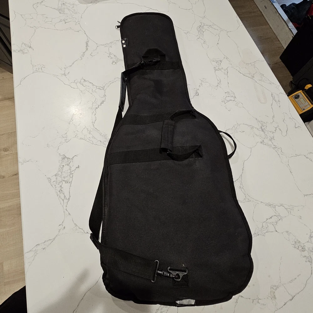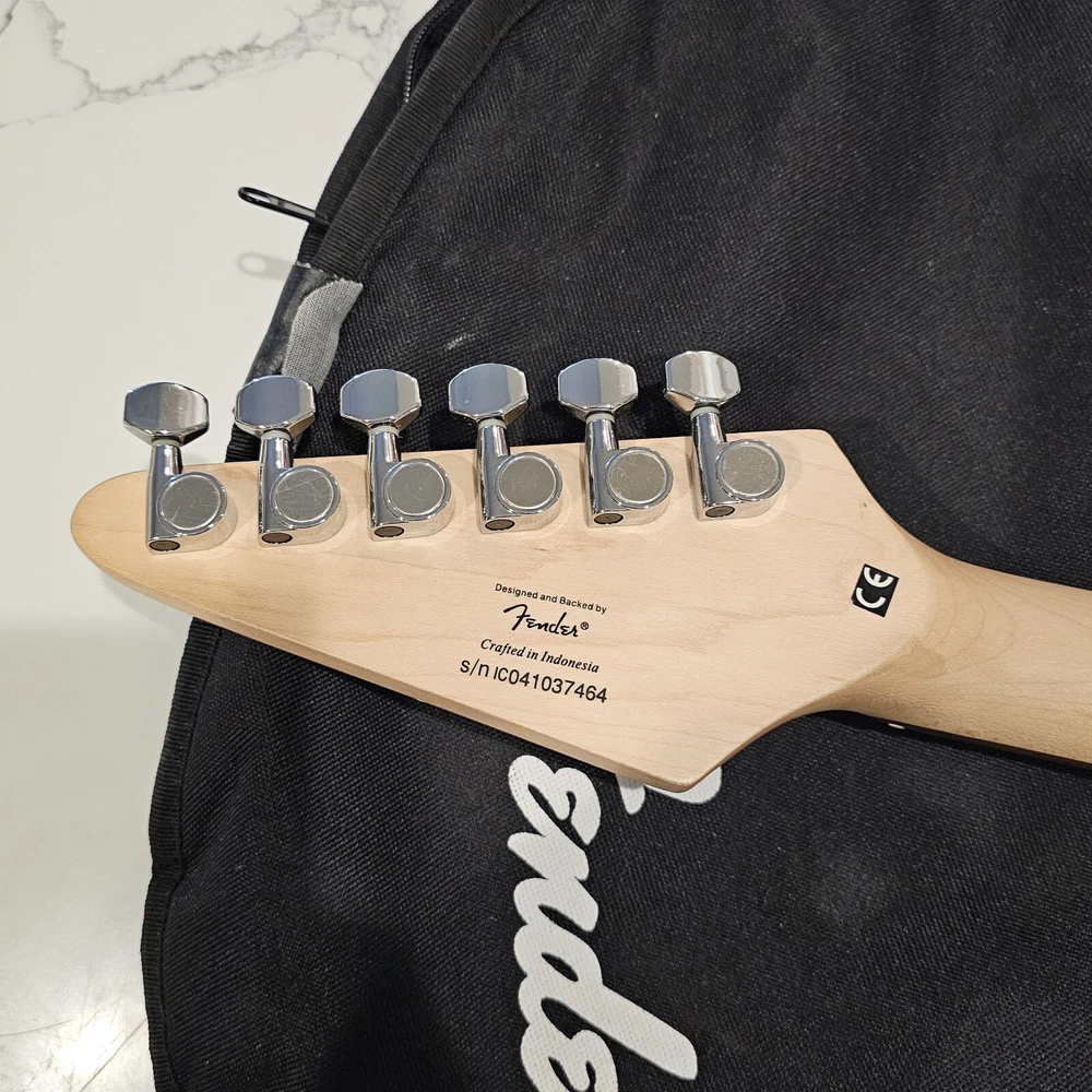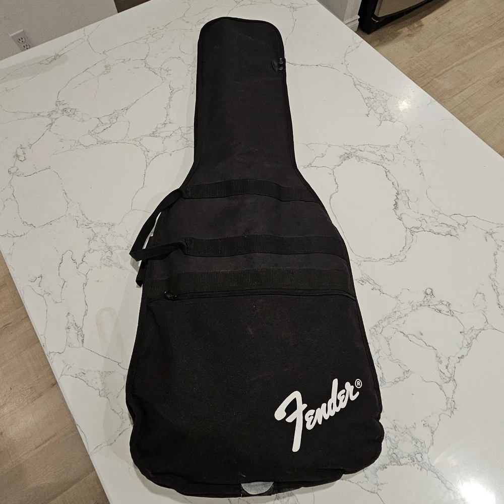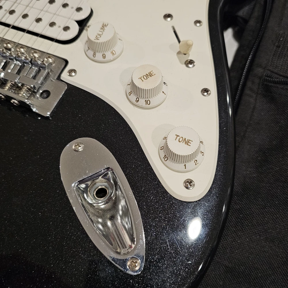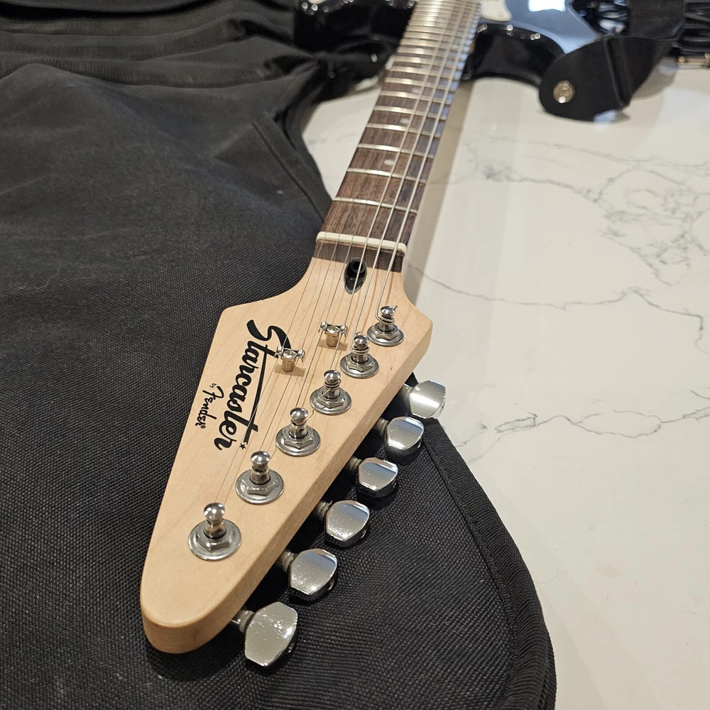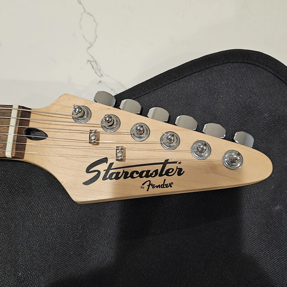 Starcaster By Fender Strat Electric Guitar Black 6 String With Fender Soft Case. Comes With A Few Cords. May Need To Be Tuned. It Looks To Be In Good Overall Condition. Has Some Minor Signs Of Use, Possibly A Mild Blemish Here Or There, Definitely Nothing Major. Please Check All Pictures Closely For A More Detailed Visual Description Of Condition. Ships Out Free Within One Business Day.