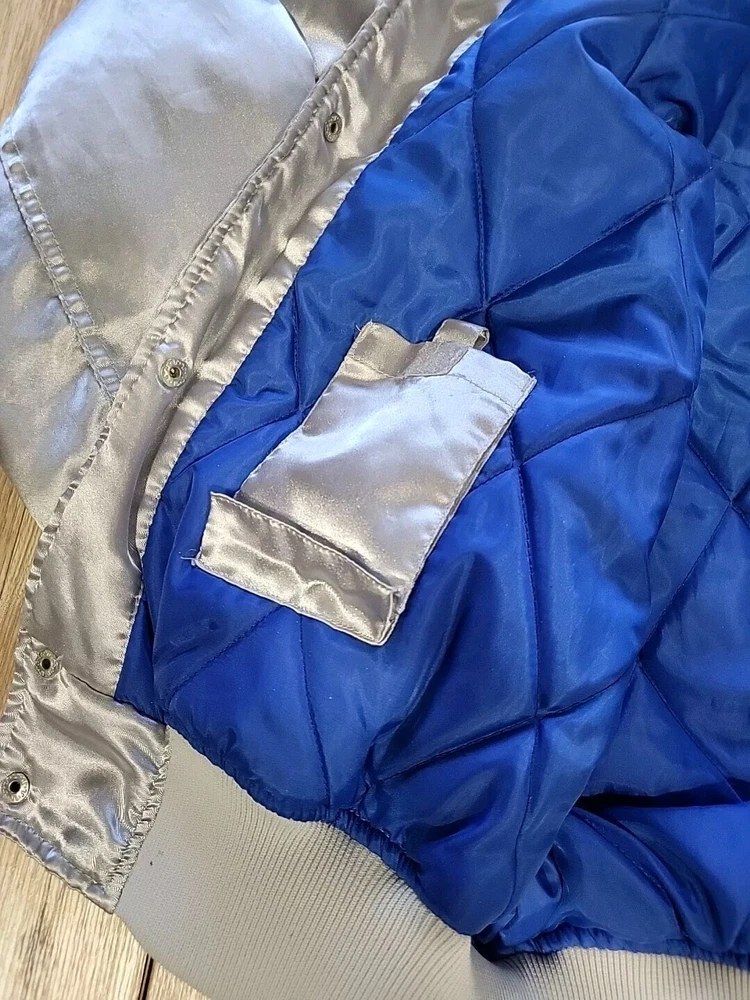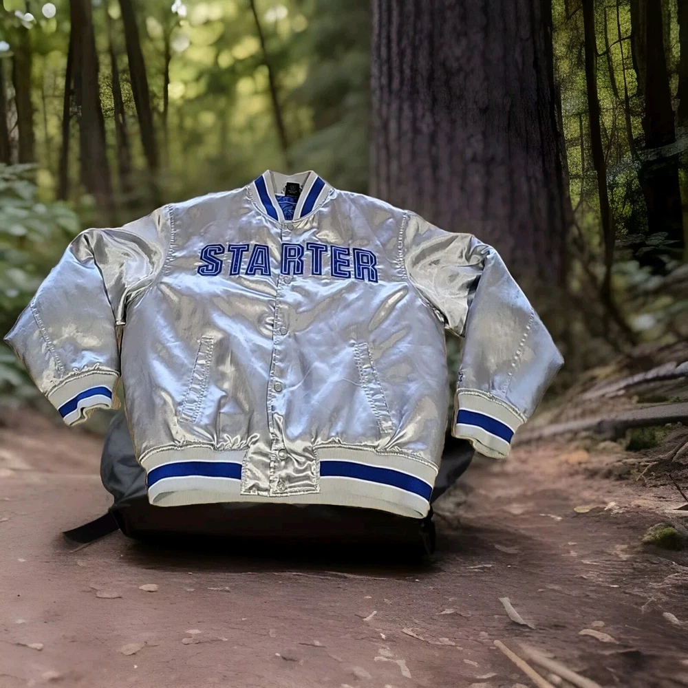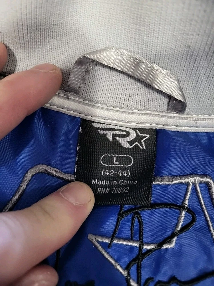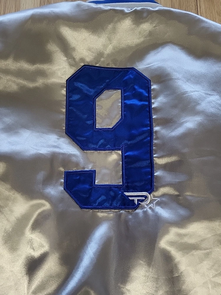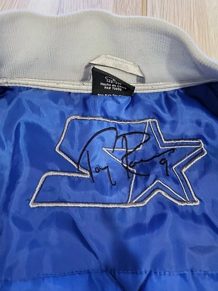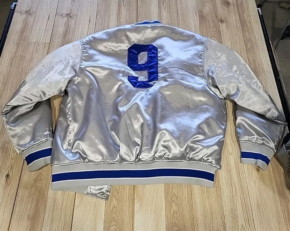 This vintage Starter jacket is a must-have for any Dallas Cowboys fan! Featuring Tony Romo's #9 on the back, this jacket is made of high-quality satin material and is a size large, with measurements of 42-44 X 26". The gray color gives it a classic and timeless look that can be worn for years to come. Perfect for any collector of vintage men's clothing, this jacket is sure to be a conversation starter. Rack