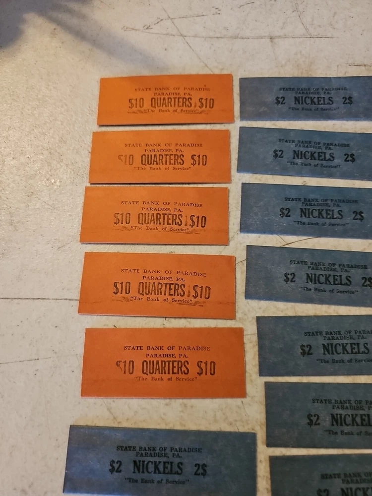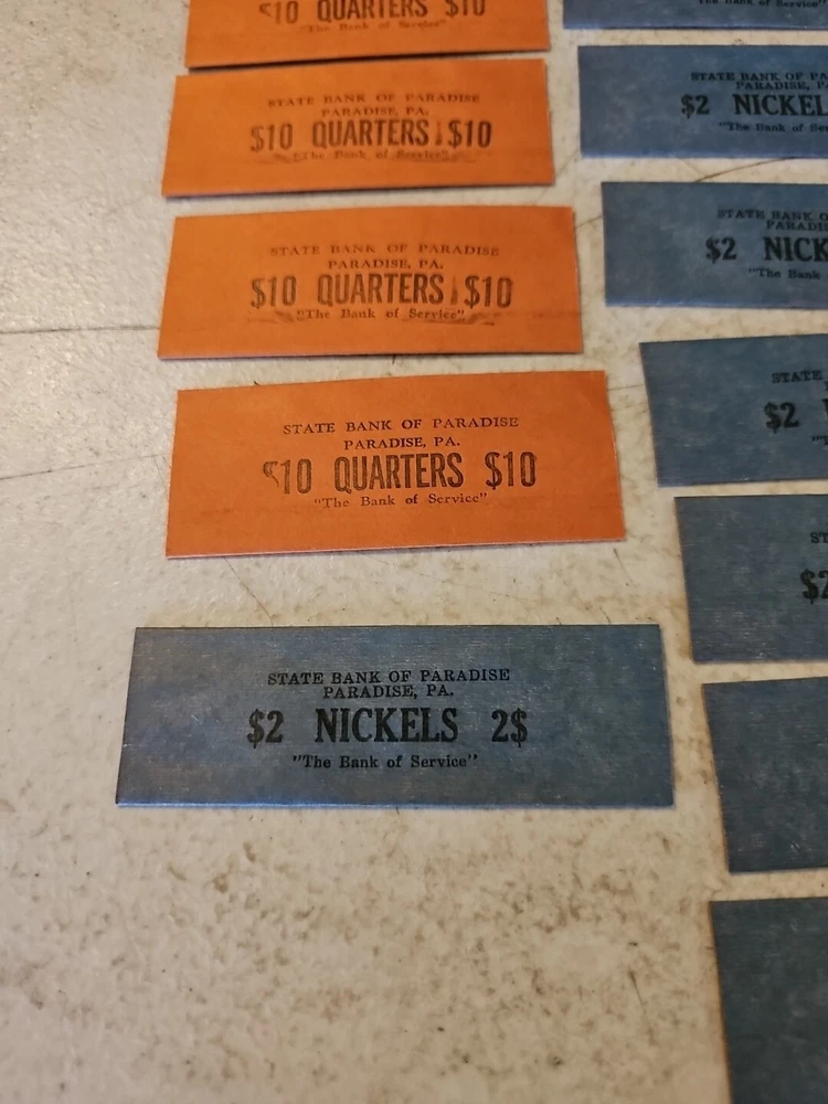 This lot of 20 coin wrappers from the Vintage State Bank of Paradise, Pennsylvania is a must-have for any collector of historical memorabilia. The wrappers feature the bank's logo and are a testament to its legacy. Made in the United States, these coin wrappers are a unique piece of American history. They are perfect for anyone interested in banking and insurance, or for anyone who appreciates vintage memorabilia. Add this lot to your collection today and own a piece of history.