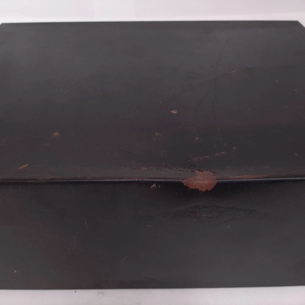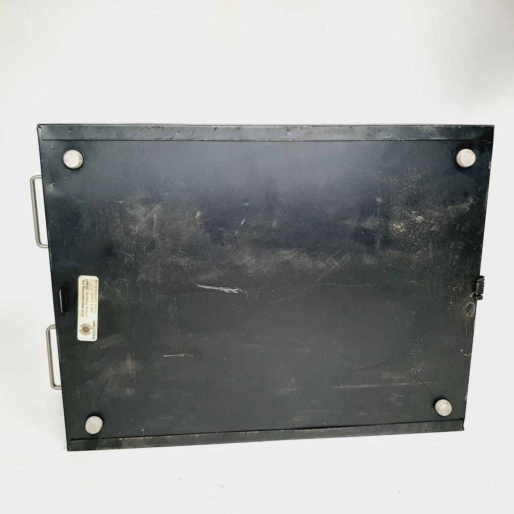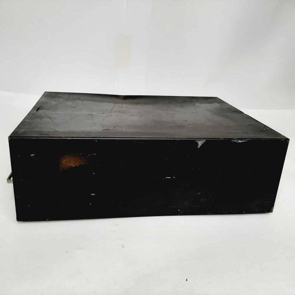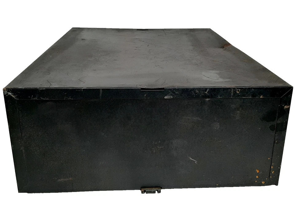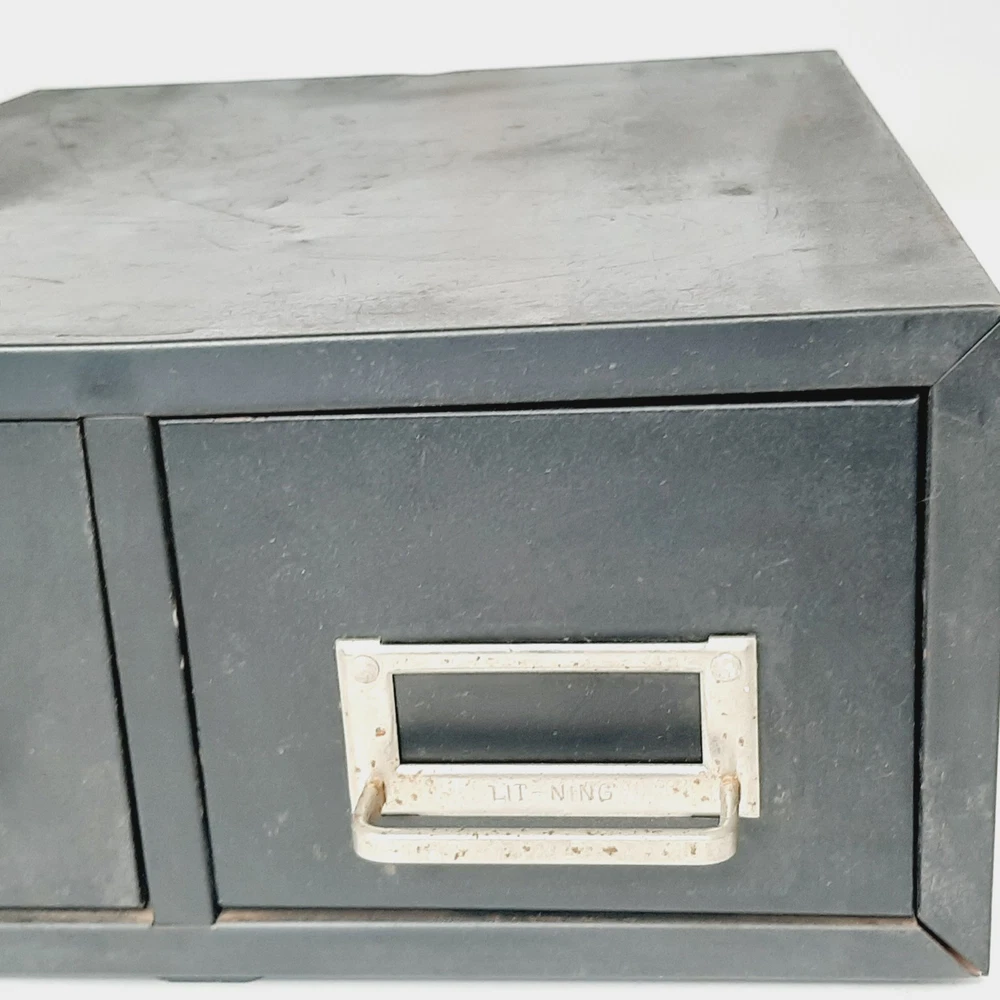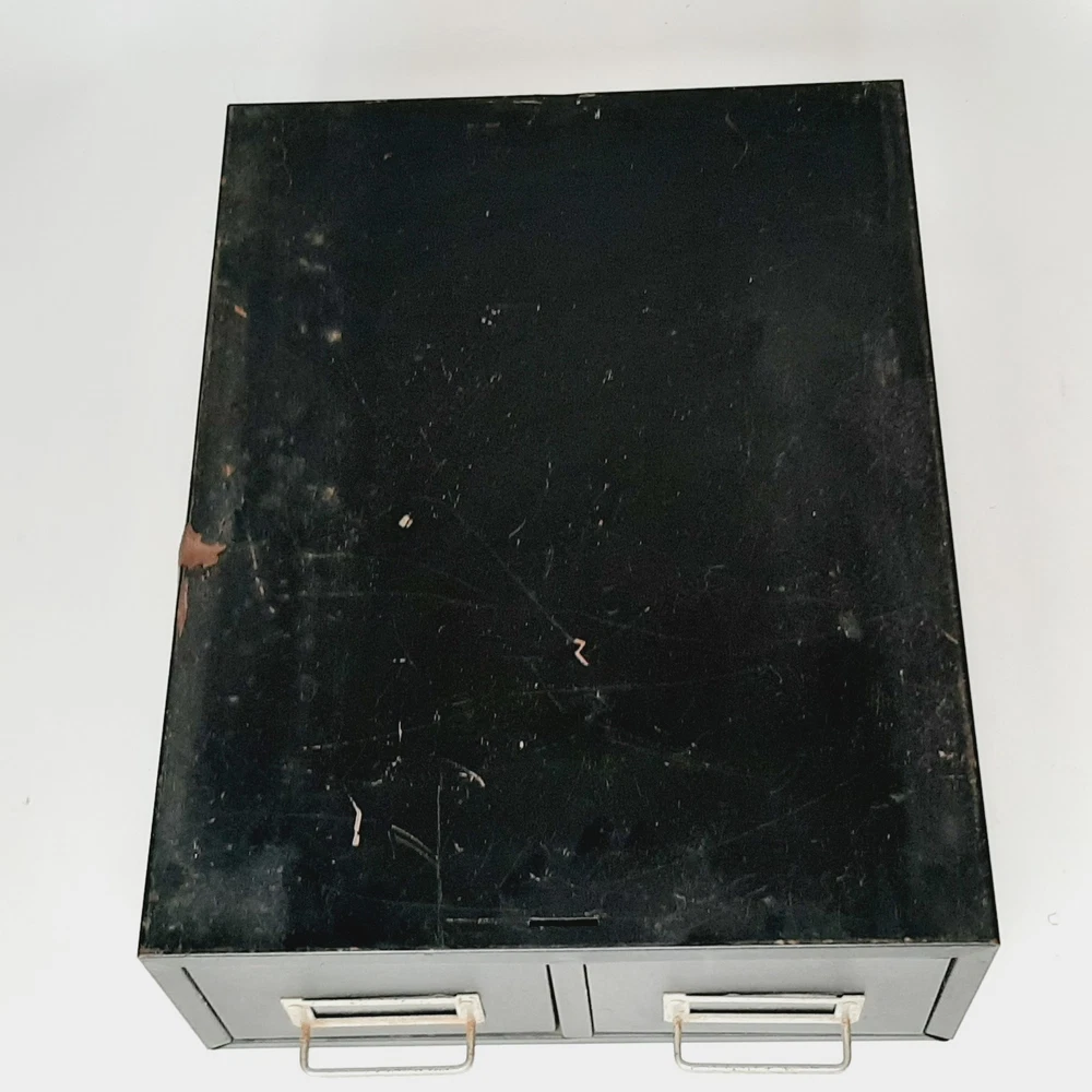 Vintage Steel 2 Drawer Library Card File Box Stackable Metal Parts Storage Black Measures approximately 16" long x 12.25" wide x 5.5" tall; each drawer is 16" long x 5" wide x 3" tall Rubber feet on the bottom protect surfaces Good condition with some denting and discoloration due to normal use; may be a little dusty from storage Two are available