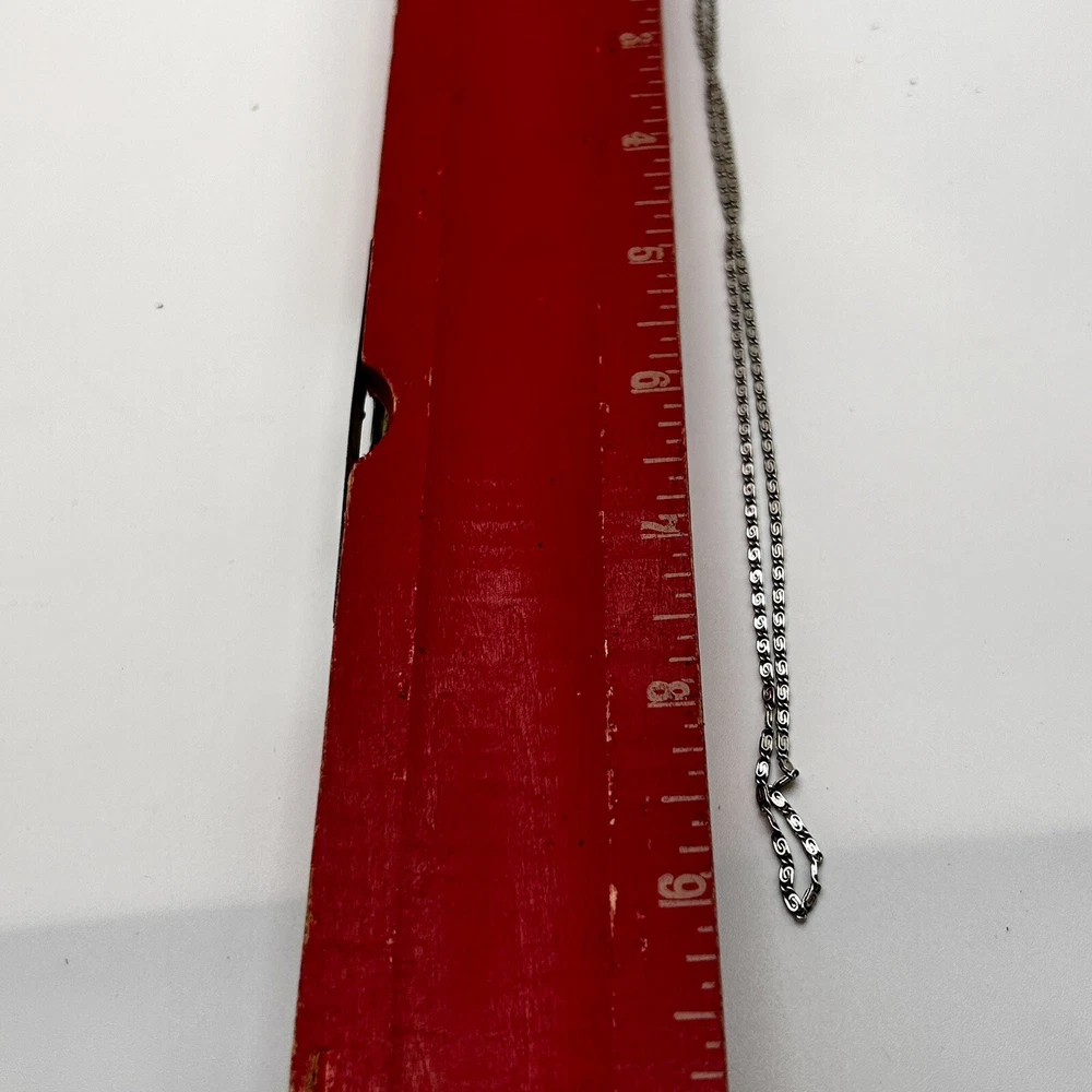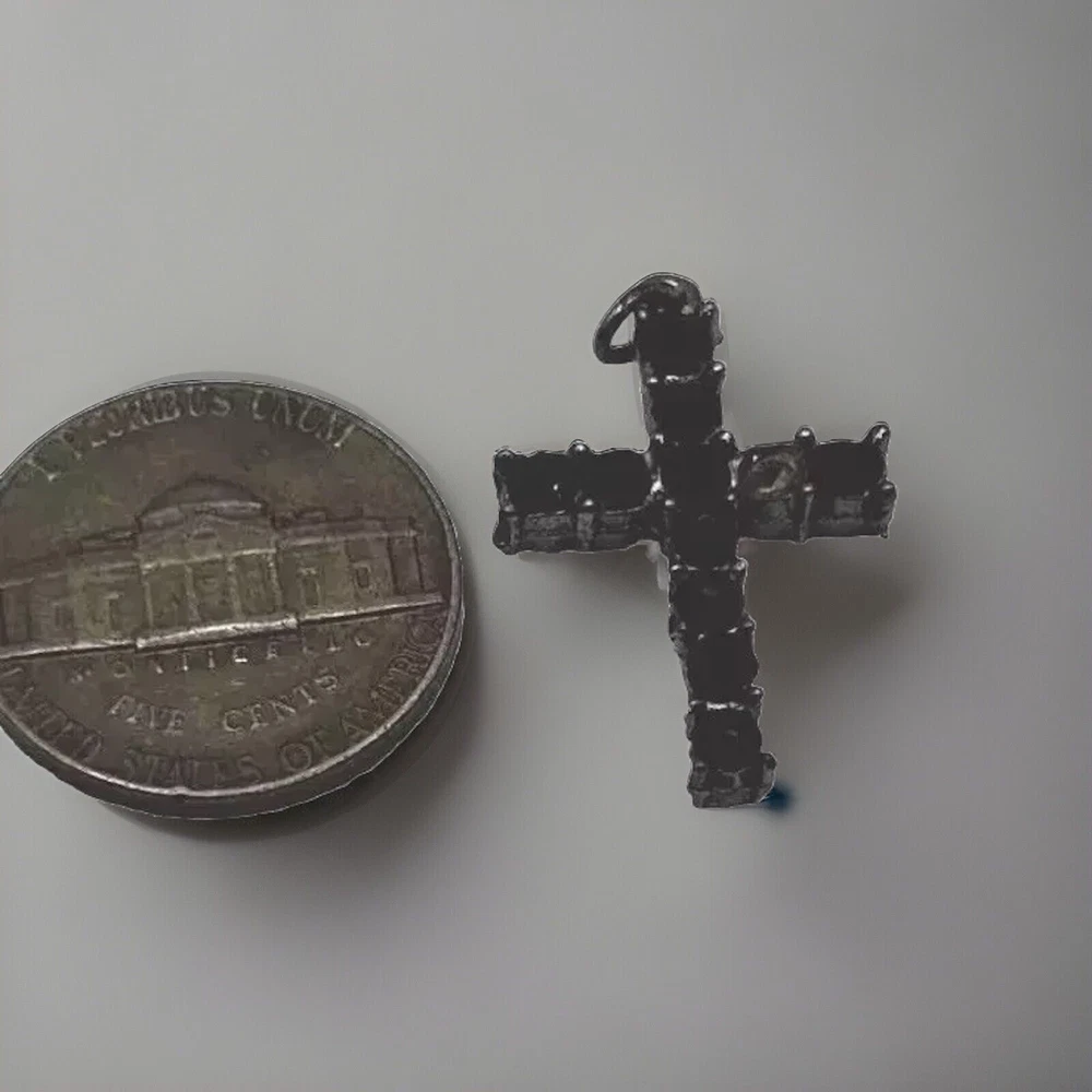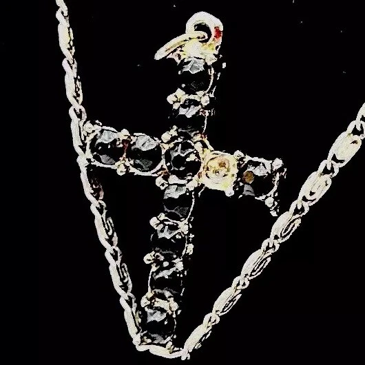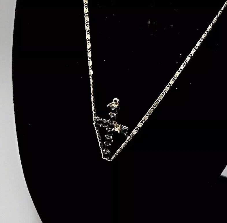 Please note that the crucifix is missing one black stone but it is not the star of the show. That belongs to the 18 inch hallmark sterling silver chain. It has a hallmark or makers mark that I have not been able to decipher. The hallmark and STERLING mark are on the ring clasp which makes it very difficult to photograph but please look at the photos for more information.