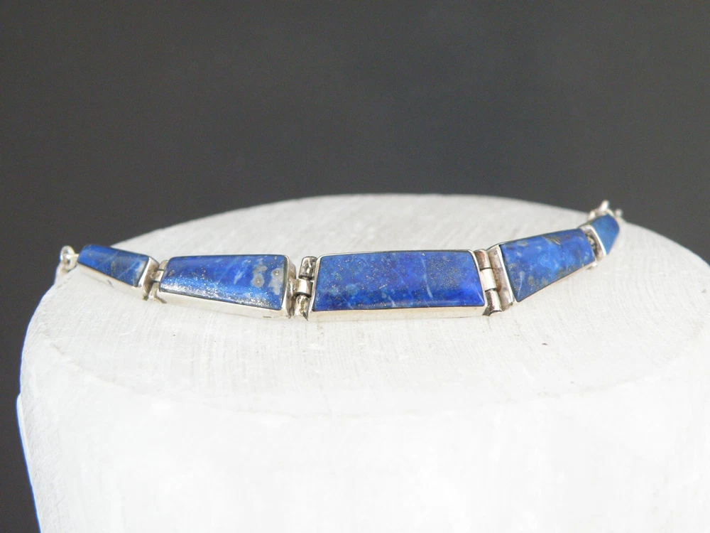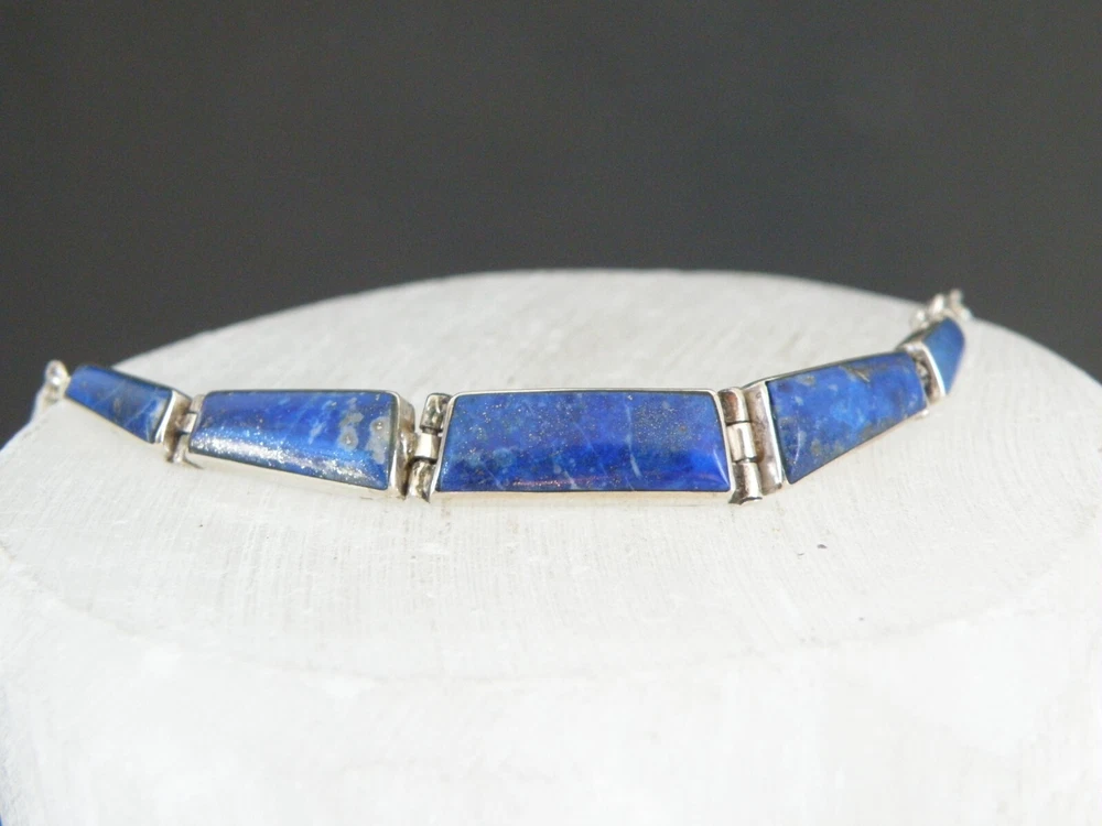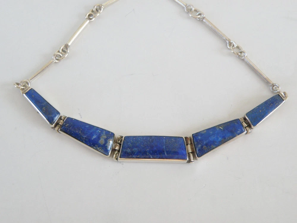 Find the key to accessory success in this statement making vintage sterling silver necklace. Beautiful natural lapis stones light up the center. This necklace appears all handmade. It is stunning. It is in good vintage condition with normal wear. No missing or damaged stones. May need to be polished. WEIGHT: 9.5 grams MEASURES APPROX: 18" long end to end x .35" widest in the center The center is approx. 3" long Center stone is approx. 8mm x 19mm Signed 925 for sterling silver is marked on the hook clasp and the back of the necklace