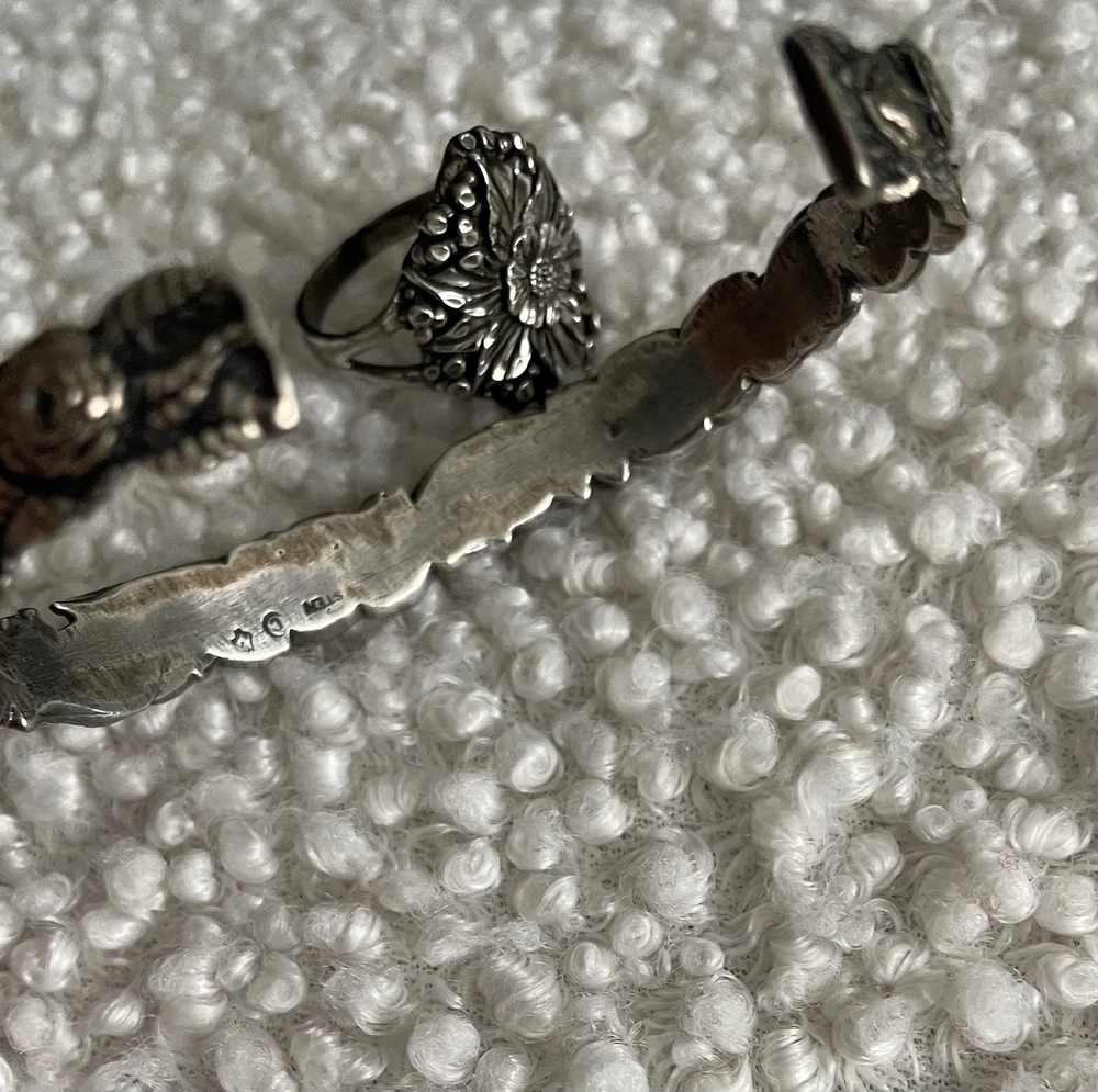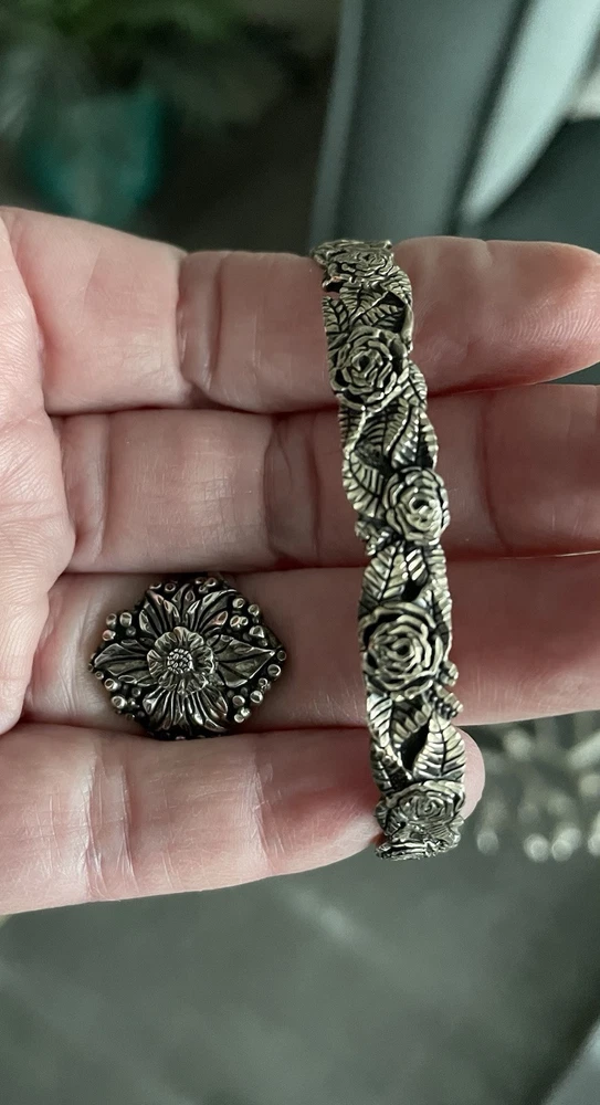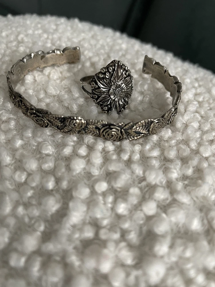 This vintage set includes a sterling silver and cuff bracelet and ring featuring marcasite rose cut design. Both pieces are handmade and stamped sterling STER with a C inside the bracelet. The bracelet is a slide-on with an 1.5” opening. Approximately 7.5 inch if flat. The matching ring is about a size 7-7.5. They have a Victorian vibe. Dainty and beautiful. Excellent vintage condition purchased in the 90’s.