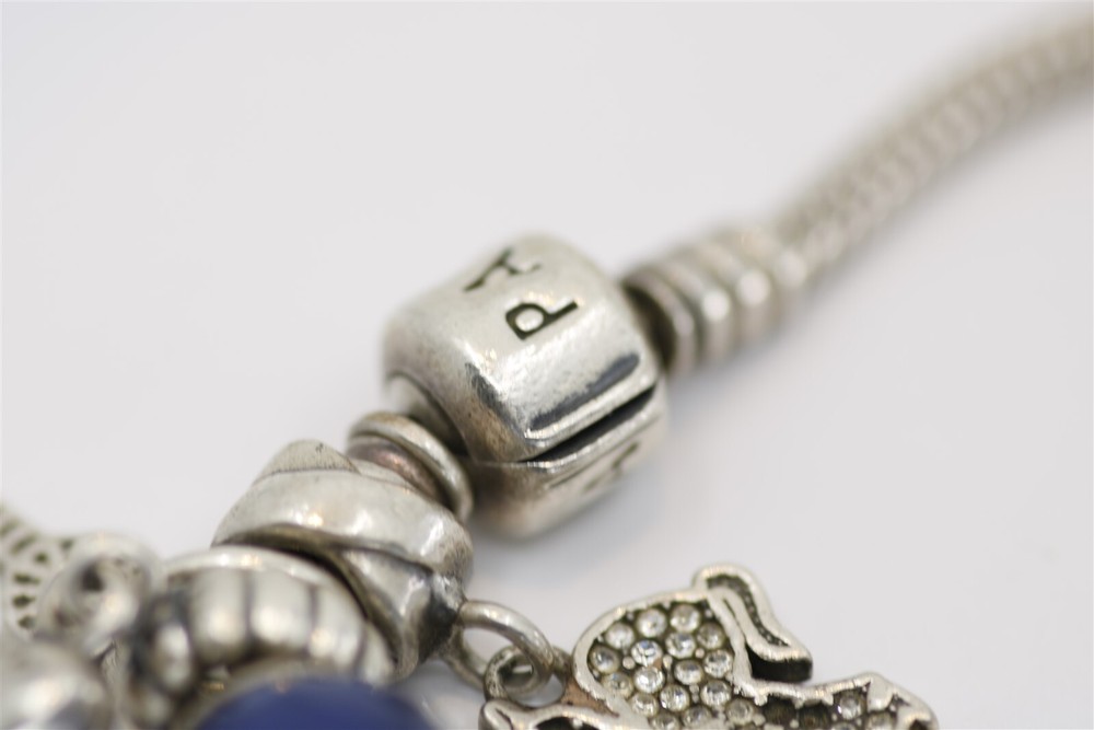 Vintage sterling silver Pandora charm bracelet with fourteen charms. Standard Pandora clasp. Stamped 925 (Sterling Silver). 7.5" long. 55.3 grams. NG01235 Item As Is. All stones not identified unless clarified above. All items are pre-owned and pre-loved. Stones may show minor nicks and abrasions or small signs of wear. Diamonds are graded using GIA standards by GIA Graduates. Diamond and gemstone weight is estimated by formula. The metal is stamped or identified by acid testing and/or XRF alloy analyzer gun. All items shipped USPS First Class, Signature Required Items over $1000 ship overnight, Signature Required Please message with any questions. We are available Monday through Saturday 10am to 6pm. Powered by SixBit's eCommerce Solution