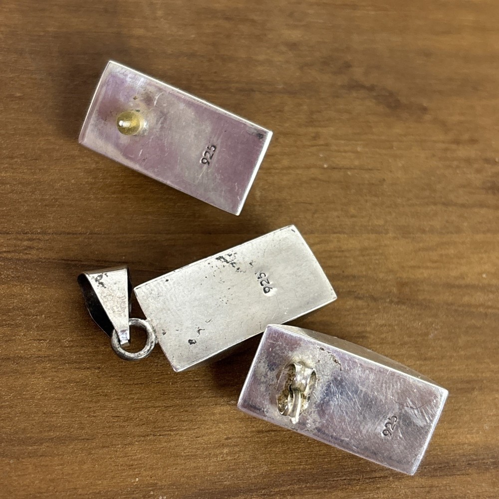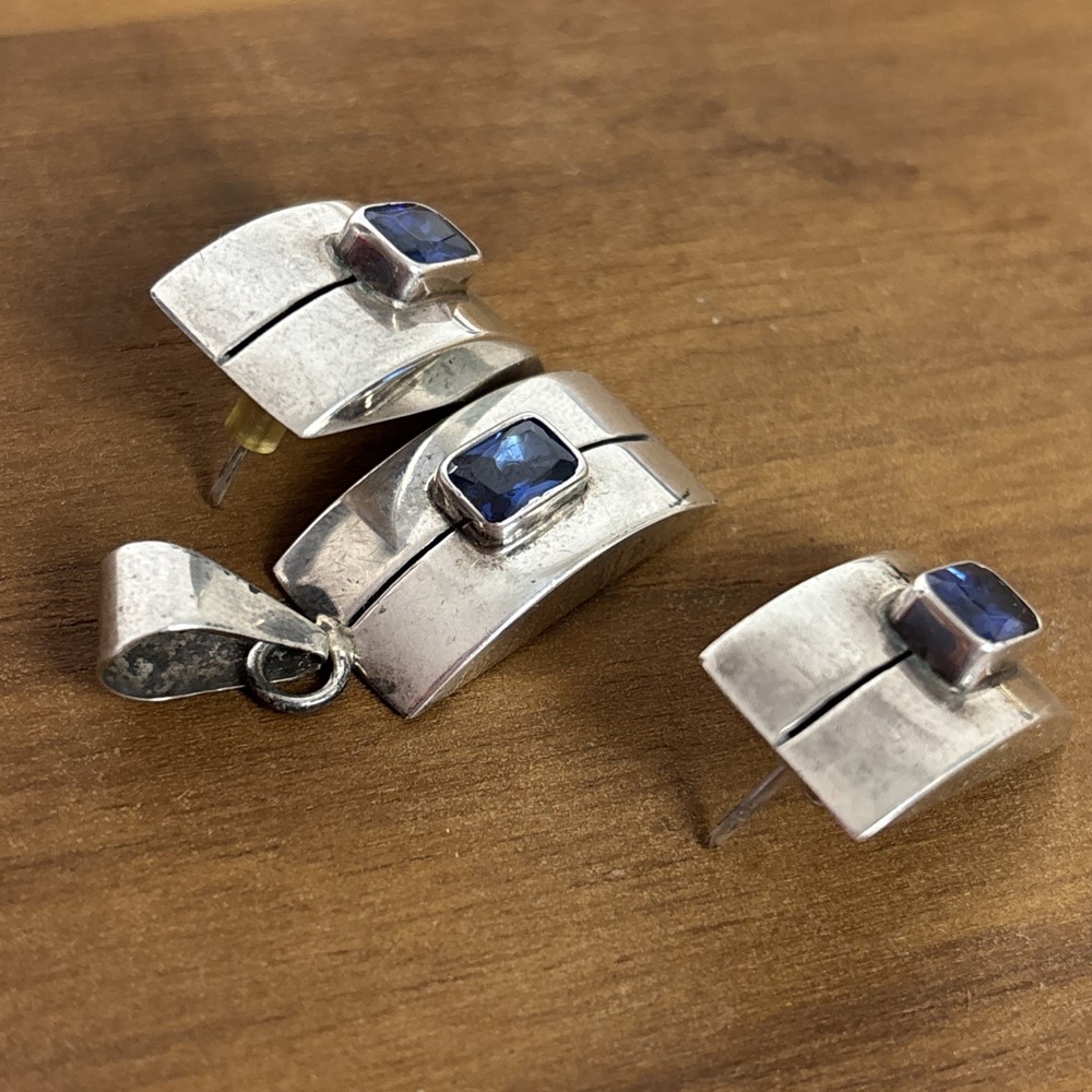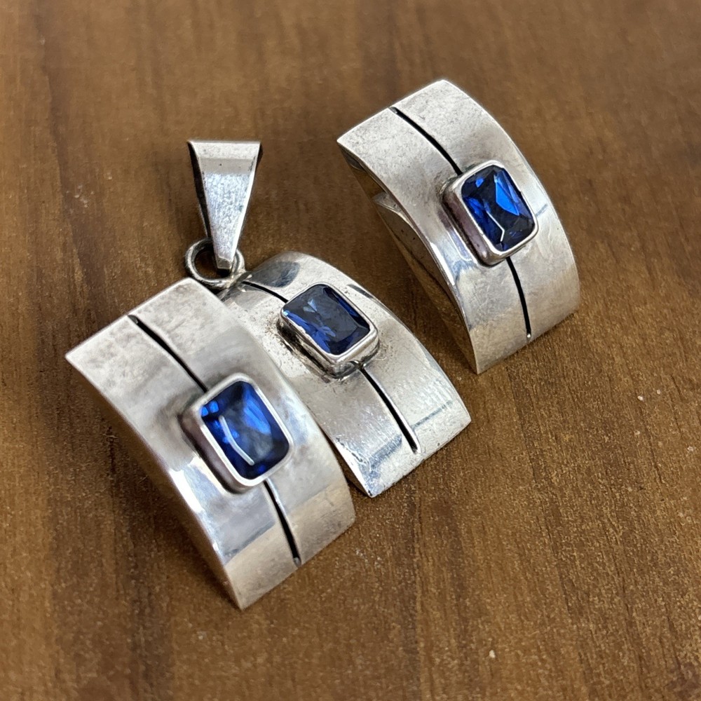 This vintage sterling silver pendant and earring set features a stunning sapphire stone as the main focal point. The pendant, in a statement style, is intricately designed with a traditional sterling silver setting, adding a touch of elegance and sophistication to any outfit. The set is perfect for those who appreciate unique, timeless pieces that showcase a beautiful blue sapphire stone in a classic yet stylish design. Includes 3 pcs sterling with blue stone unbranded, needs cleaning, missing backing on one earring