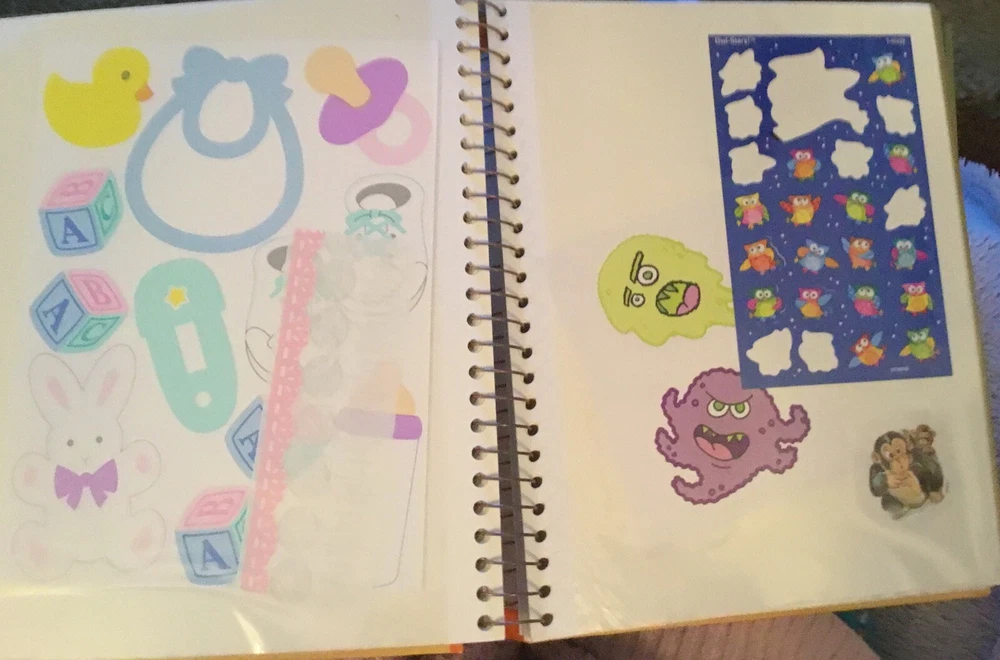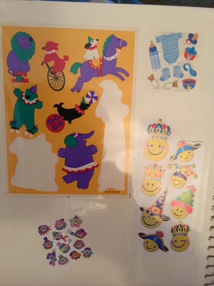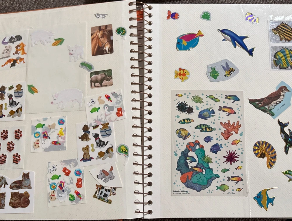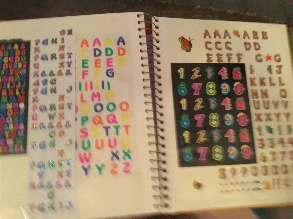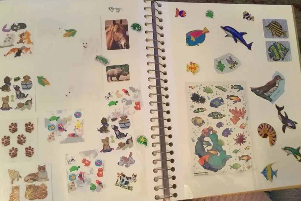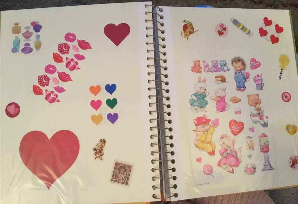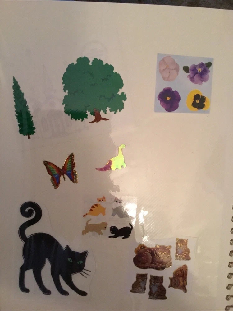 Vintage Sticker Book Album featuring designs from the 80s, 90s, and 2000s by popular brands like Sandylion, Hallmark, AGC, and Mrs Grossmans. This multi-color sticker book is perfect for adding a touch of nostalgia to your scrapbooking projects. Dive into a world of history-themed stickers with this charming collection, ideal for any craft enthusiast. Perfect for adding a retro flair to your creative projects, this sticker book is a must-have for any scrapbooking aficionado. This book has 40 pages and 38 of them contain stickers with their original backing (with the exception of the inside cover where the backing of the stickers was removed). Please see all the photos.