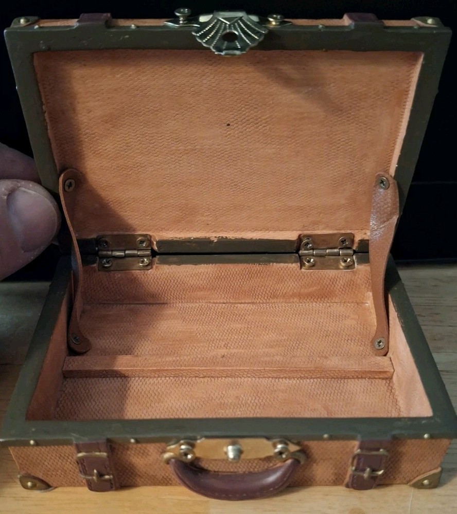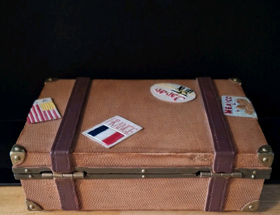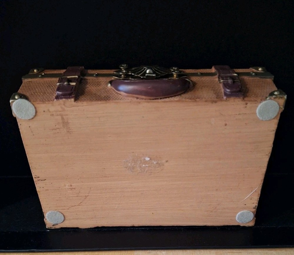This small bezel box ,item appears to be a miniature suitcase with dimensions of 3 1/2 inches in length, 2 3/4 inches in width, and 34 inches in height. It features boxing as its subject and is perfect for collectors of decorative items.