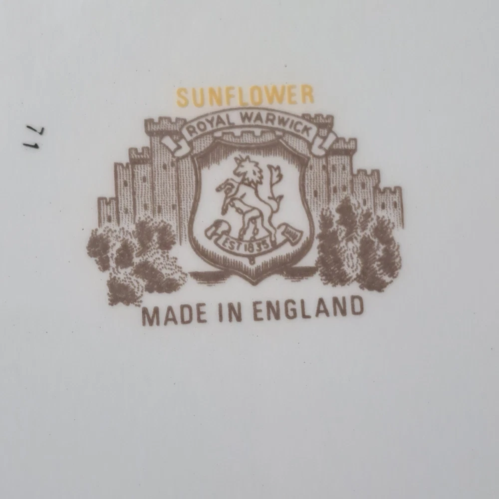 This beautiful set of four vintage Royal Warwick dinner plates features a stunning sunflower pattern on a round porcelain plate. Made in England in the late 20th century, these plates are perfect for any occasion, and add a touch of vintage charm to your table setting. Measuring 10 inches in diameter, these plates are ideal for serving your favorite meals. Hand wash only to preserve the vintage character..