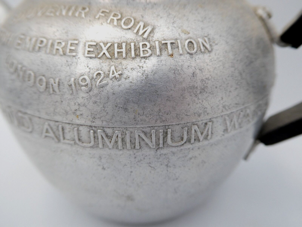 SMALL SWAN BRAND ALUMINIUM TEAPOT BRITISH EMPIRE EXHIBITION LONDON 1924 SOUVENIR GOOD USED CONDITION - CRACK LINE IN THE HANDLE - DENTS TO THE LID - ROUGH END TO SPOUT GENERAL WEAR 16 CM SPOUT TO HANDLE SEE PHOTOS FOR BEST GUIDE I AM LISTING SOME OTHER PIECES I can combine for postage. CHECK MY OTHER LISTINGS FOR MORE