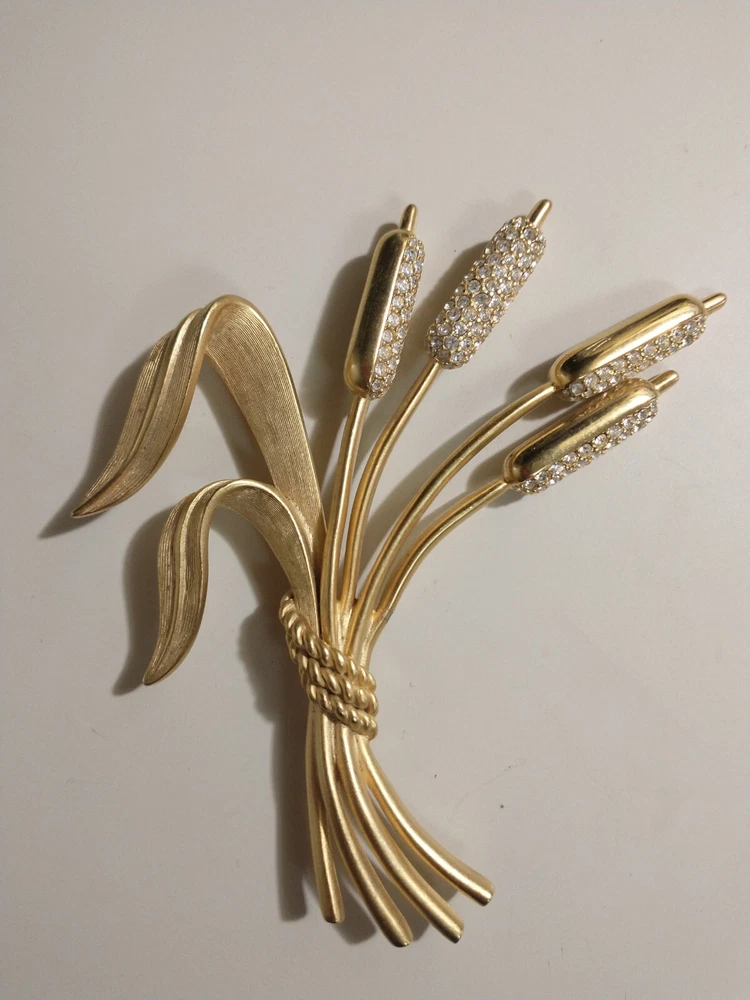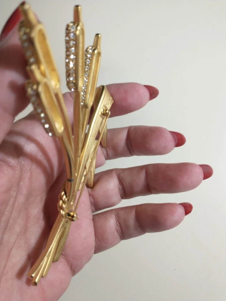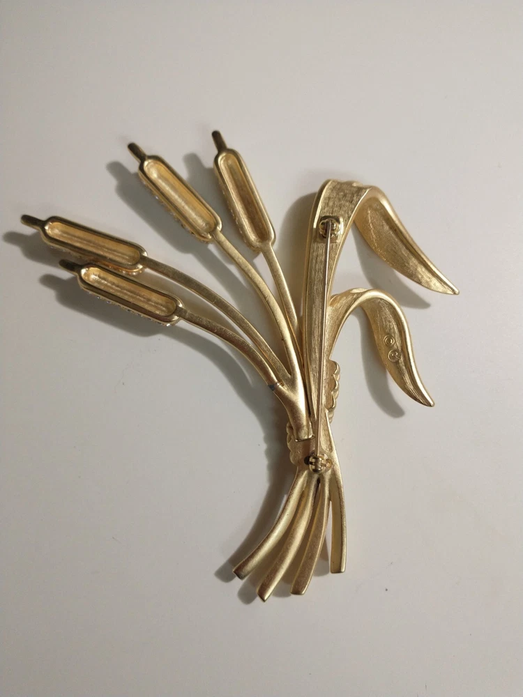 Please see images for size and condition description. Beautiful Swarovski brushed gold-plated matte cattail brooch w sparkling clear crystals. No loose or missing stones. No verdigris. Pin clasp is in good working order. Swan logo present. Definitely a statement piece that is 4 inches long. As is. Thanks! FREE SHIPPING!