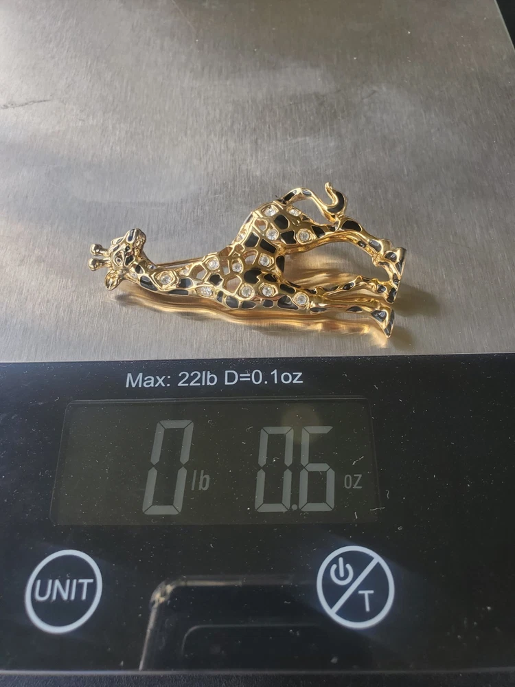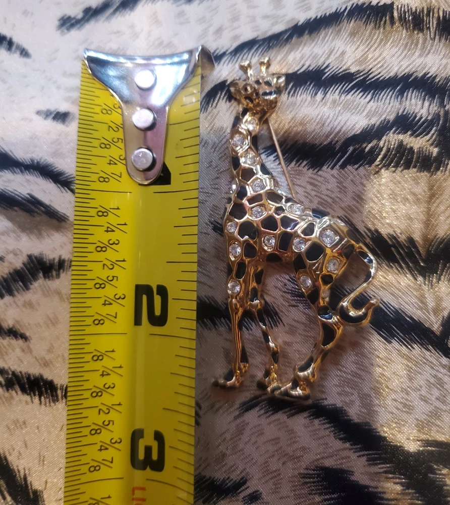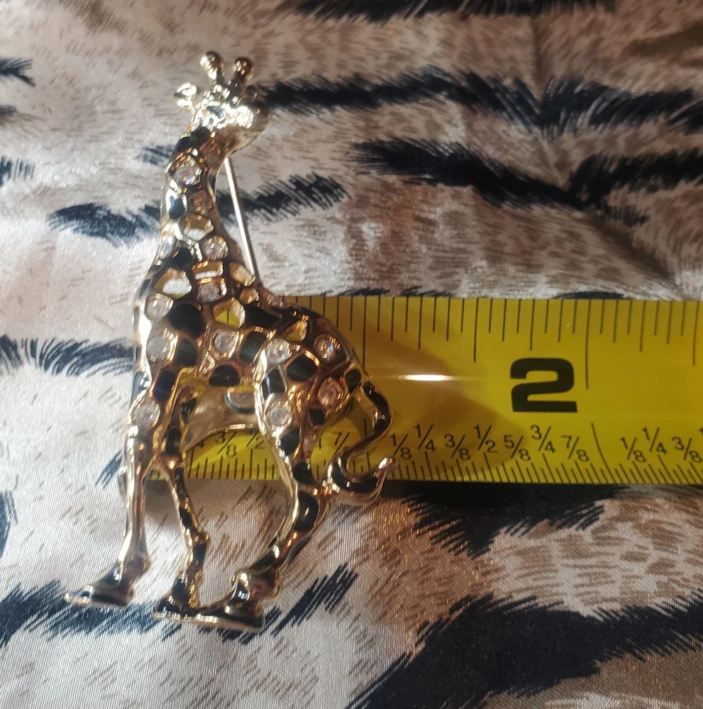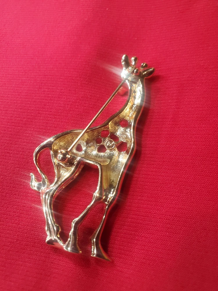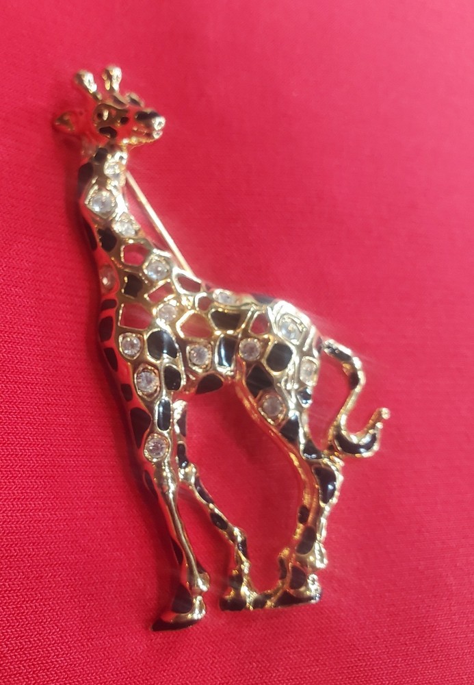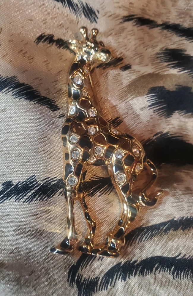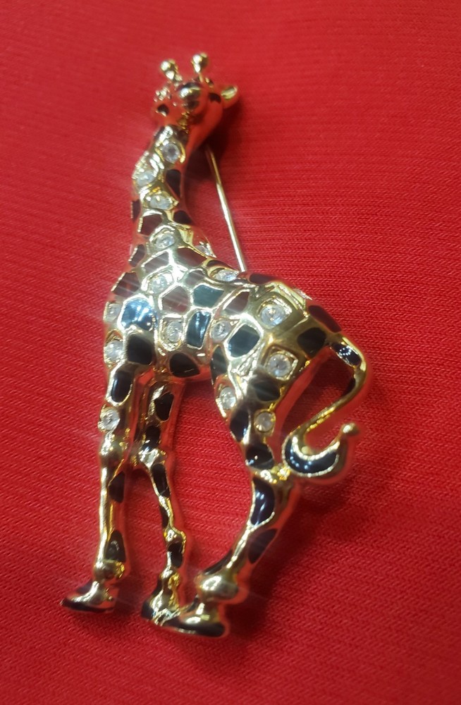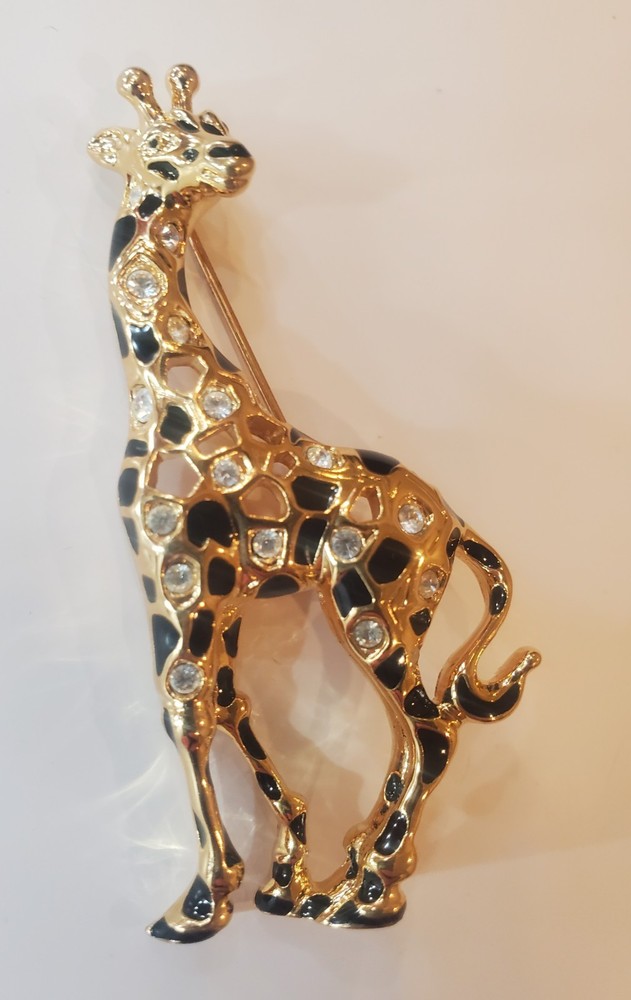 Vintage 1990's Swarovski Giraffe Brooch. Swan signed. This model is retired/no longer in production and is therefore becoming increasingly rare. Gold Plated adorned with black enamel spots and the shiny crystals Swarovski is so famous for. The brooch is preowned in great condition with no signs of wear, no crystals missing and with closure in like new condition.