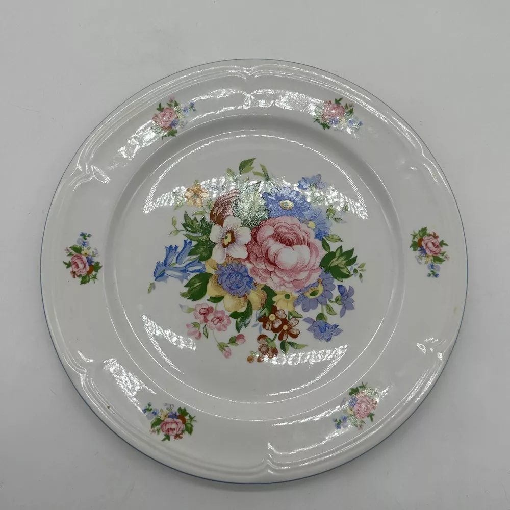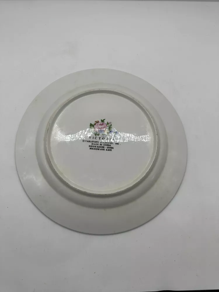 This vintage chop plate from Tabletops Unlimited features a beautiful ivory color with pink roses, making it an eclectic addition to any dinnerware collection. The round shape and scalloped edges add a touch of elegance, while the stoneware material ensures durability for everyday use. The plate set is a contemporary original production style of art pottery, with a printed backstamp and no handmade details. It is perfect for all occasions and is a great addition to any table setting. This product line is called Victoria, and it was manufactured in China during the 1990s. The set includes chop plates, and it is a great addition to any collection of decorative cookware, dinnerware, and serveware.