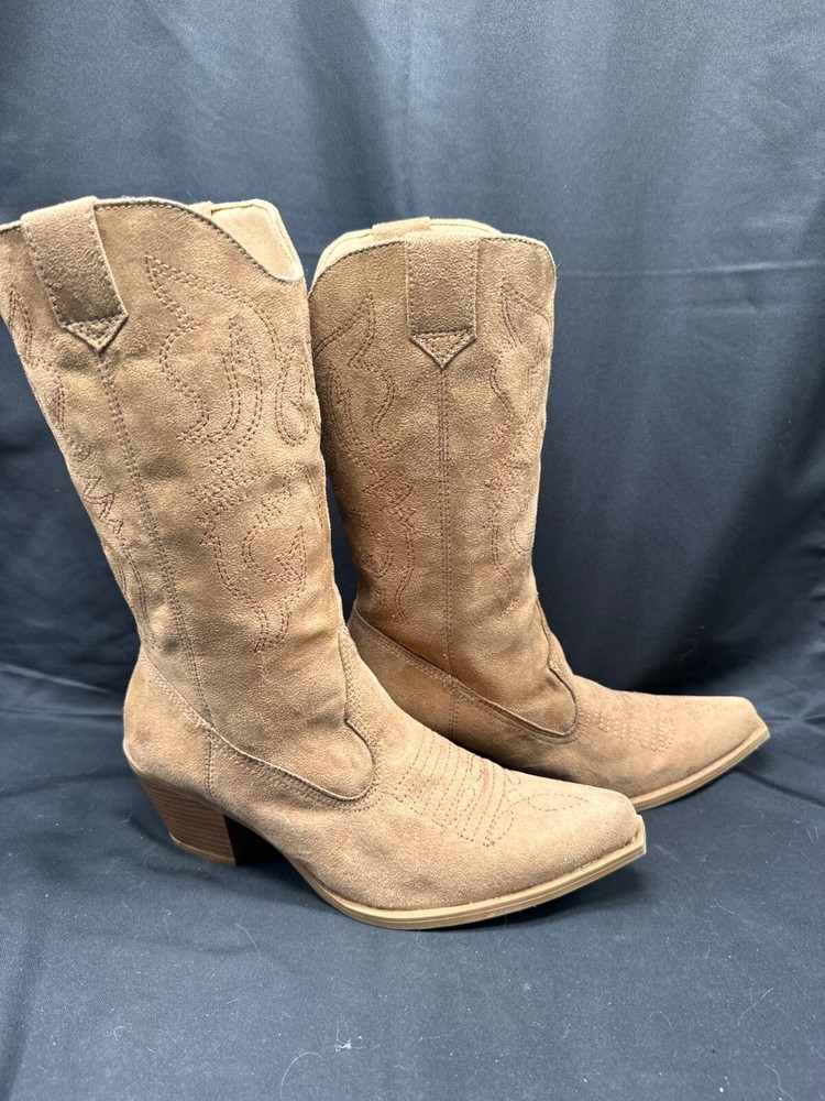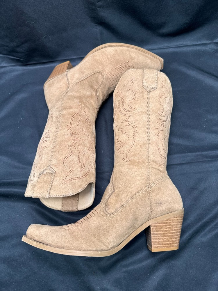 Vintage Splash Tan Western Faux Suede Heeled Cowgirl Boots Size 5 Step out in style with these vintage Splash cowgirl boots in a beautiful tan color. Made with high-quality faux suede, these boots are perfect for any Western-themed event or casual day out. With a comfortable heel and size 5 fit, they are designed for women who want to look and feel great. The boots feature a classic Western style and are perfect for pairing with any cowgirl outfit or jeans. Get ready to ride the range in style with these stunning Splash boots.