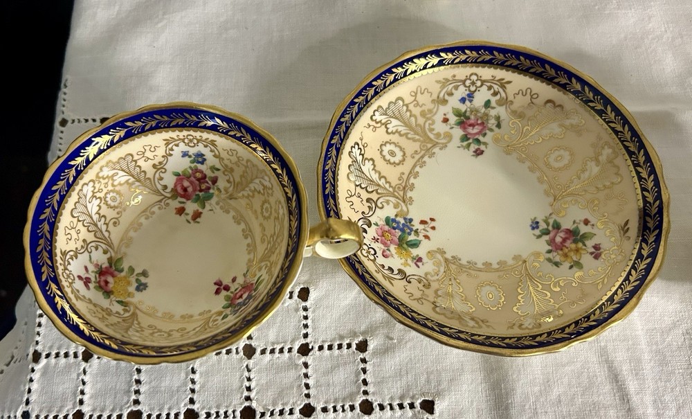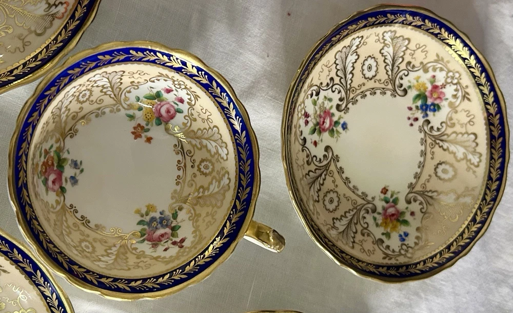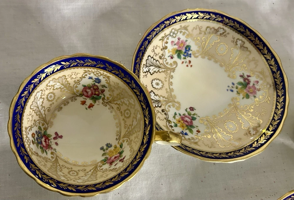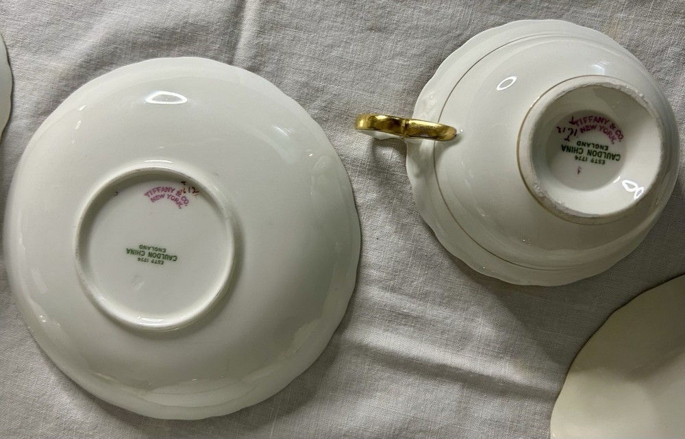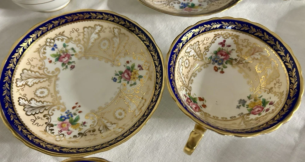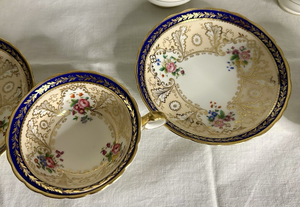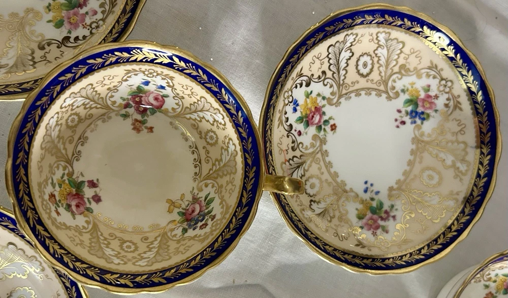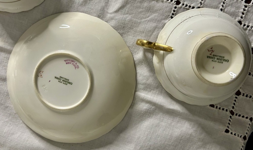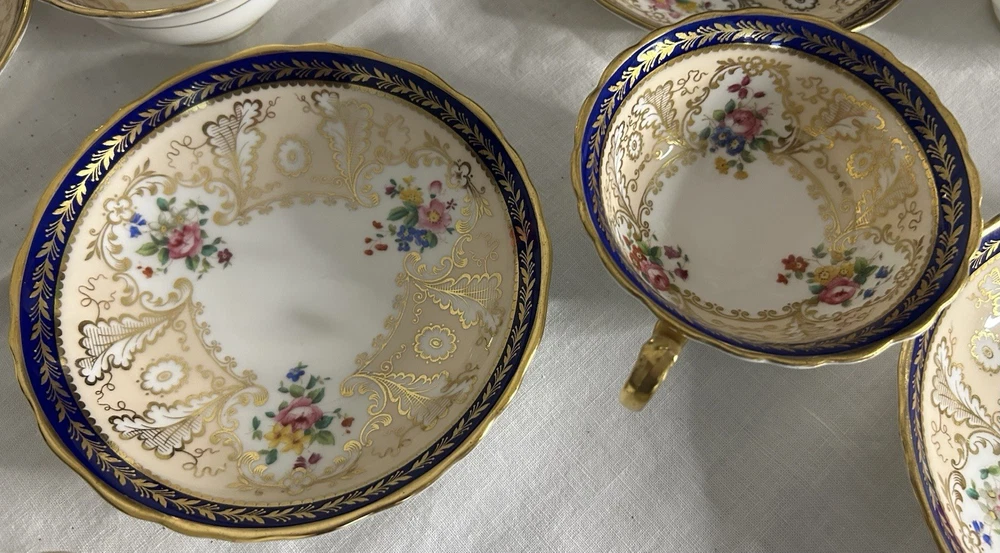 This is a Cauldon Tiffany China Pattern T-1612 gilt, cobalt, and floral teacup and saucer set. There are 10 sets. The pattern, which does not have a specific name, is a copy of a Cauldon design from 1810. It features a narrow gilt and cobalt outer laurel leaf border with a broad beige ground inner border, decorated with gilt and white oak leaves and flower heads. The cup measures approximately 4 inches across the top by 2 inches tall, and the saucer is approximately 6 inches in diameter. These were previously owned and are in excellent condition. There may be very minor signs of wear consistent with age and use. There are no chips, cracks, scratches or fading, as far as I can see. I’m not an expert so please look at the photos carefully before you purchase. But these beautiful pieces appear to be in excellent shape. Props used in the main photo are not included with these items. No international shipping.