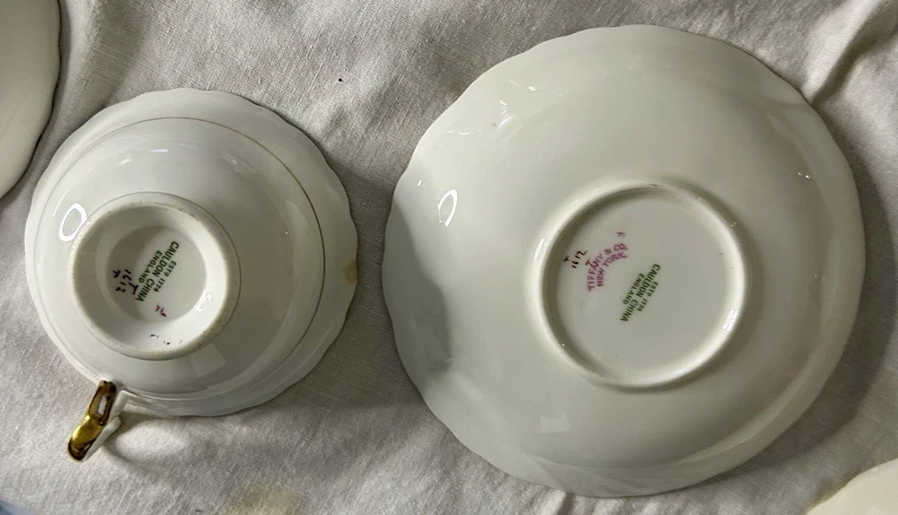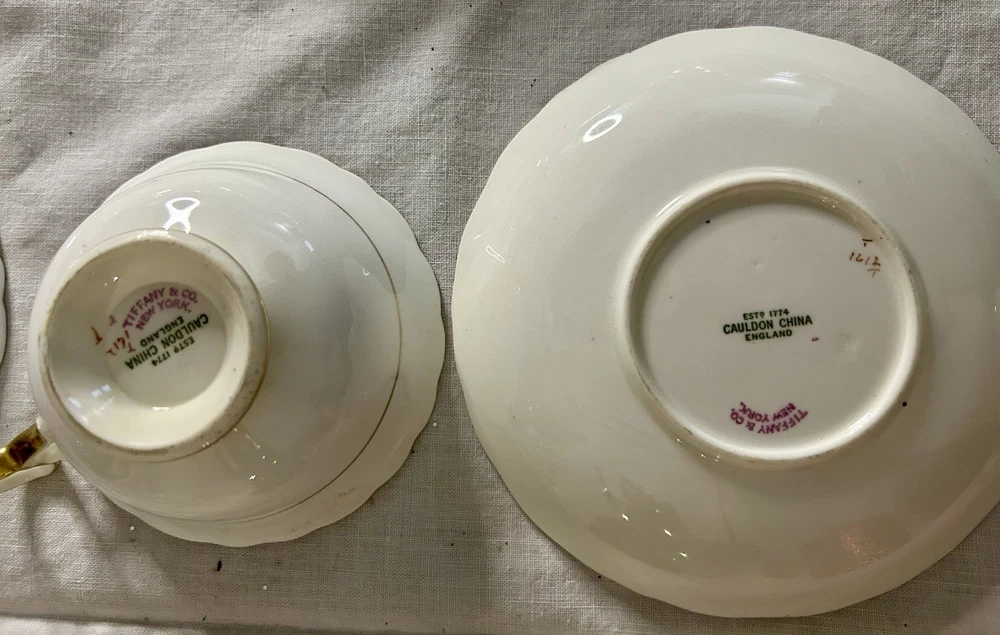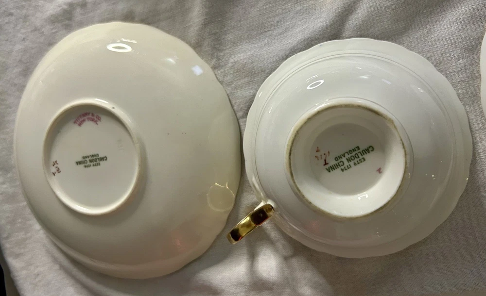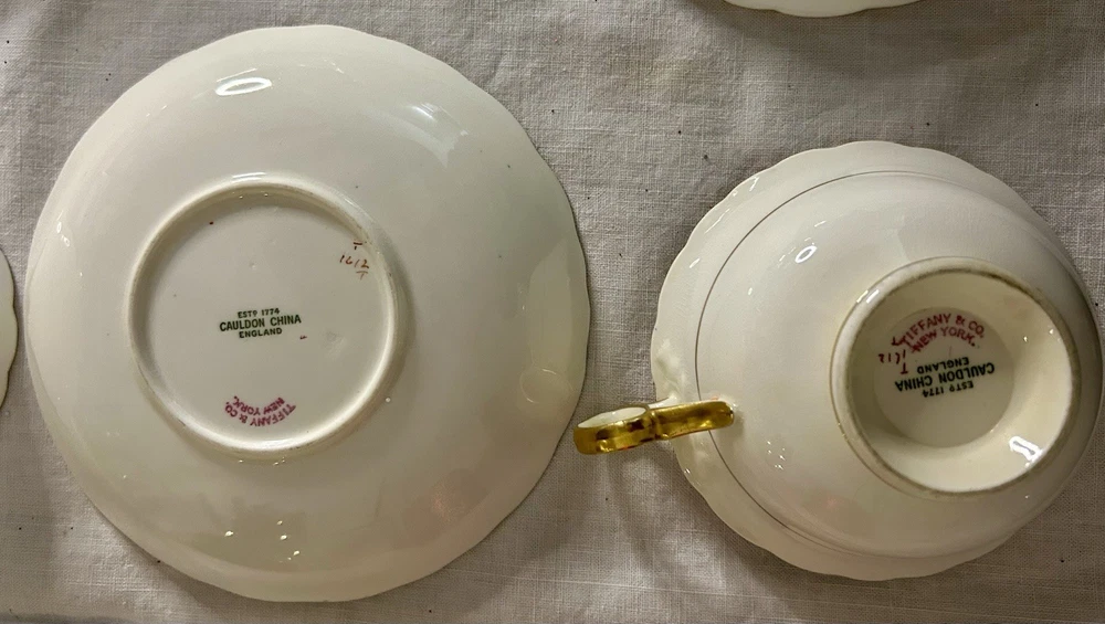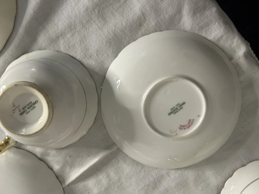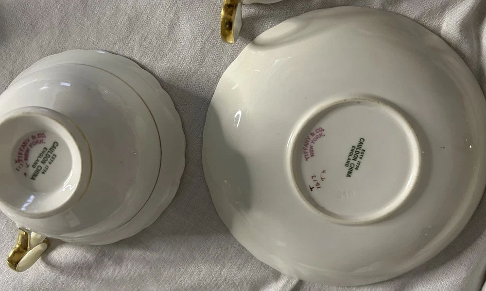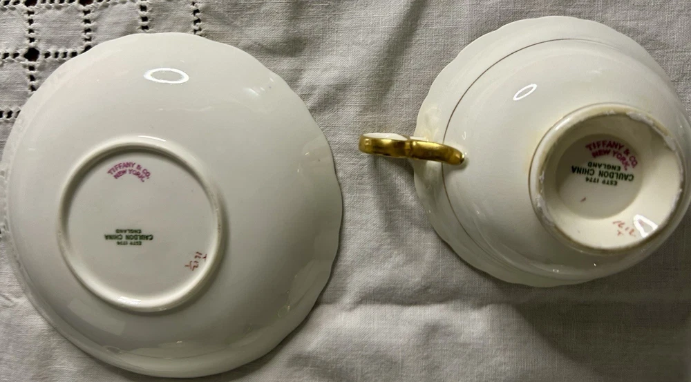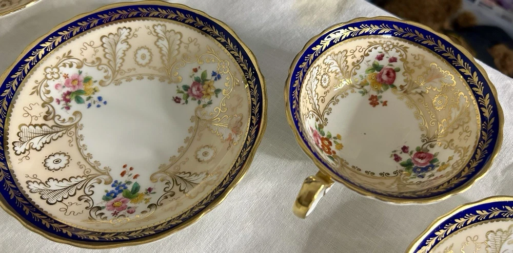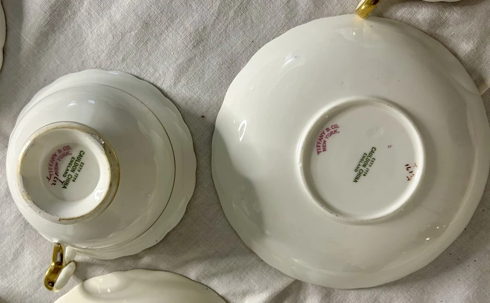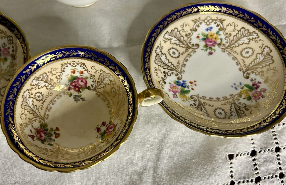 This is a Cauldon Tiffany China Pattern T-1612 gilt, cobalt, and floral teacup and saucer set. There are 10 sets. The pattern, which does not have a specific name, is a copy of a Cauldon design from 1810. It features a narrow gilt and cobalt outer laurel leaf border with a broad beige ground inner border, decorated with gilt and white oak leaves and flower heads. The cup measures approximately 4 inches across the top by 2 inches tall, and the saucer is approximately 6 inches in diameter. These were previously owned and are in excellent condition. There may be very minor signs of wear consistent with age and use. There are no chips, cracks, scratches or fading, as far as I can see. I’m not an expert so please look at the photos carefully before you purchase. But these beautiful pieces appear to be in excellent shape. Props used in the main photo are not included with these items. No international shipping.